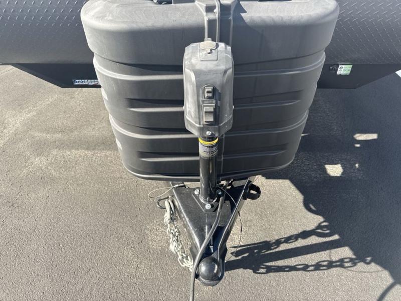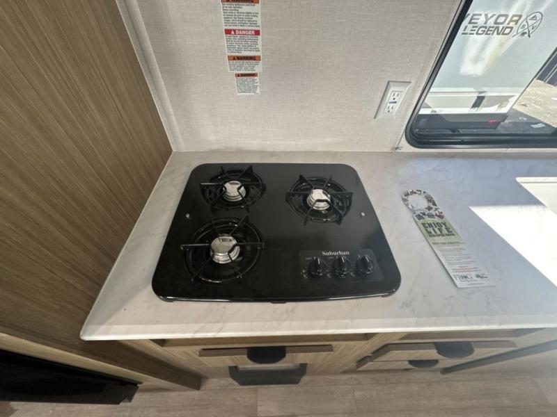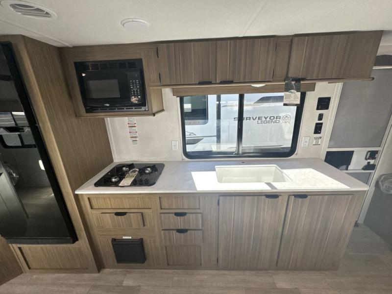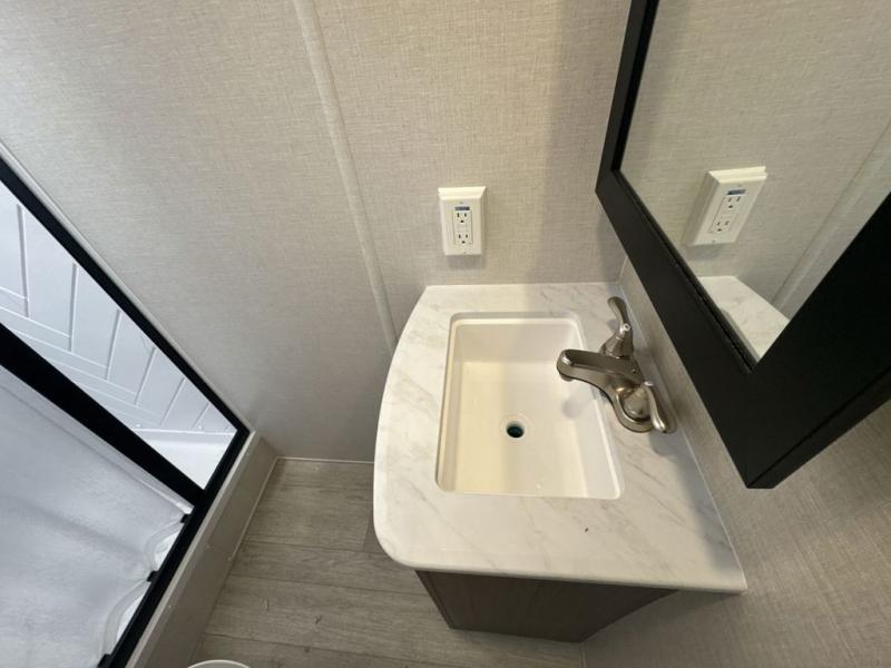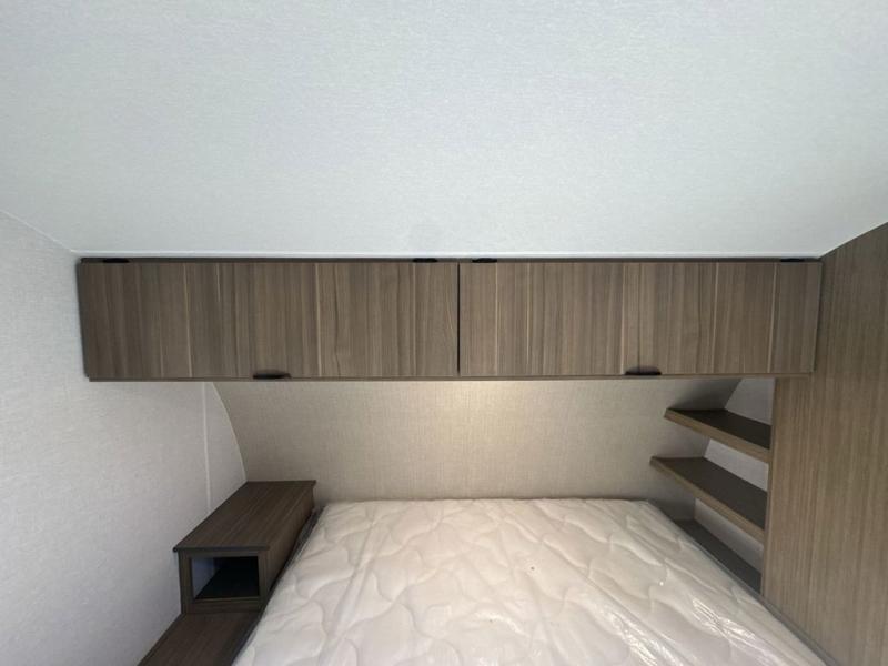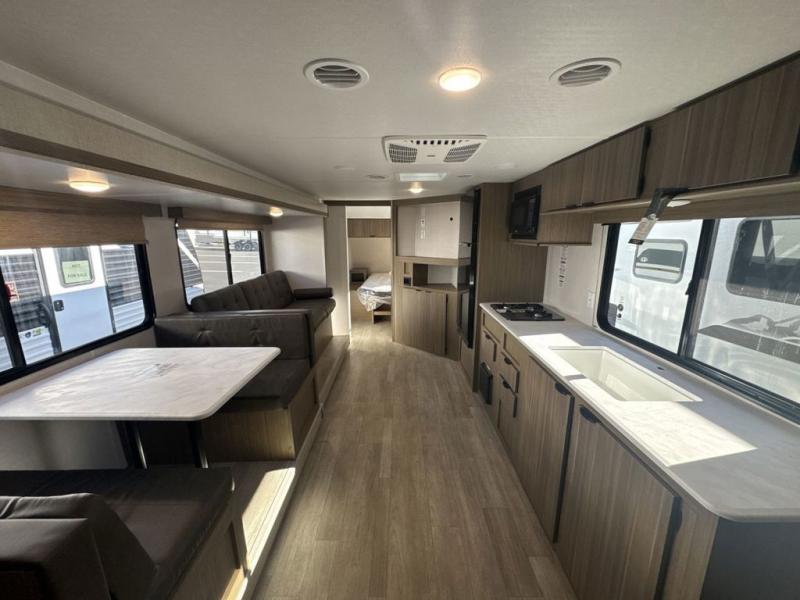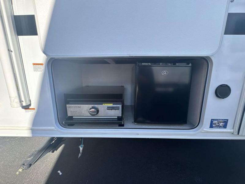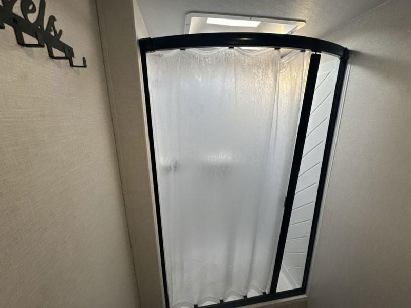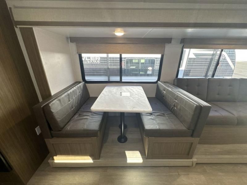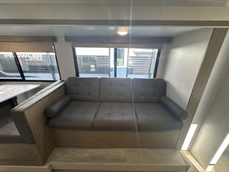 This is a trailer your whole crew will love! There are double-size bunks with a ladder that will be perfect for the kids or your guests, and the full bath is close by for easy nighttime use. The main living area is spacious thanks to the large slide out, and here you'll find the sofa and booth dinette. After you've worked up an appetite, you can prepare lunch on the three burner cooktop or use the microwave oven. There is ample counter space to lay out fresh veggies, chips, and drinks, or you might just set up outdoors since there is an exterior camp kitchen! The front private bedroom includes an RV king bed with dual wardrobes, a closet with shelves, plus a hamper to keep your space tidy.