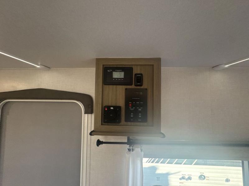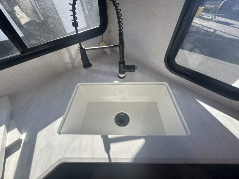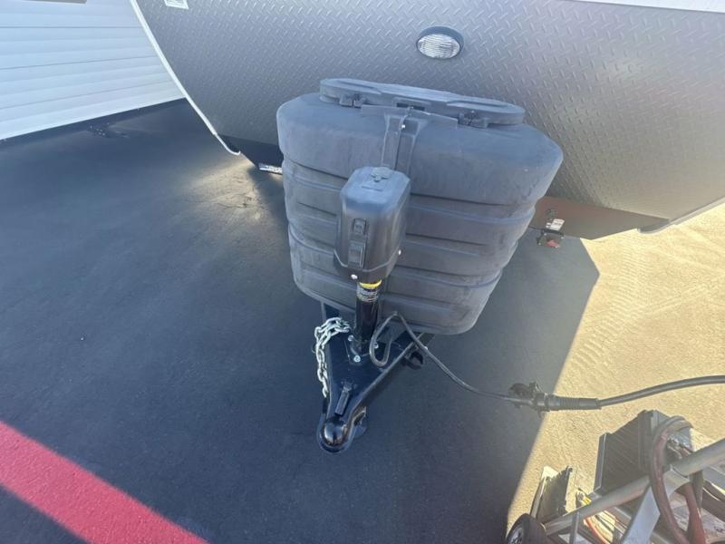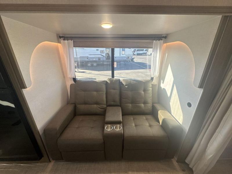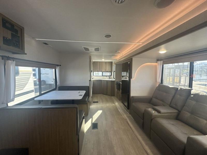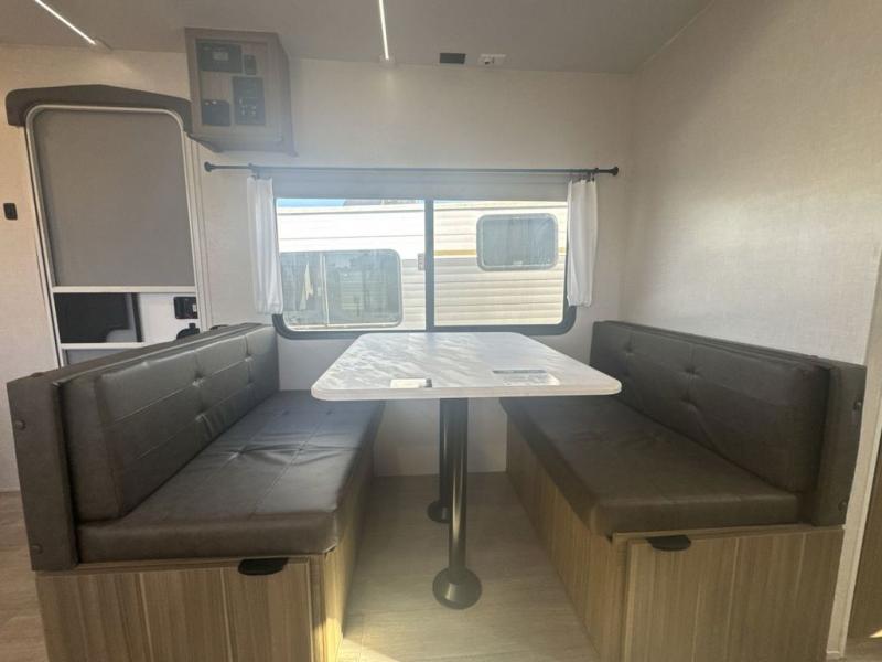 Time spent at the campground in this travel trailer will be time well spent! Once you arrive, you can put out the patio awning, then grab your camp chairs from the pass-through storage. There is also an exterior camp kitchen where you can make lunch for your crew. The large slide out in the main living area will make your space more open, and the theater seating here will be the perfect place to relax in the evenings. There is also a booth dinette where you can dine together and play board games at!