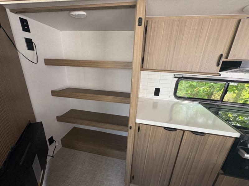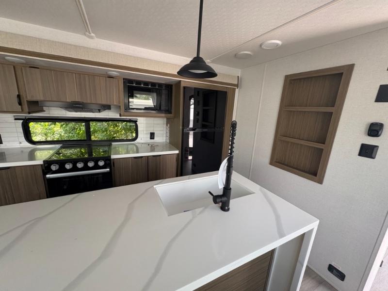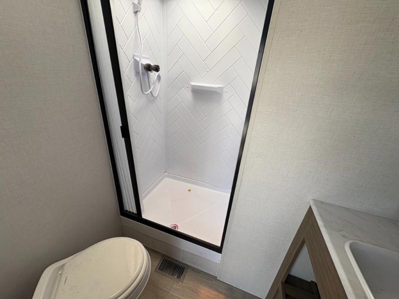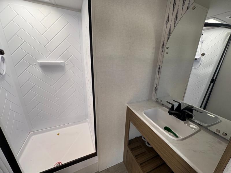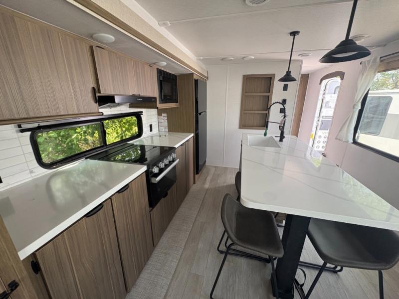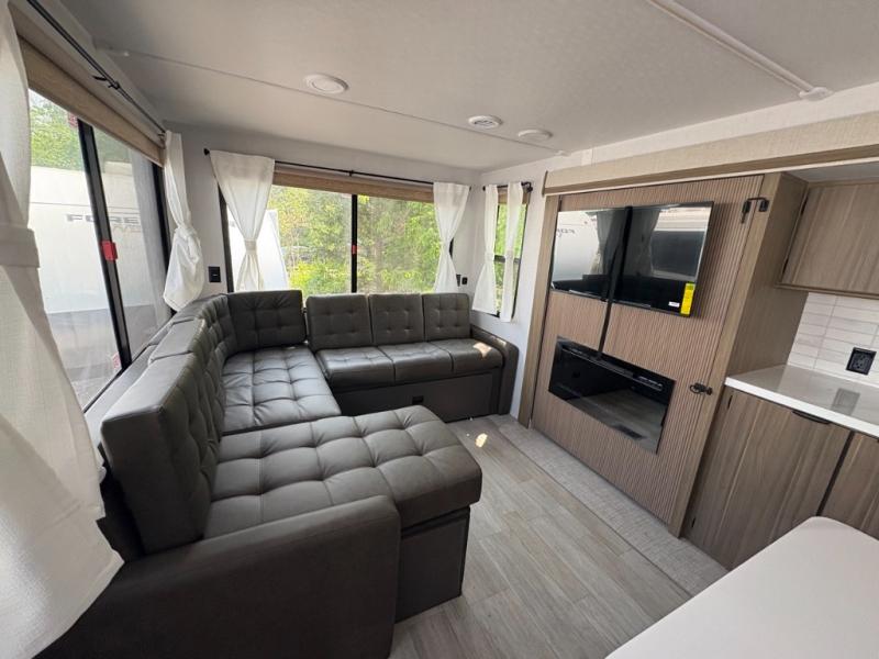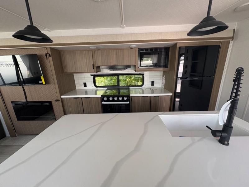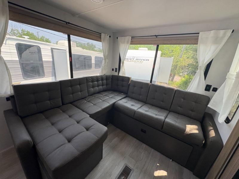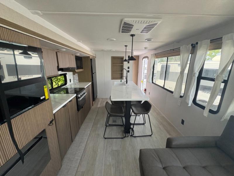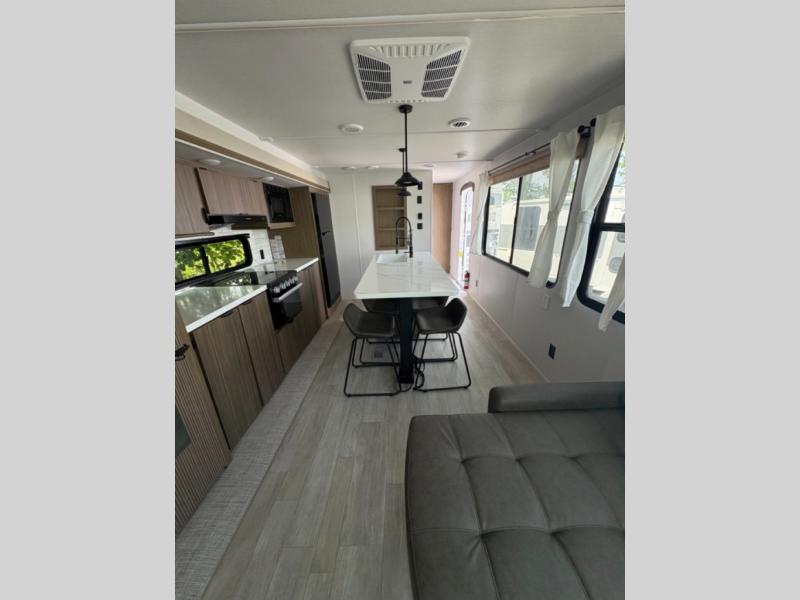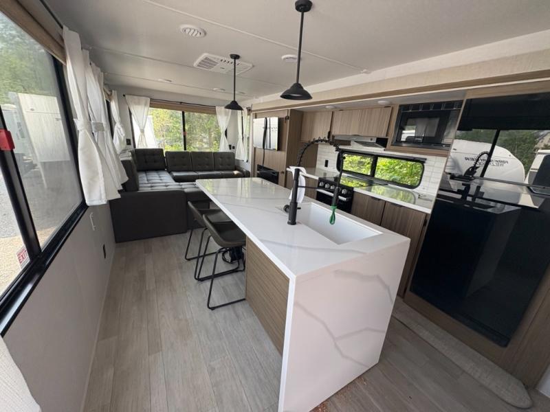 The perfect couple's coach with a view! This Wildwood View features a kitchen island and four bar stools for dining and prep space. The island also houses a large kitchen sink for easy clean-up. A sectional sofa across the back of the unit provides ample seating to relax and enjoy a good book or the entertainment center. Behind the entertainment center, you will find hidden storage space with shelves so everything can be tucked out of sight, and an oversized refrigerator will provide enough space for your perishables while you are on vacation as well. The full bath provides a walk-in shower, vanity with a sink, toilet, and linen storage. In the private front bedroom, a Versa-Tilt custom king bed will allow you a relaxing and comfortable night's rest, and once again, a great view out the dual opposing windows. On the outside, an awning offers additional living space protected from the elements, and a spacious pass-through storage compartment will allow you to stow away your camp chairs and outdoor equipment and games easily for transport.