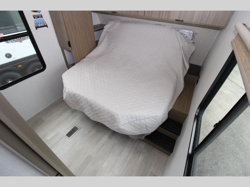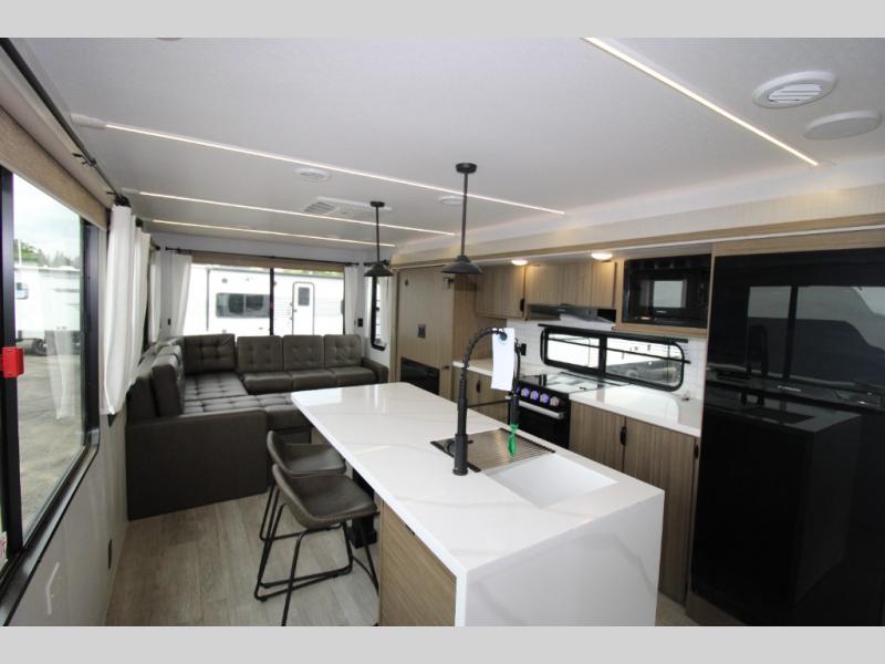 The perfect couple's coach with a view! This Wildwood View features a kitchen island and four bar stools for dining and prep space. The island also houses a large kitchen sink for easy clean-up. A sectional sofa across the back of the unit provides ample seating to relax and enjoy a good book or the entertainment center. Behind the entertainment center, you will find hidden storage space with shelves so everything can be tucked out of sight, and an oversized refrigerator will provide enough space for your perishables while you are on vacation as well. The full bath provides a walk-in shower, vanity with a sink, toilet, and linen storage. In the private front bedroom, a Versa-Tilt custom king bed will allow you a relaxing and comfortable night's rest, and once again, a great view out the dual opposing windows. On the outside, an awning offers additional living space protected from the elements, and a spacious pass-through storage compartment will allow you to stow away your camp chairs and outdoor equipment and games easily for transport.