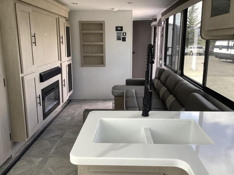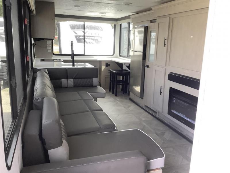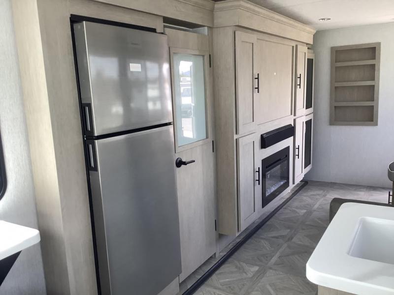 This Wildwood View trailer is sure to take your breath away! The rear kitchen includes wrap-around counter space with four barstools where you can dine together, enjoy your coffee at, and plan your day out. The chef of your group will also appreciate the outside kitchen option if they want to cook outdoors! A sectional sofa will seat four or more, and it's right across from the entertainment center with a fireplace for great views. You will love the hidden bunkhouse within the Versa slide and behind the entertainment center. There is a flip-up bunk with a mattress pad below, a desk with a bar stool, plus additional storage for your guests' things. You will find your own bedroom up front which includes a custom king bed with Versa-Tilt, dual wardrobes and nightstands, plus a third wardrobe with washer and dryer prep if you want to add those appliances.