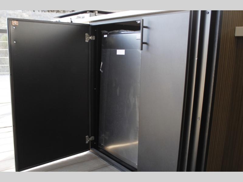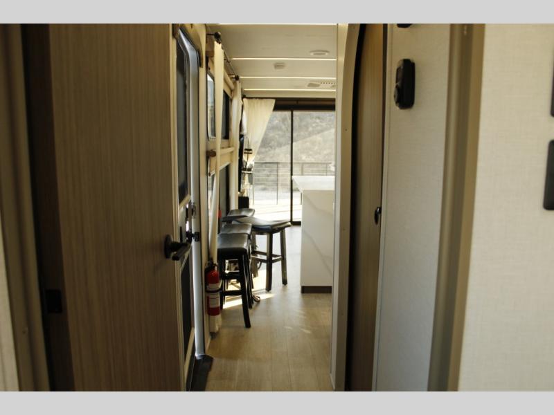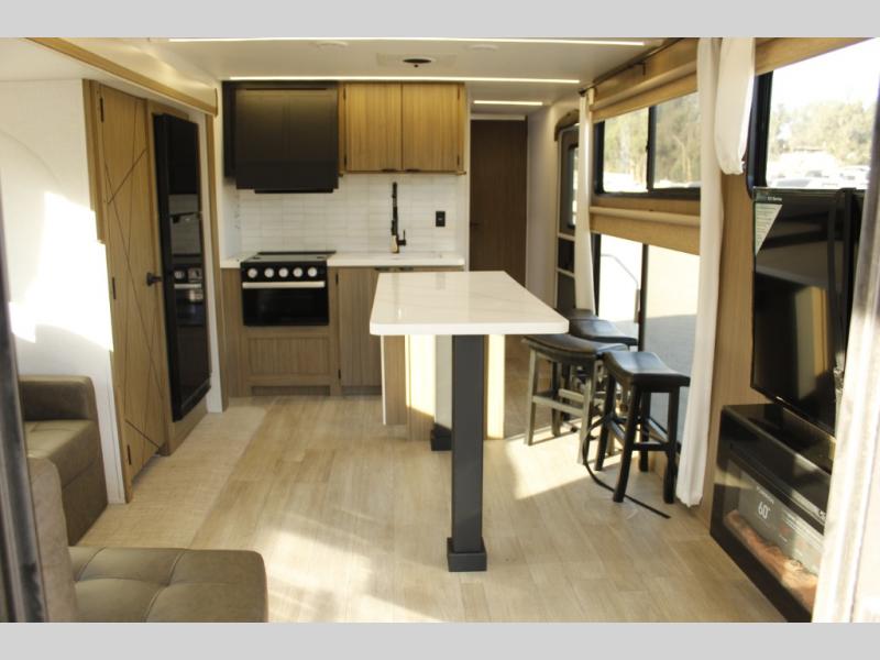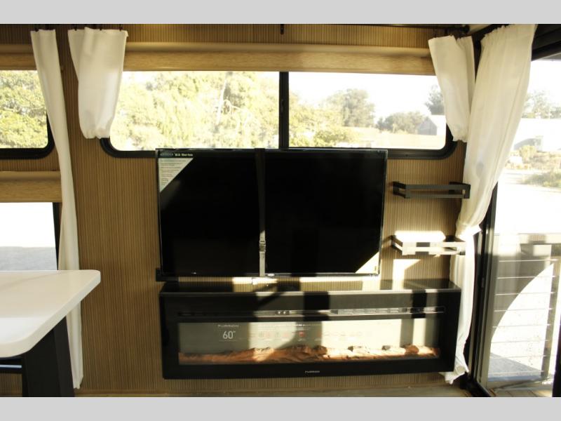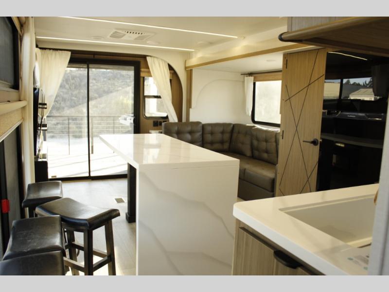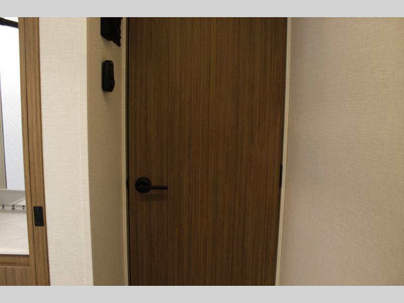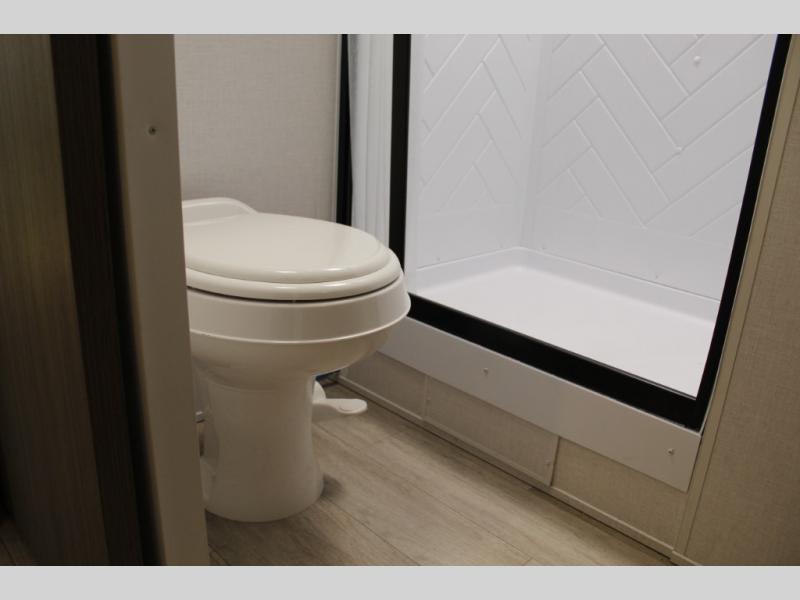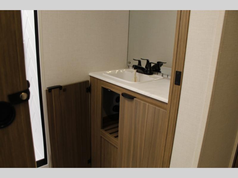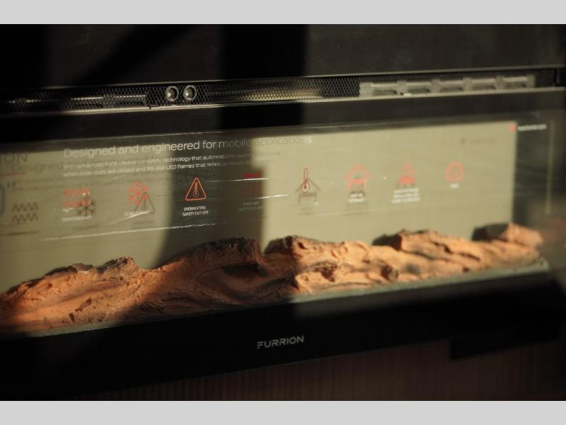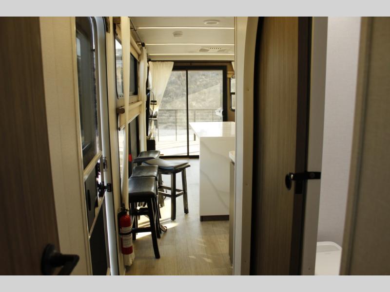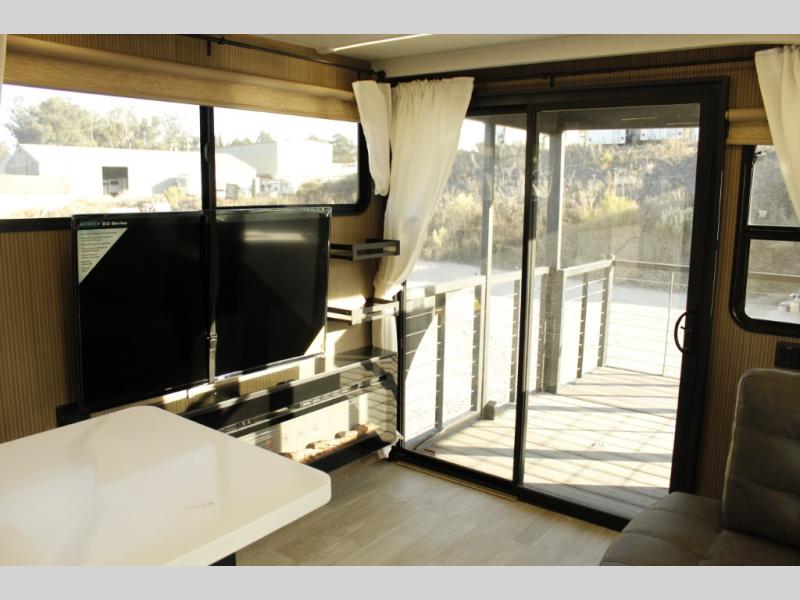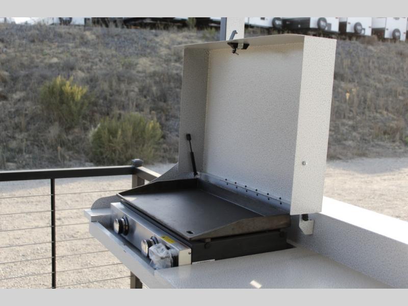 This travel trailer will feel more like home with its rear veranda/porch, dual entry doors, and front private bedroom! There is an outdoor kitchen on the back porch so you can make lunch in the fresh air, and the patio doors lead right into the main living area. Your crew can relax on the L-shaped sofa across from the fireplace, which will make your space more cozy. A kitchen island with four chairs will provide a place to dine at, and there is a spacious pantry and refrigerator for food storage. You will love having your own space in the private bedroom, and the Versa-Tilt custom king bed will let you sit up in bed to read your book at night.