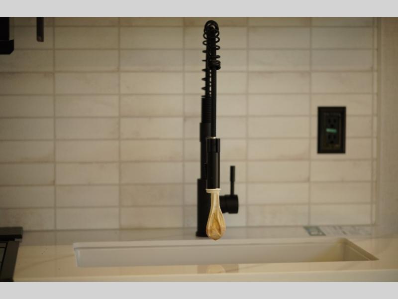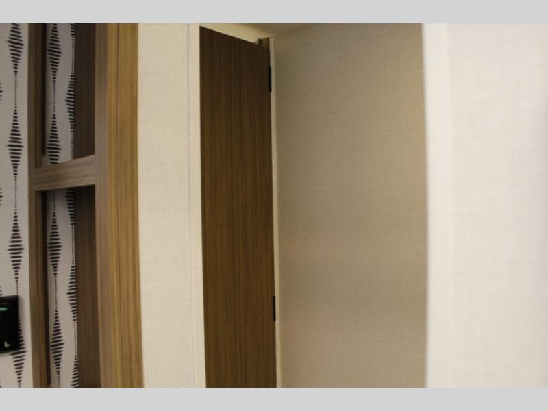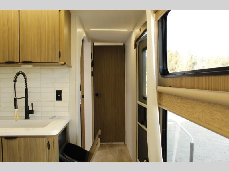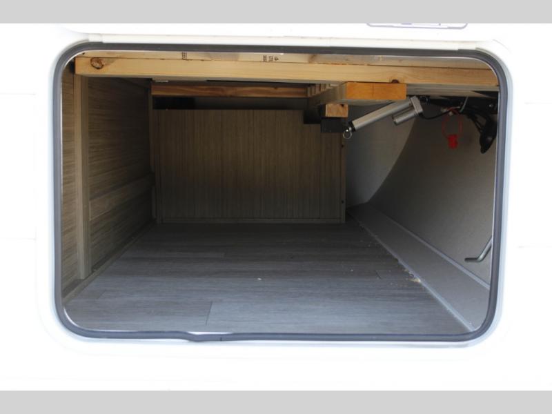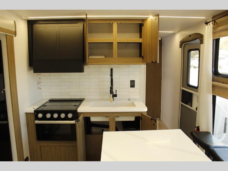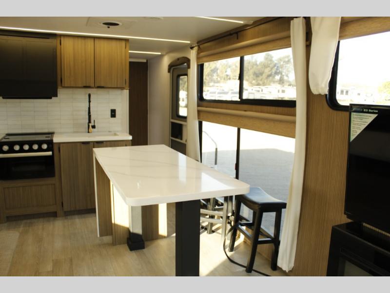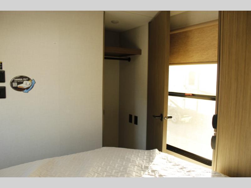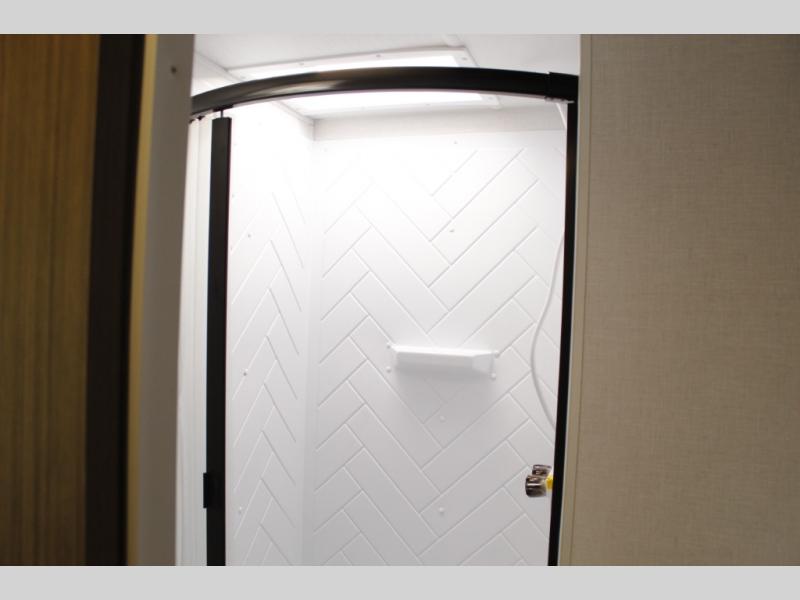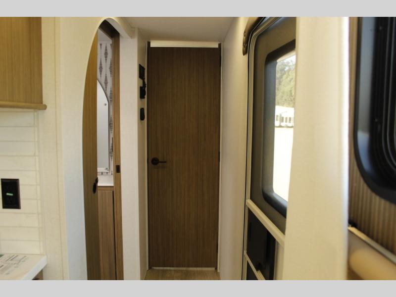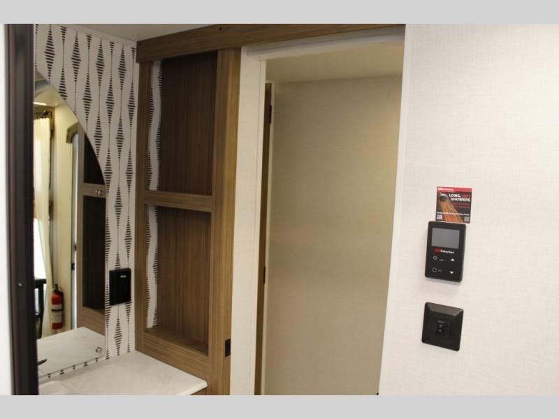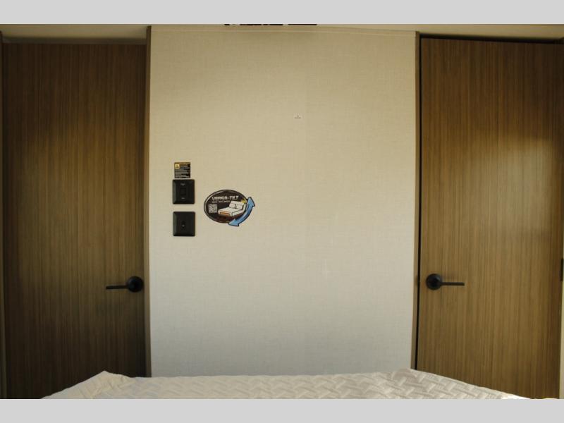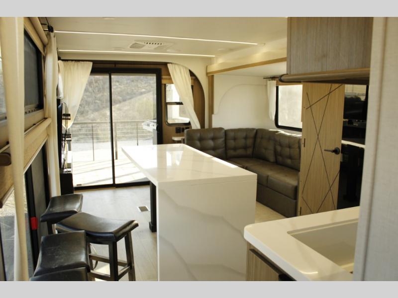 This travel trailer will feel more like home with its rear veranda/porch, dual entry doors, and front private bedroom! There is an outdoor kitchen on the back porch so you can make lunch in the fresh air, and the patio doors lead right into the main living area. Your crew can relax on the L-shaped sofa across from the fireplace, which will make your space more cozy. A kitchen island with four chairs will provide a place to dine at, and there is a spacious pantry and refrigerator for food storage. You will love having your own space in the private bedroom, and the Versa-Tilt custom king bed will let you sit up in bed to read your book at night.