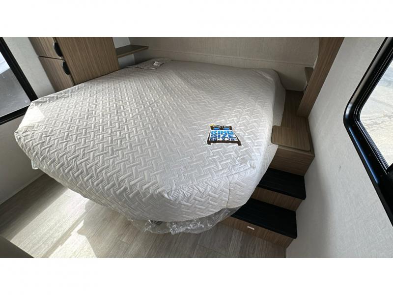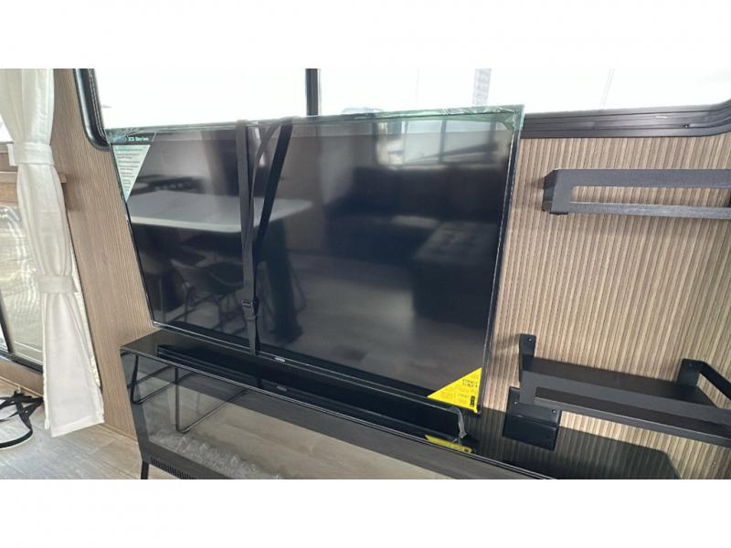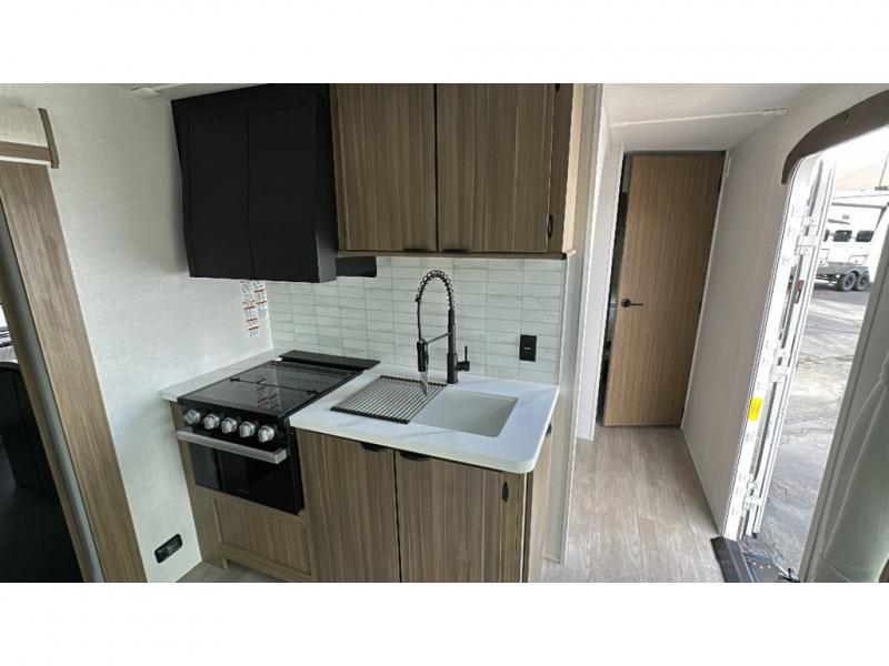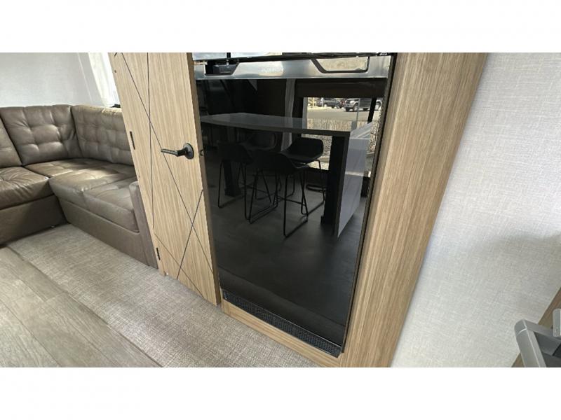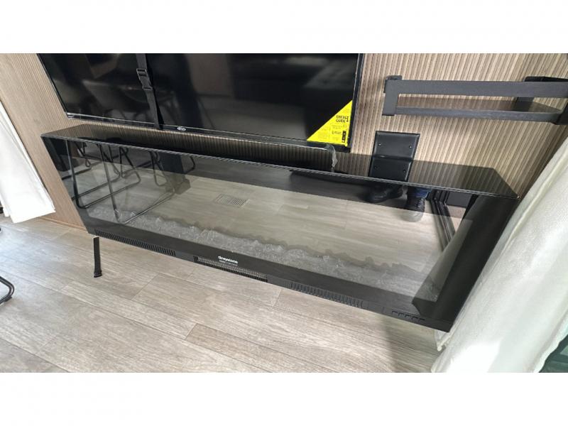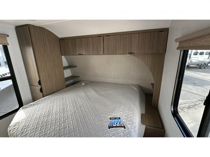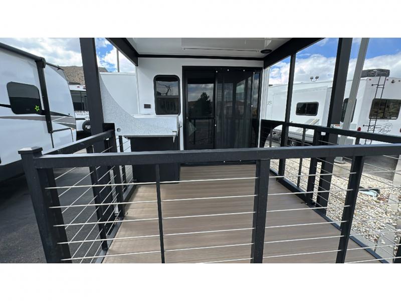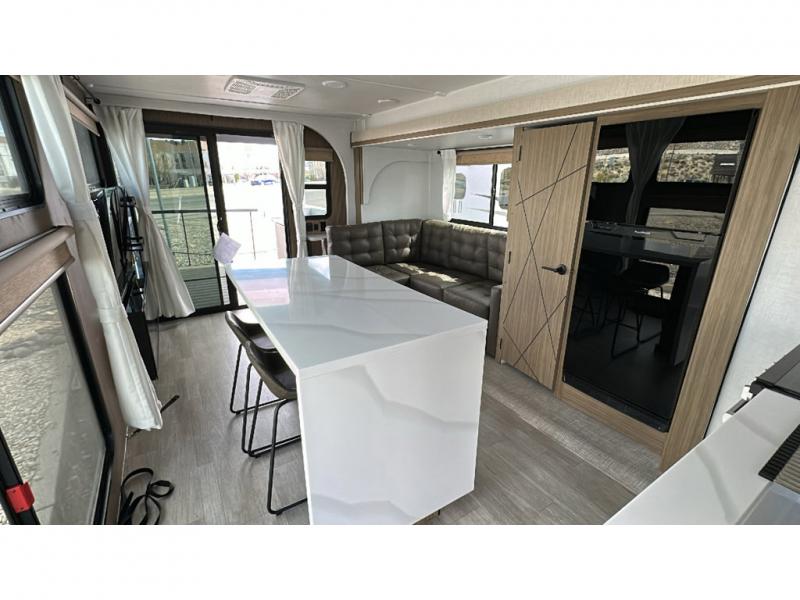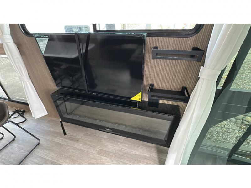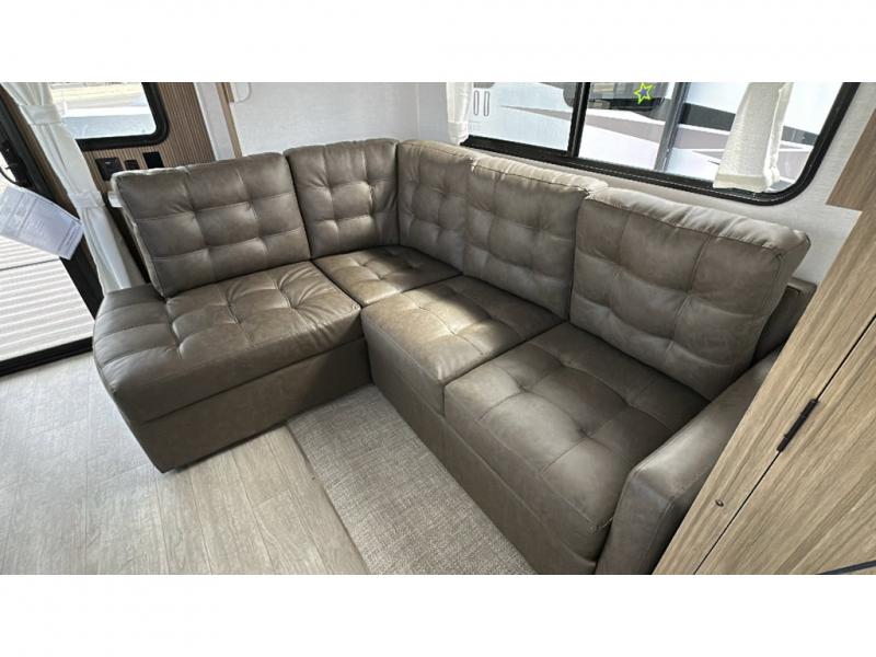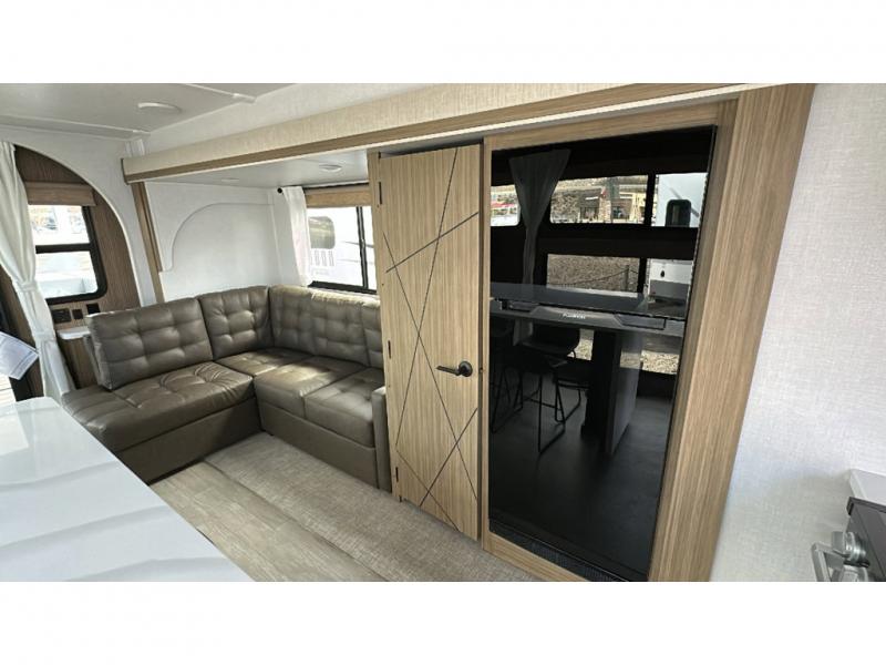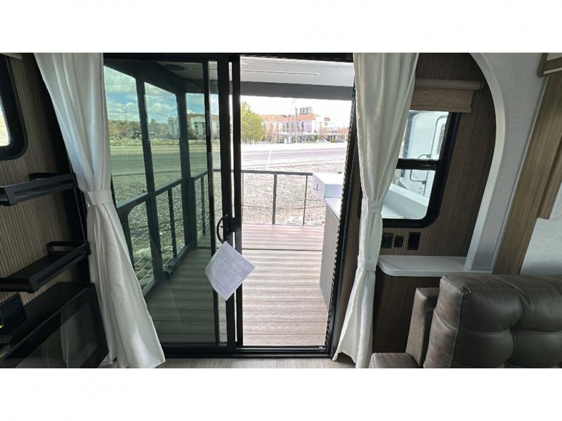 This travel trailer will feel more like home with its rear veranda/porch, dual entry doors, and front private bedroom! There is an outdoor kitchen on the back porch so you can make lunch in the fresh air, and the patio doors lead right into the main living area. Your crew can relax on the L-shaped sofa across from the fireplace, which will make your space more cozy. A kitchen island with four chairs will provide a place to dine at, and there is a spacious pantry and refrigerator for food storage. You will love having your own space in the private bedroom, and the Versa-Tilt custom king bed will let you sit up in bed to read your book at night.