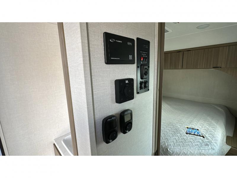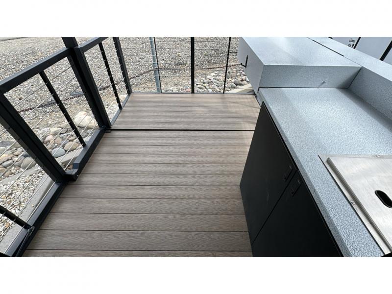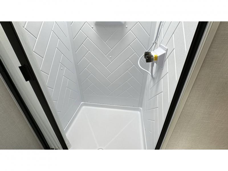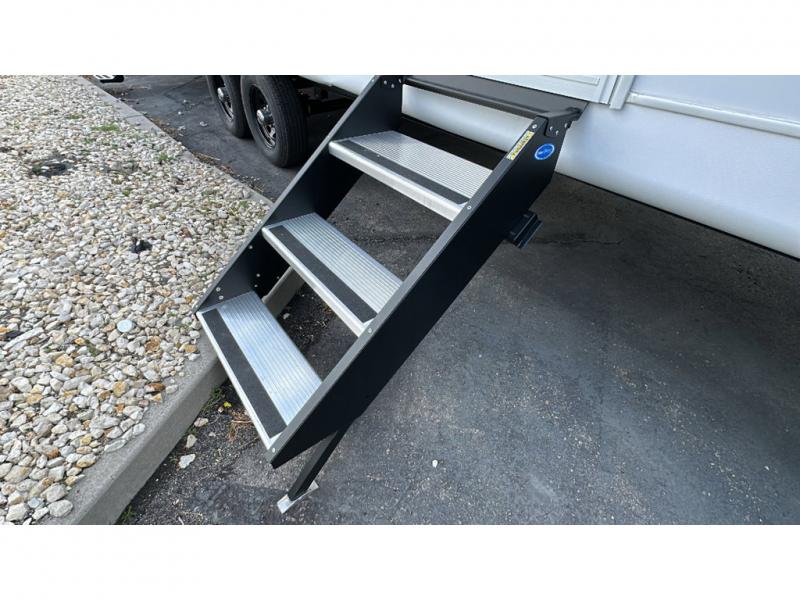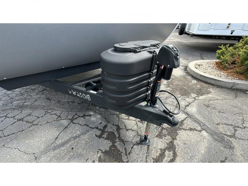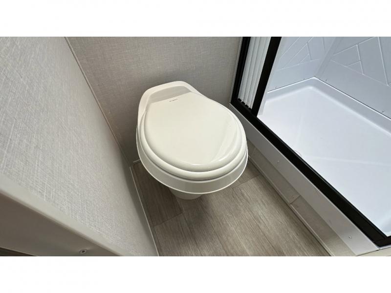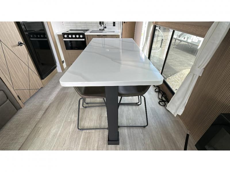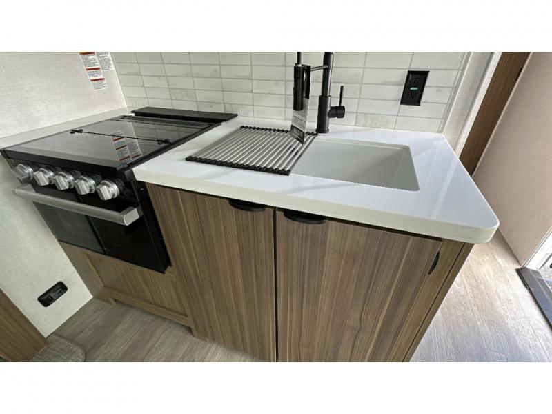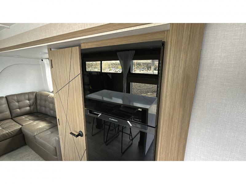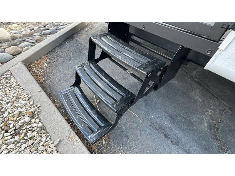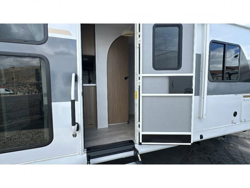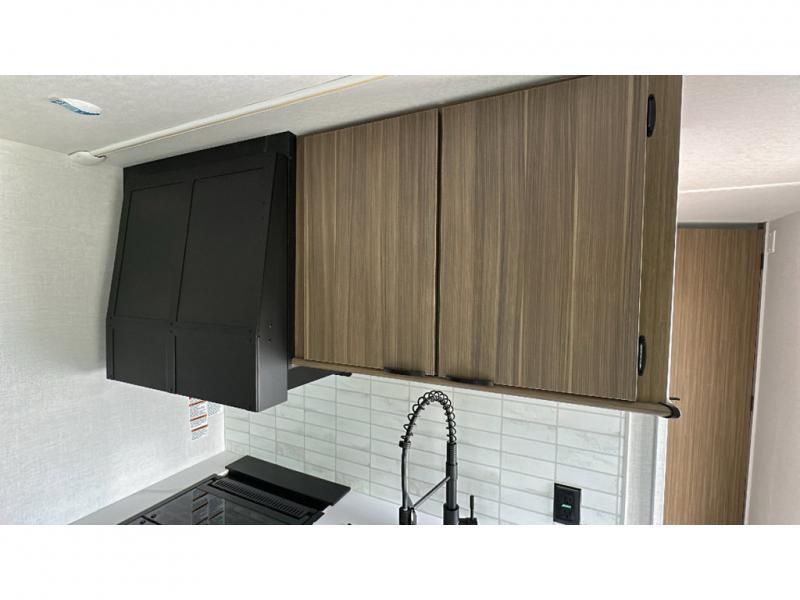 This travel trailer will feel more like home with its rear veranda/porch, dual entry doors, and front private bedroom! There is an outdoor kitchen on the back porch so you can make lunch in the fresh air, and the patio doors lead right into the main living area. Your crew can relax on the L-shaped sofa across from the fireplace, which will make your space more cozy. A kitchen island with four chairs will provide a place to dine at, and there is a spacious pantry and refrigerator for food storage. You will love having your own space in the private bedroom, and the Versa-Tilt custom king bed will let you sit up in bed to read your book at night.