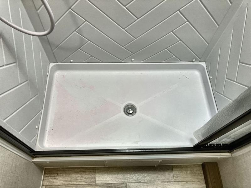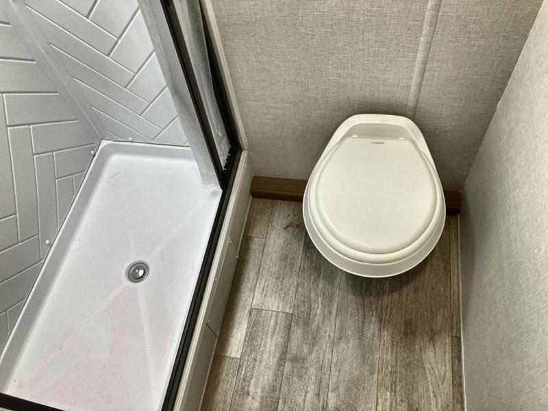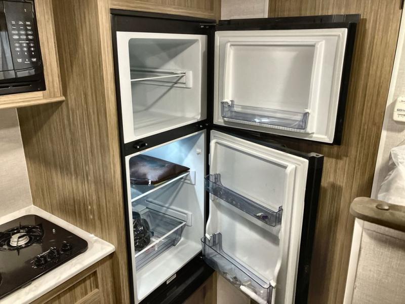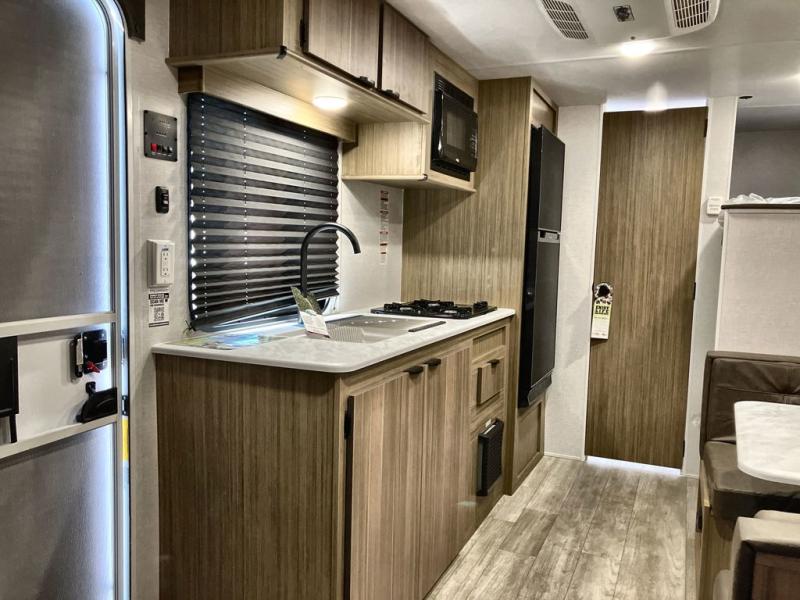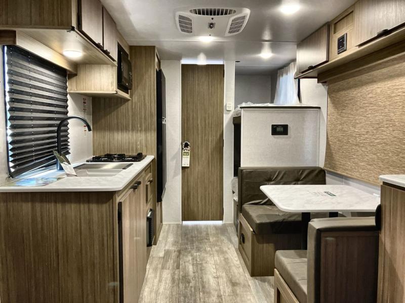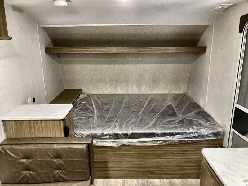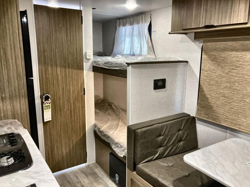 The whole family will enjoy camping in this travel trailer! The kiddos or your guests will have their own sleeping space with the set of bunk beds and you will have yours with the front RV queen bed. The booth dinette could even transform into an extra sleeping space when you aren't using it to enjoy a meal prepared using the three burner cooktop and double door refrigerator. There is a rear corner bathroom with a shower so everyone can rinse the sand out of their hair after a fun beach day. And the exterior storage lets you bring all of your outdoor camping gear!