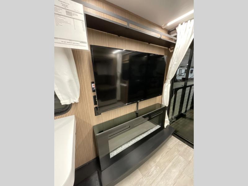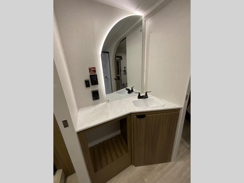 This travel trailer will feel more like home with its rear veranda/porch, dual entry doors, and front master bedroom! There is an outdoor kitchen on the back porch so you can make lunch in the fresh air, and the patio doors lead right into the main living area. Your crew can relax on the L-shaped sofa across from the fireplace, which will make your space more cozy. The U-shaped kitchen counter includes a pull-out table for even more counter space, and the walk-thru bath is easily accessible for everyone to use. You will love having your own space in the master bedroom, and the Versa-Tilt custom king bed will let you sit up in bed to read your book at night. One of the dual entry doors is also found here for added convenience!