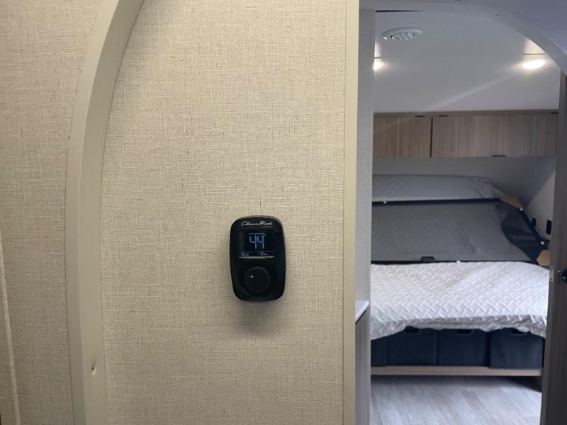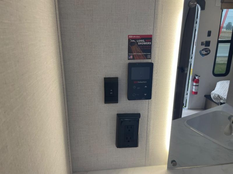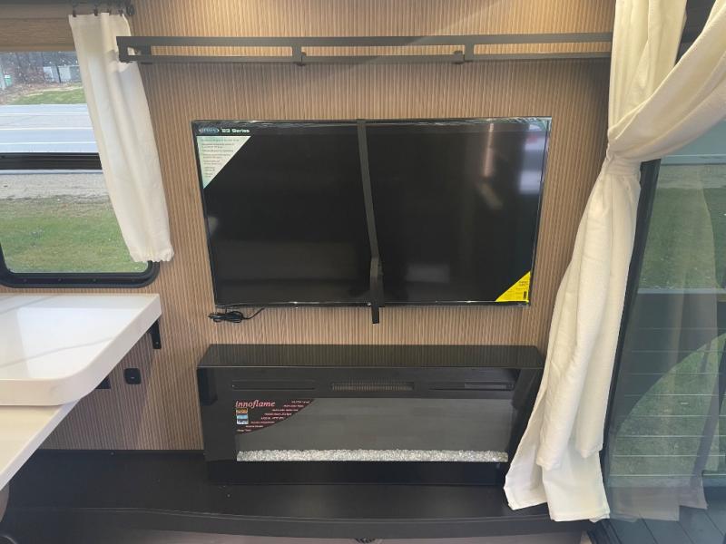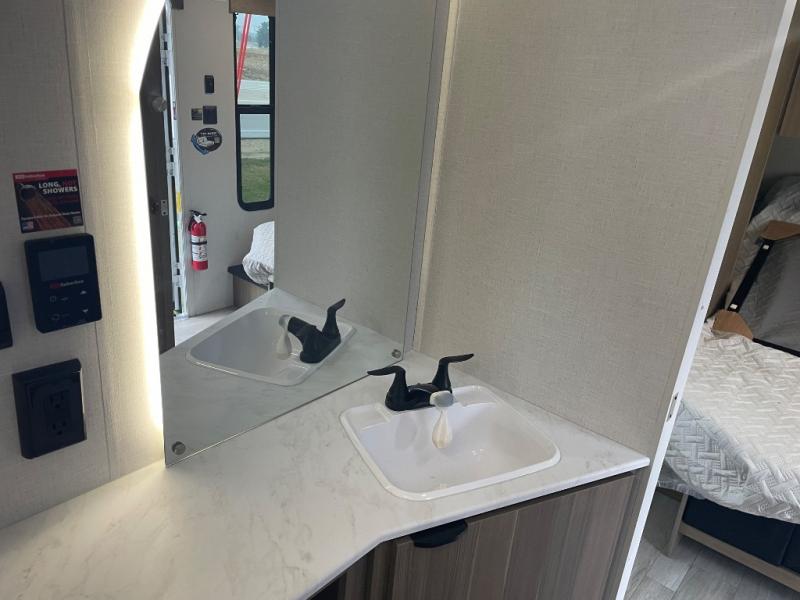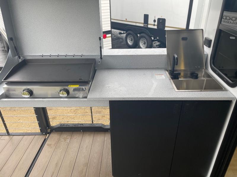 This travel trailer will feel more like home with its rear veranda/porch, dual entry doors, and front master bedroom! There is an outdoor kitchen on the back porch so you can make lunch in the fresh air, and the patio doors lead right into the main living area. Your crew can relax on the L-shaped sofa across from the fireplace, which will make your space more cozy. The U-shaped kitchen counter includes a pull-out table for even more counter space, and the walk-thru bath is easily accessible for everyone to use. You will love having your own space in the master bedroom, and the Versa-Tilt custom king bed will let you sit up in bed to read your book at night. One of the dual entry doors is also found here for added convenience!