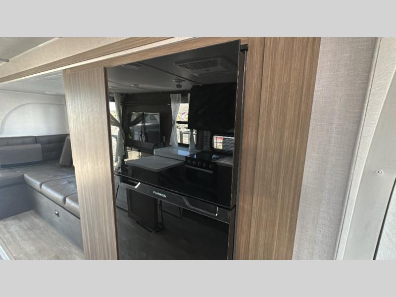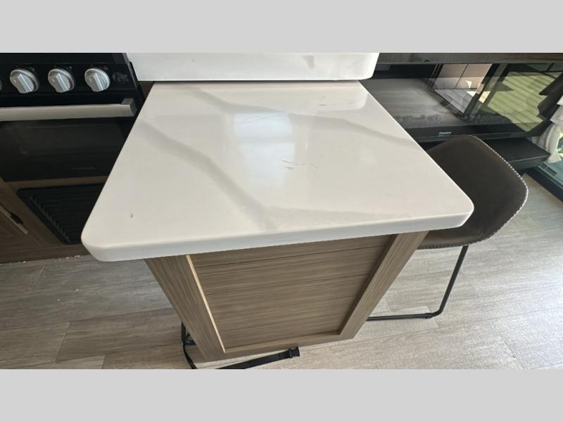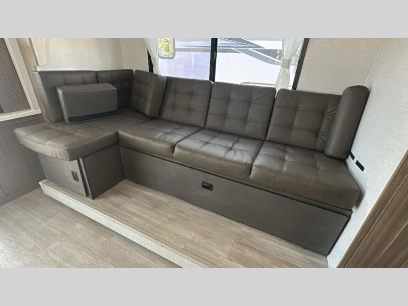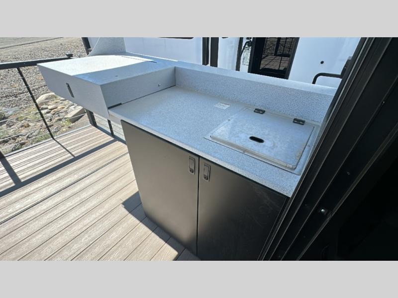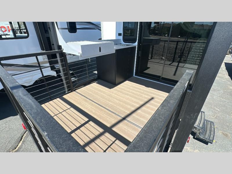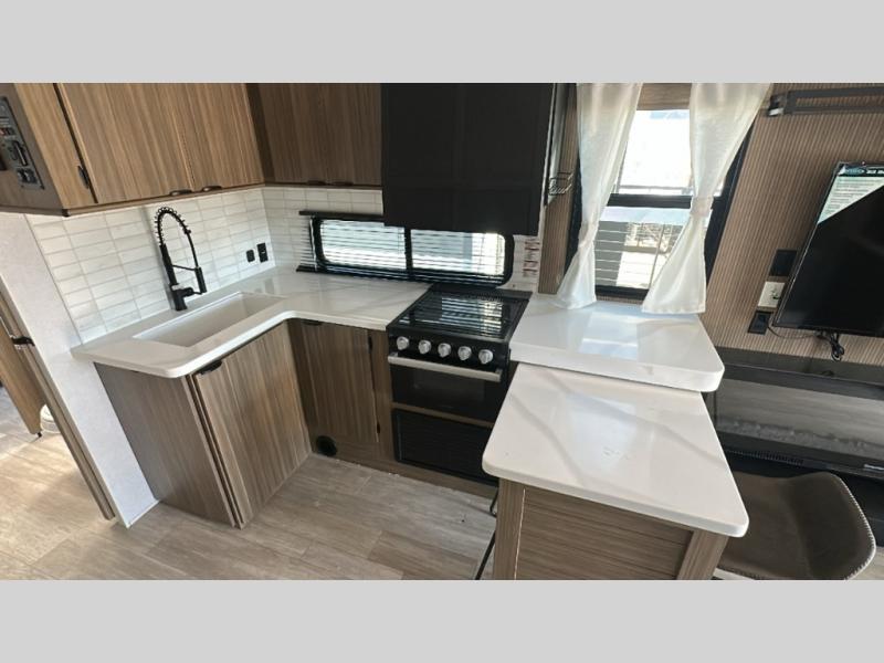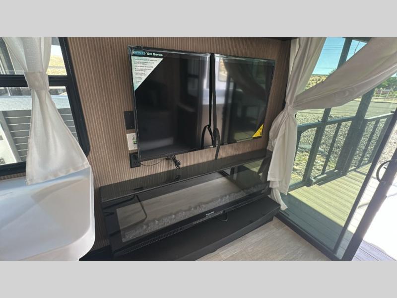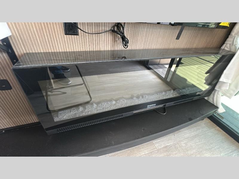 This travel trailer will feel more like home with its rear veranda/porch, dual entry doors, and front master bedroom! There is an outdoor kitchen on the back porch so you can make lunch in the fresh air, and the patio doors lead right into the main living area. Your crew can relax on the L-shaped sofa across from the fireplace, which will make your space more cozy. The U-shaped kitchen counter includes a pull-out table for even more counter space, and the walk-thru bath is easily accessible for everyone to use. You will love having your own space in the master bedroom, and the Versa-Tilt custom king bed will let you sit up in bed to read your book at night. One of the dual entry doors is also found here for added convenience!