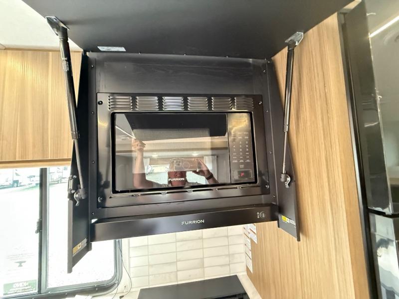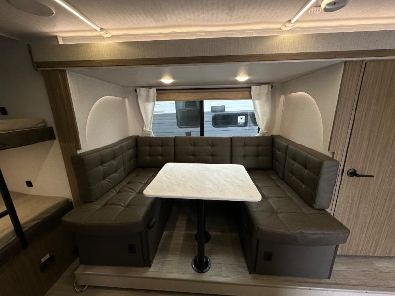 The double-size bunks pack a lot of extra sleeping space into this Wildwood X-Lite travel trailer! Some of the other comfortable features that you will find are the U-shaped dinette that has panoramic windows surrounding it, the entertainment center with an electric fireplace below, the private bedroom with a custom king bed with Versa Tilt, and the walk-in pantry that will make it easy to grab your spices and snacks. It is extremely easy to reach the bathroom from both the interior and exterior because it contains the second entry/exit door, and the oversized refrigerator in the kitchen is going to be able to hold all of the produce that your family likes to eat. You also have an 18' awning that provides a protected area to relax and enjoy nature and an exterior camp kitchen with a griddle!