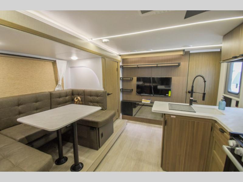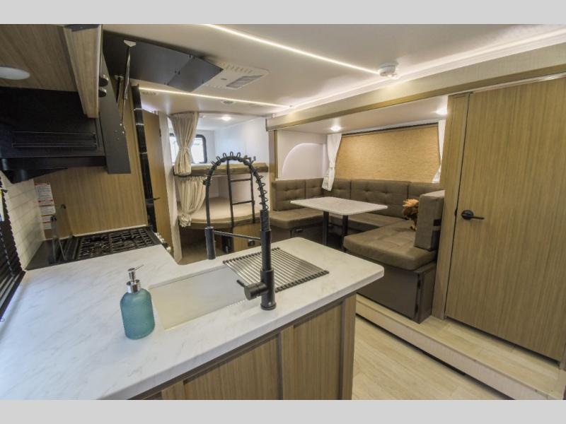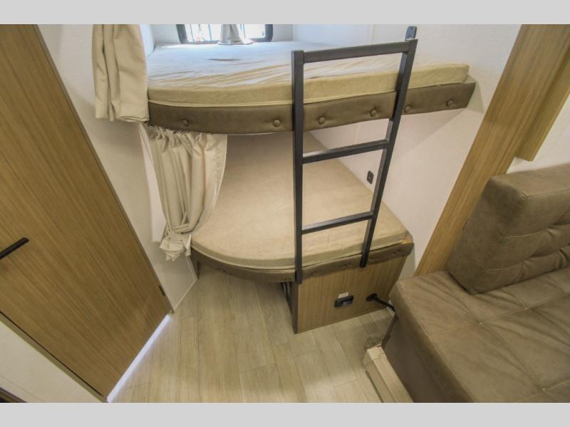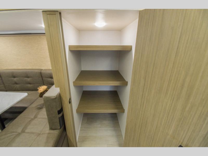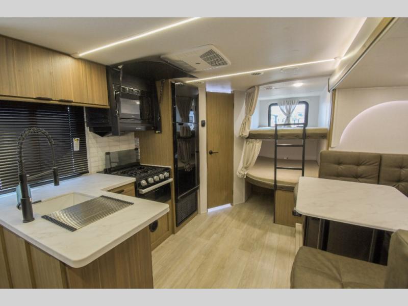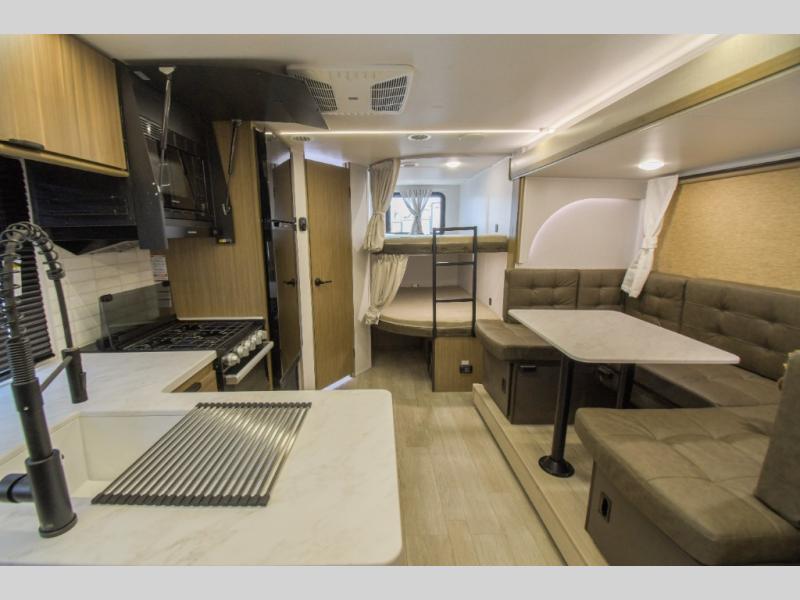 The double-size bunks pack a lot of extra sleeping space into this Wildwood X-Lite travel trailer! Some of the other comfortable features that you will find are the U-shaped dinette that has panoramic windows surrounding it, the entertainment center with an electric fireplace below, the private bedroom with a custom king bed with Versa Tilt, and the walk-in pantry that will make it easy to grab your spices and snacks. It is extremely easy to reach the bathroom from both the interior and exterior because it contains the second entry/exit door, and the oversized refrigerator in the kitchen is going to be able to hold all of the produce that your family likes to eat. You also have an 18' awning that provides a protected area to relax and enjoy nature and an exterior camp kitchen with a griddle!