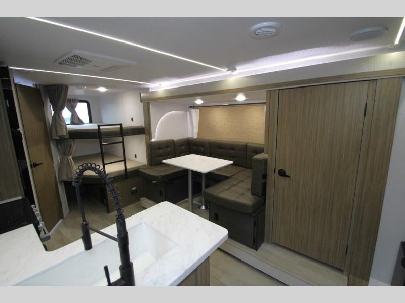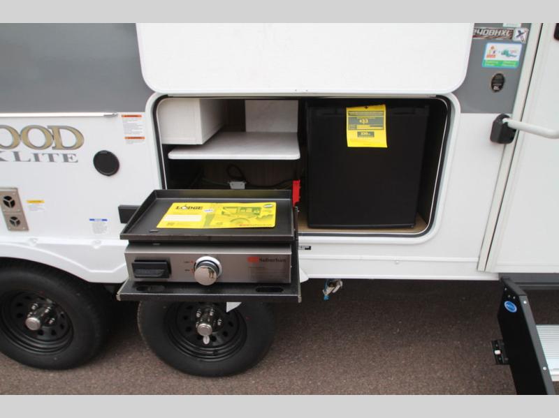 The double-size bunks pack a lot of extra sleeping space into this Wildwood X-Lite travel trailer! Some of the other comfortable features that you will find are the U-shaped dinette that has panoramic windows surrounding it, the entertainment center with an electric fireplace below, the private bedroom with a custom king bed with Versa Tilt, and the walk-in pantry that will make it easy to grab your spices and snacks. It is extremely easy to reach the bathroom from both the interior and exterior because it contains the second entry/exit door, and the oversized refrigerator in the kitchen is going to be able to hold all of the produce that your family likes to eat. You also have an 18' awning that provides a protected area to relax and enjoy nature and an exterior camp kitchen with a griddle!