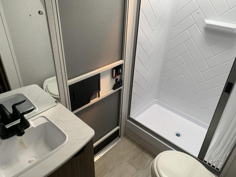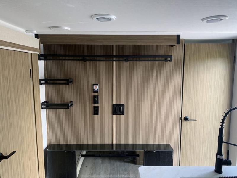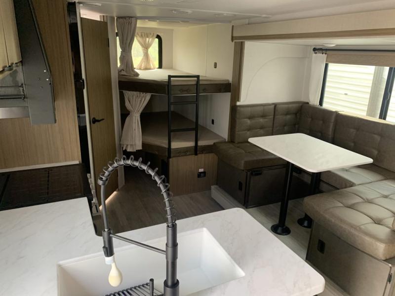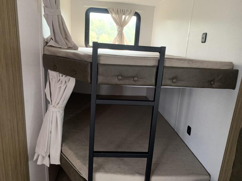 The double-size bunks pack a lot of extra sleeping space into this Wildwood X-Lite Platinum travel trailer! Some of the other comfortable features that you will find are the U-shaped dinette that has panoramic windows surrounding it, the entertainment center with an electric fireplace below, the private bedroom with custom a king bed, and the walk-in pantry that will make it easy to grab your spices and snacks. It is extremely easy to reach the bathroom from both the interior and exterior because it contains the second entry/exit door, and the oversized refrigerator in the kitchen is going to be able to hold all of the produce that your family likes to eat. You also have an 18' power awning that provides a protected area to relax and enjoy nature and an exterior camp kitchen for the outdoor cook!