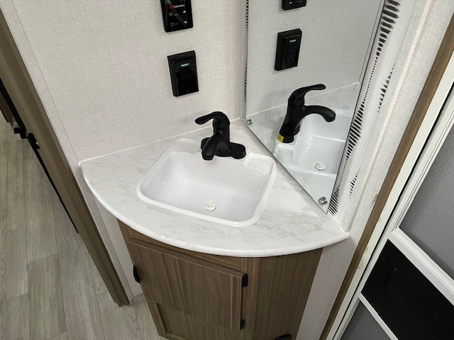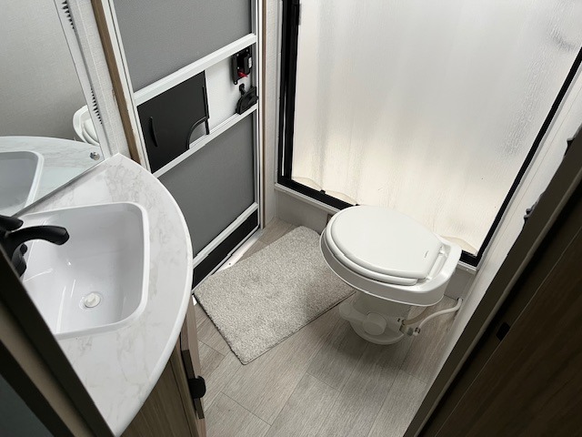 The double-size bunks pack a lot of extra sleeping space into this Wildwood X-Lite travel trailer! Some of the other comfortable features that you will find are the U-shaped dinette that has a panoramic window surrounding it, the entertainment center, the private bedroom with a custom king bed, and the walk-in pantry that will make it easy to grab your spices and snacks. It is extremely easy to reach the bathroom from both the interior and exterior because it contains the second entry/exit door, and the 12V refrigerator in the kitchen is going to be able to hold all of the produce that your family likes to eat. You also have an awning that provides a protected area to relax and enjoy nature!