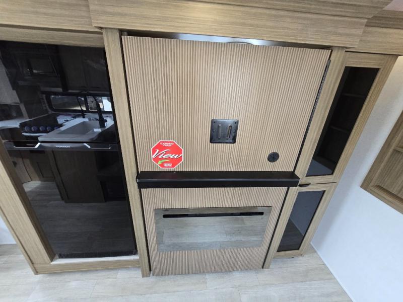 Enjoy your surroundings with 64 square feet of windows! So, no matter where you park, you can easily bring the outdoors right inside. The rear kitchen features 18 linear feet of wrap-around counter space including a double sink and a three burner cook-top with overhead microwave oven. There are bar stools for dining inside along the rear counter, and an L-shaped sofa for additional seating in the open living area. Here, behind the entertainment center, is a multi-purpose space hidden behind the shiplap feature wall insert with fireplace including a hinged top mattress above a lower bunk, a desk beneath the mattress if you need office space during the day, along with storage cubbies for your things, all within the Versa-Slide that also houses an oversized refrigerator for all of your perishables. The front private bedroom features a Versa-Tilt custom king bed with dual nightstands and closets, plus overhead storage. You will also find additional storage in a large pass-through beneath on the exterior, and the exterior camp kitchen is sure to be a big hit with the cook!
