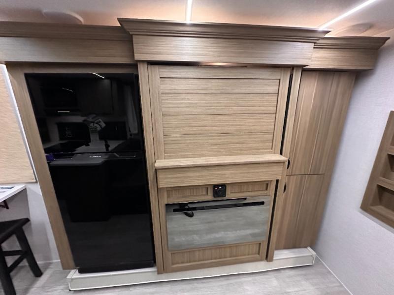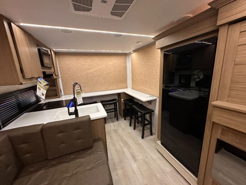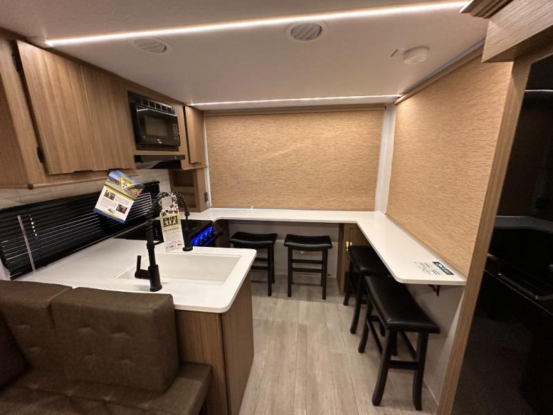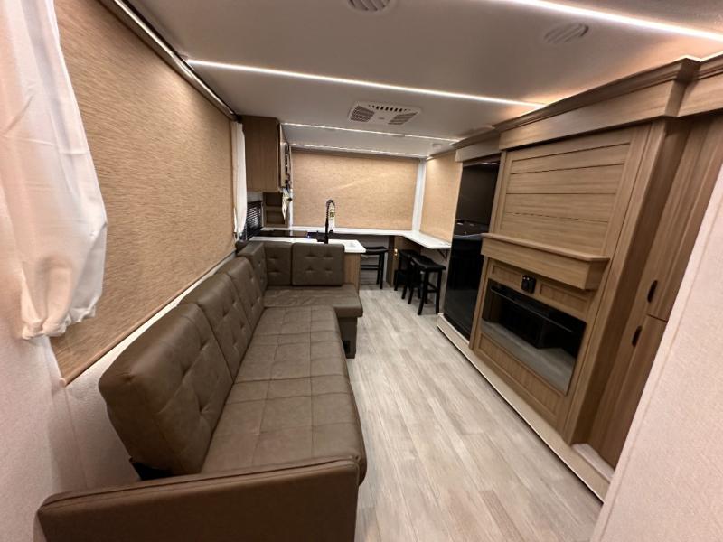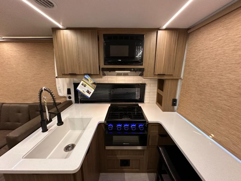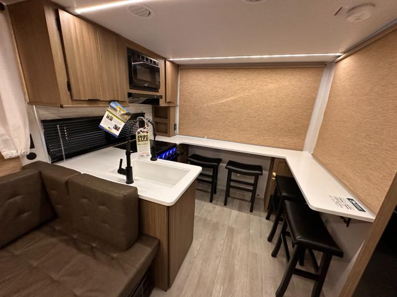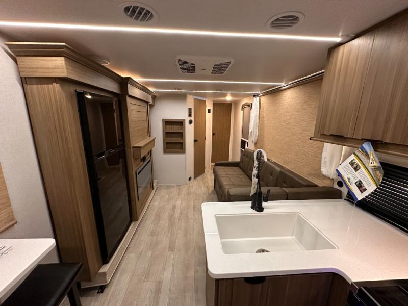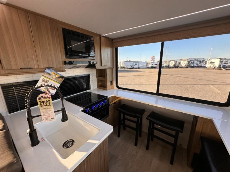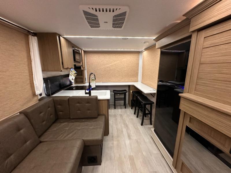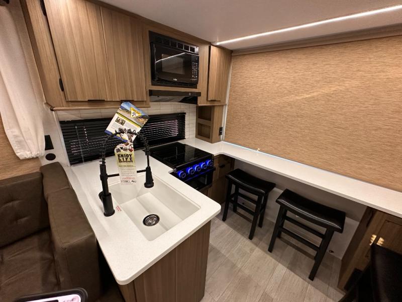 Enjoy your surroundings with plenty of windows in this VIEW travel trailer. The rear kitchen features a wrap-around counter space including a double sink and a three burner cook-top with overhead microwave oven. There are bar stools for dining inside along the rear counter, and an L-shaped chaise lounge for additional seating in the open living area. Here, behind the entertainment center, is a multi-purpose space hidden behind the wall insert with a fireplace including a hinged top mattress above a lower bunk, a desk beneath the mattress if you need office space during the day, along with storage cubbies for your things, all within the Versa-Slide that also houses an oversized refrigerator for all of your perishables. The front private bedroom features a custom king bed with Versa-Tilt with dual nightstands and closets, plus overhead storage. You will also find additional storage in a large pass-through beneath on the exterior and an exterior camp kitchen option where you can make make meals outside each day if you choose!