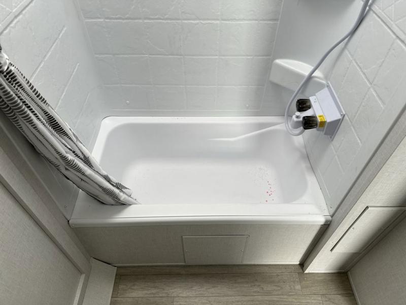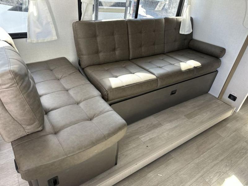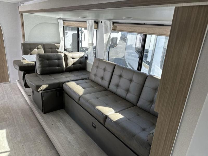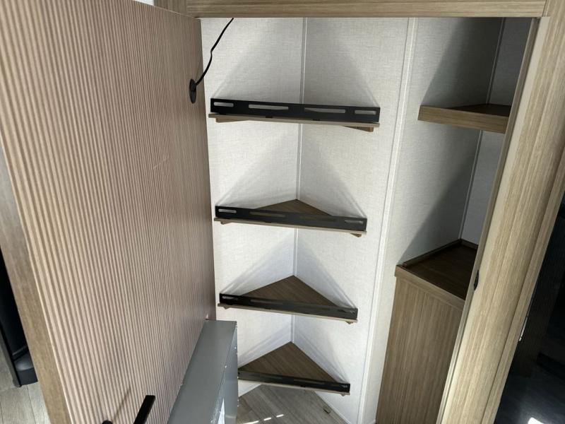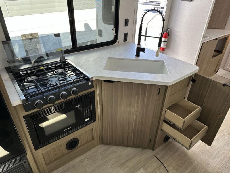 You're sure to make camping memories in this spacious travel trailer! You can sleep four to five people each night thanks to the the custom king bed with Versa Tilt in the front bedroom plus the Versa-Lounge and booth dinette within the large slide out! The full kitchen will let you make meals each day, and you'll appreciate the hidden pantry with shelves behind the fireplace. And don't overlook the full rear bath, complete with a tub/shower and ample counter space for your things.