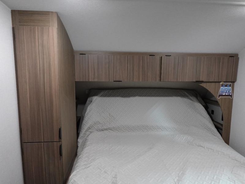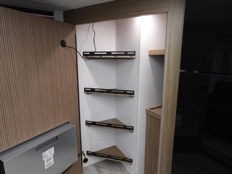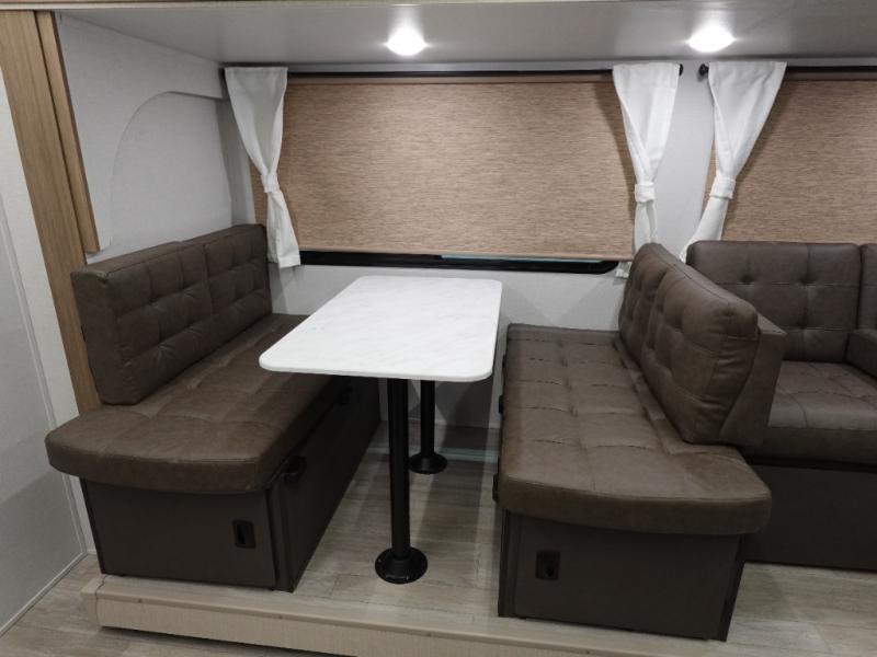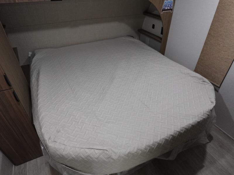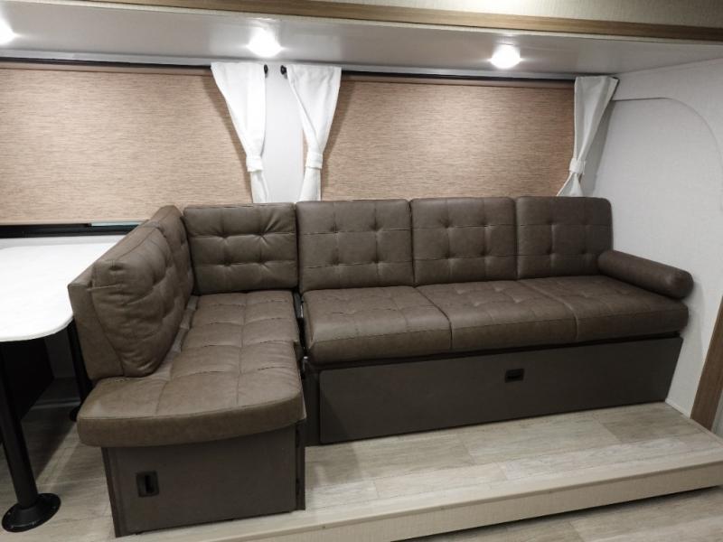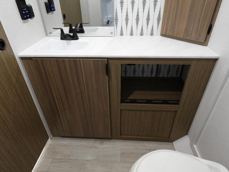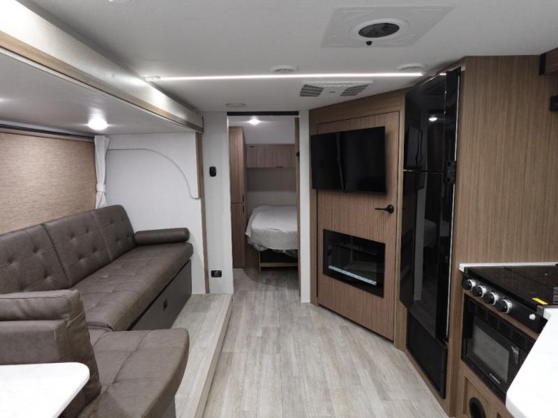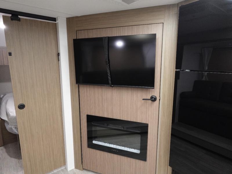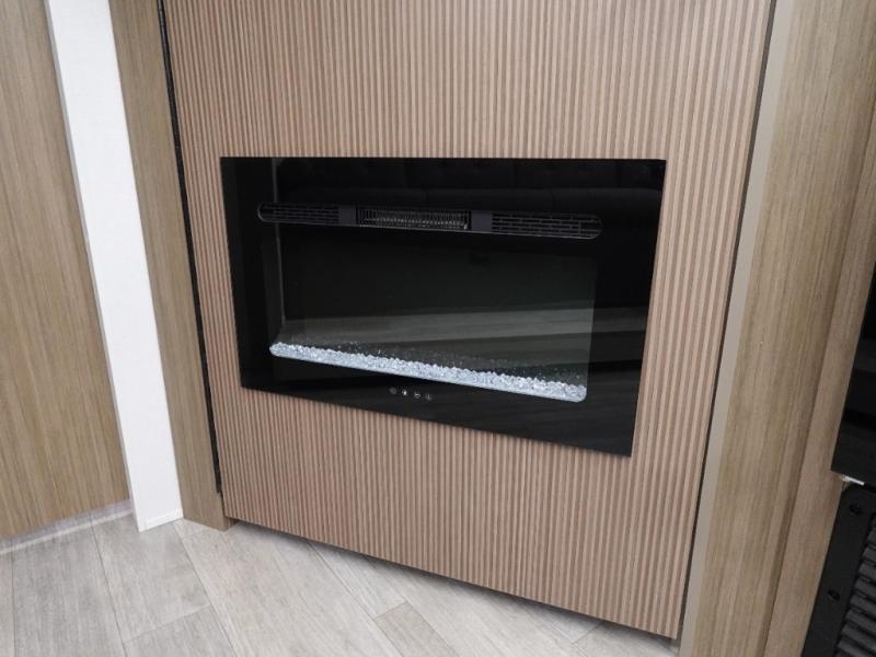 You're sure to make camping memories in this spacious travel trailer! You can sleep four to five people each night thanks to the the custom king bed with Versa Tilt in the front bedroom plus the Versa-Lounge and booth dinette within the large slide out! The full kitchen will let you make meals each day, and you'll appreciate the hidden pantry with shelves behind the fireplace. And don't overlook the full rear bath, complete with a tub/shower and ample counter space for your things.