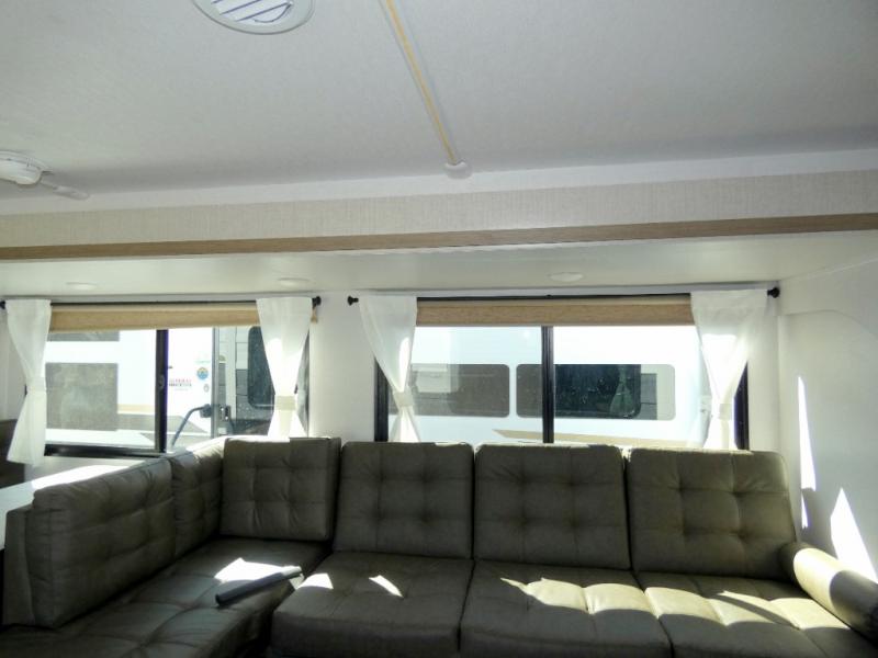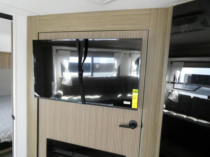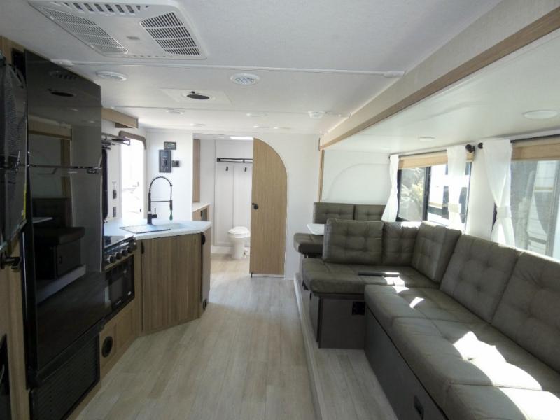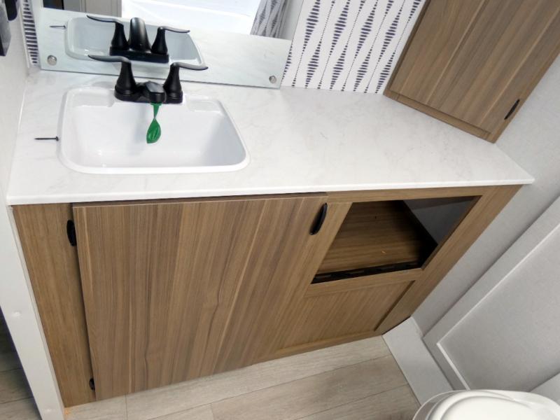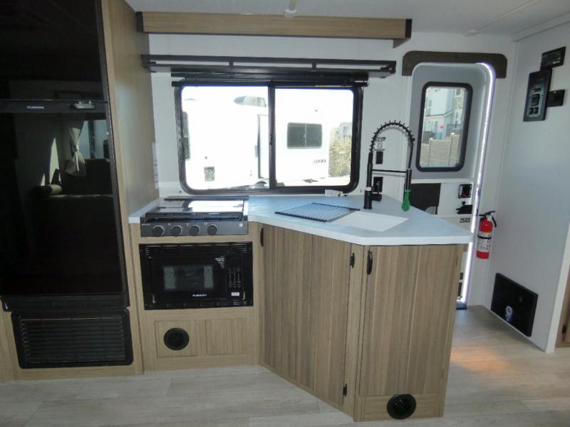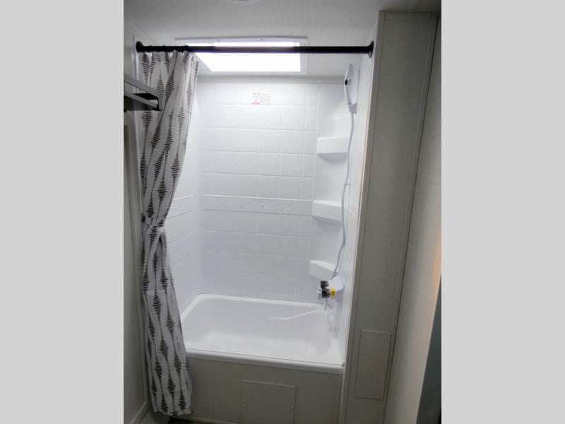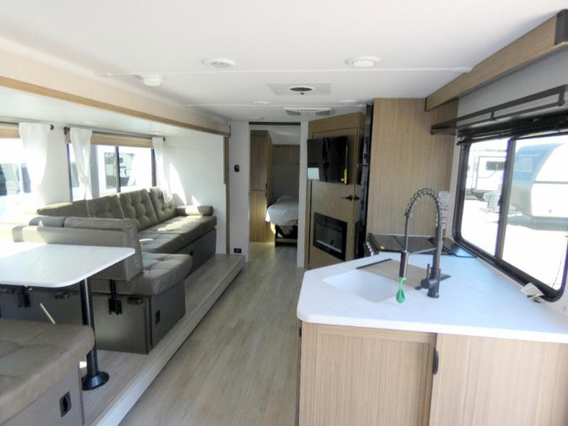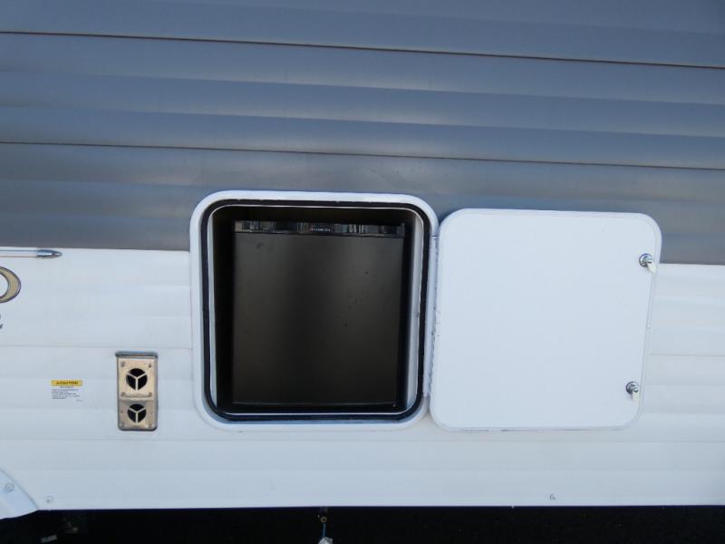 You're sure to make camping memories in this spacious travel trailer! You can sleep four to five people each night thanks to the the custom king bed with Versa Tilt in the front bedroom plus the Versa-Lounge and booth dinette within the large slide out! The full kitchen will let you make meals each day, and you'll appreciate the hidden pantry with shelves behind the fireplace. And don't overlook the full rear bath, complete with a tub/shower and ample counter space for your things.