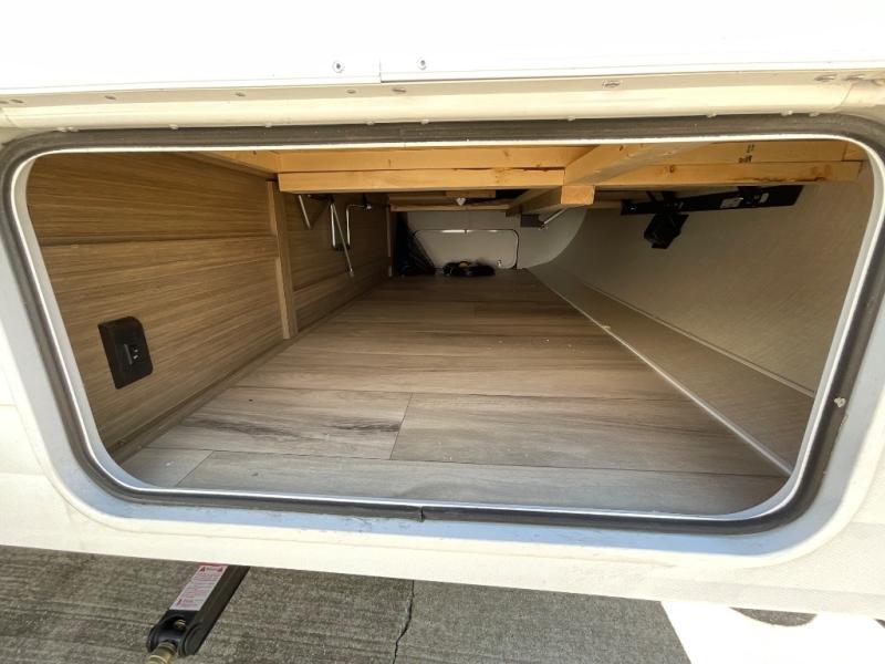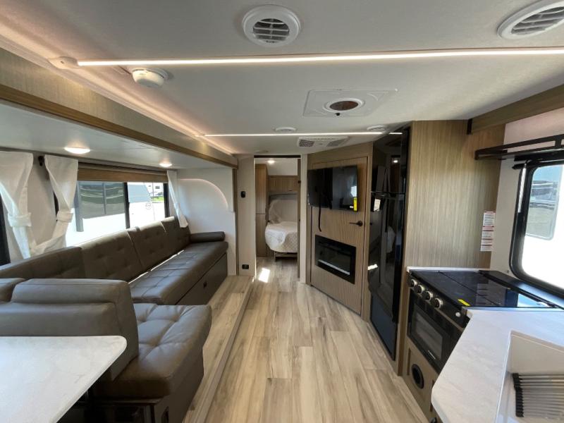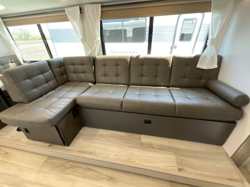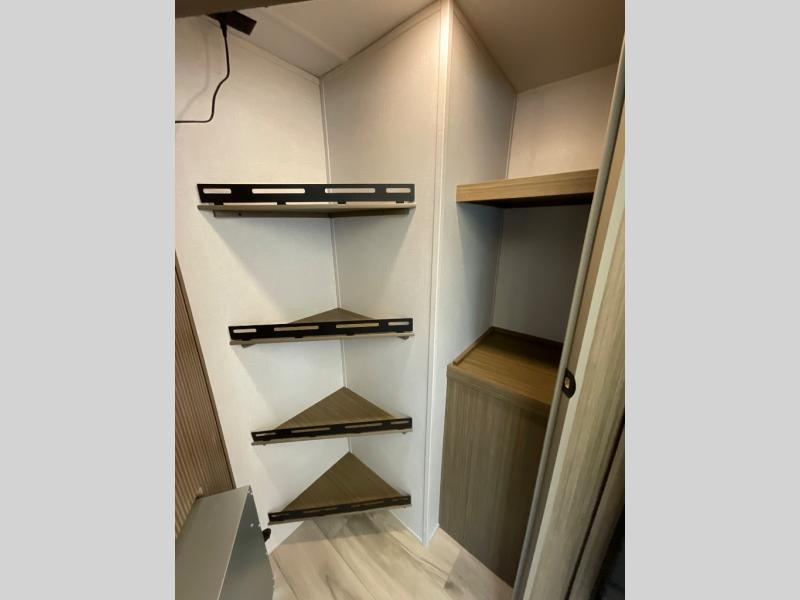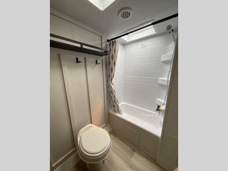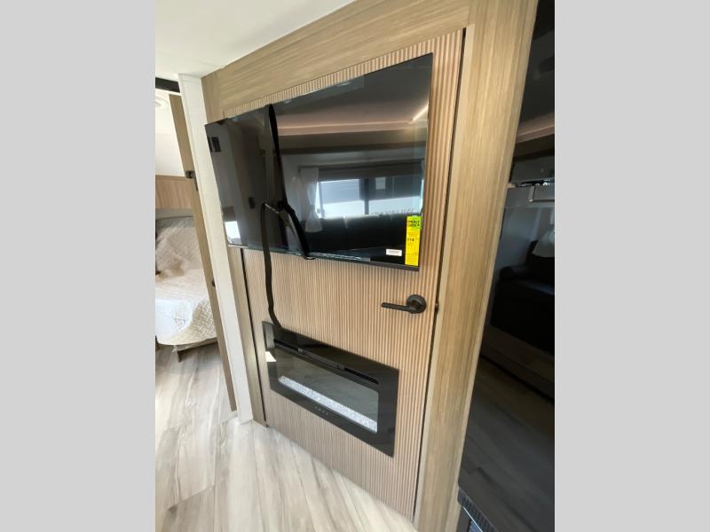 You're sure to make camping memories in this spacious travel trailer! You can sleep four to five people each night thanks to the the custom king bed with Versa Tilt in the front bedroom plus the Versa-Lounge and booth dinette within the large slide out! The full kitchen will let you make meals each day, and you'll appreciate the hidden pantry with shelves behind the fireplace. And don't overlook the full rear bath, complete with a tub/shower and ample counter space for your things.