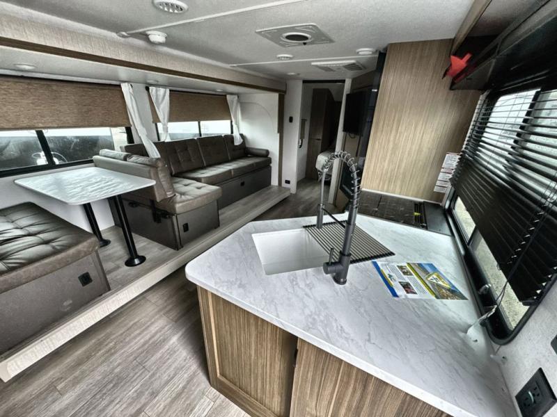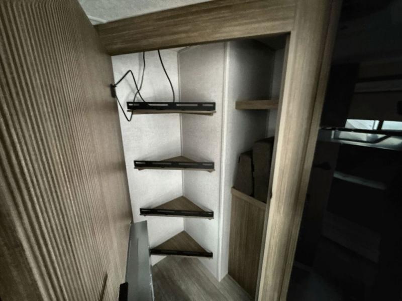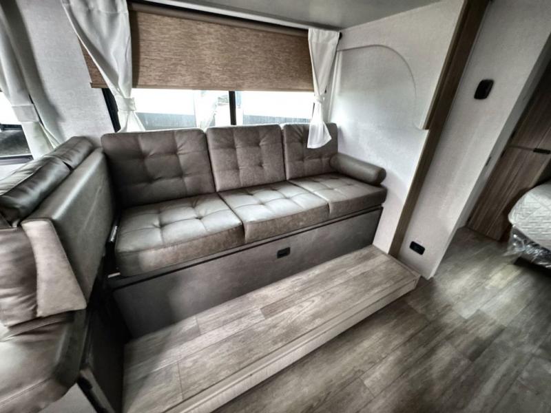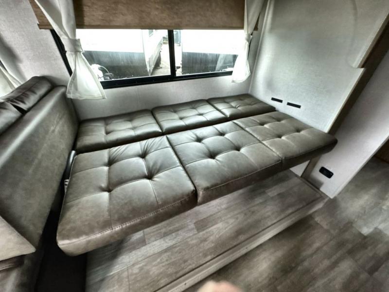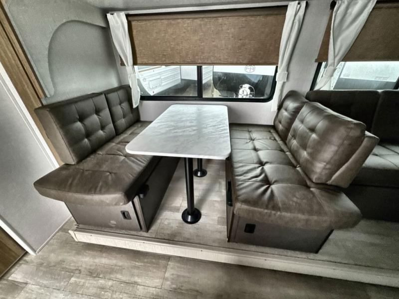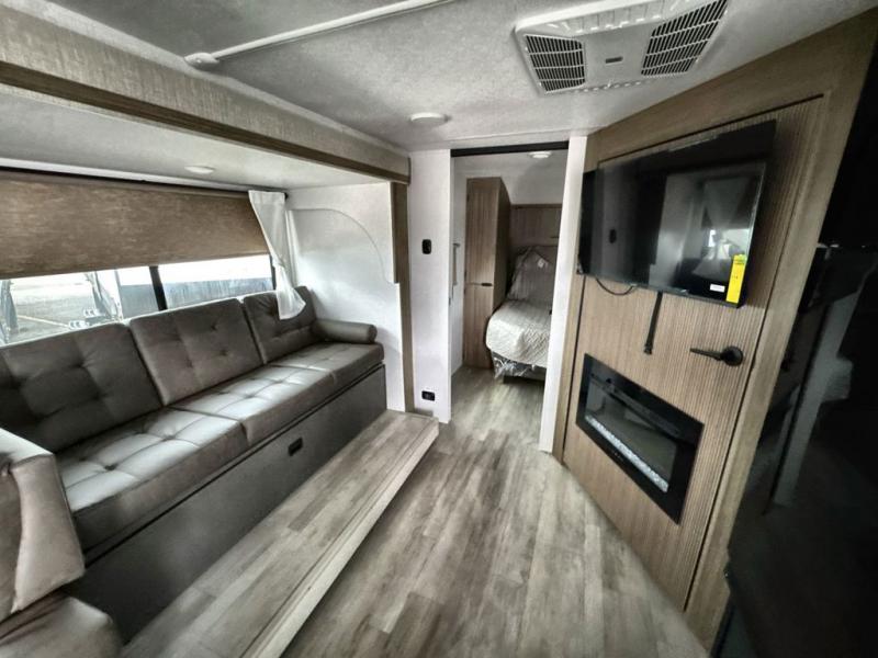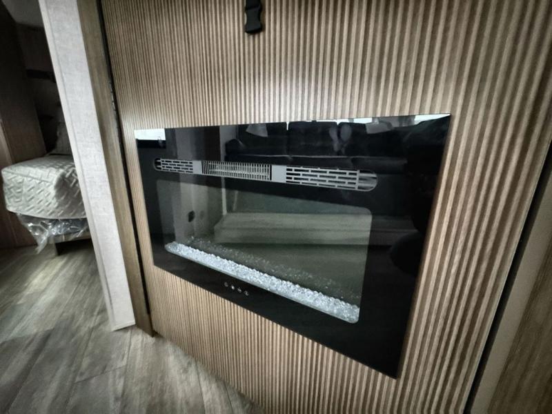 You're sure to make camping memories in this spacious travel trailer! You can sleep four to five people each night thanks to the the custom king bed with Versa Tilt in the front bedroom plus the Versa-Lounge and booth dinette within the large slide out! The full kitchen will let you make meals each day, and you'll appreciate the hidden pantry with shelves behind the fireplace. And don't overlook the full rear bath, complete with a tub/shower and ample counter space for your things.