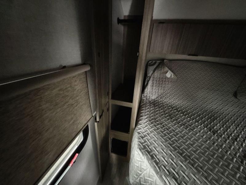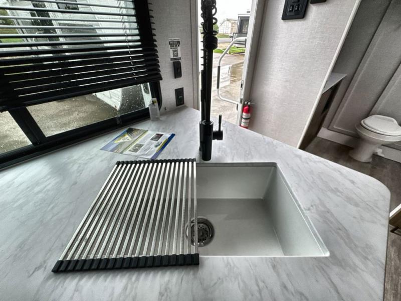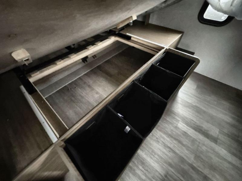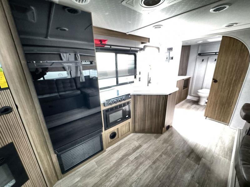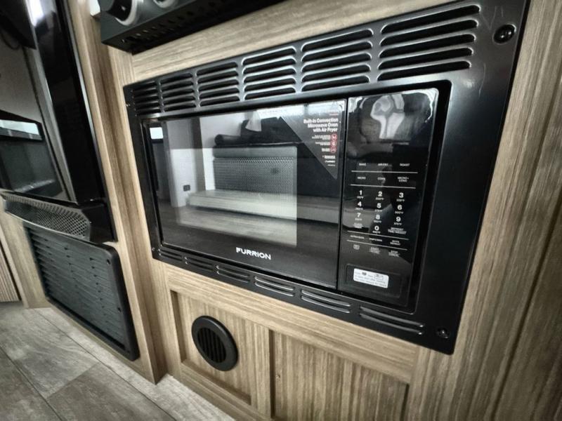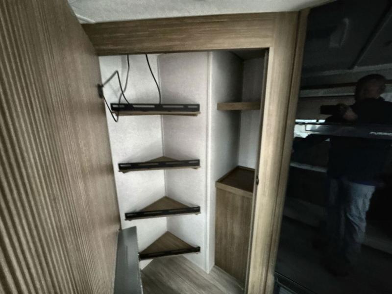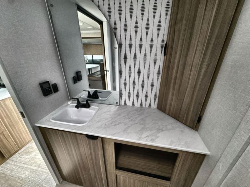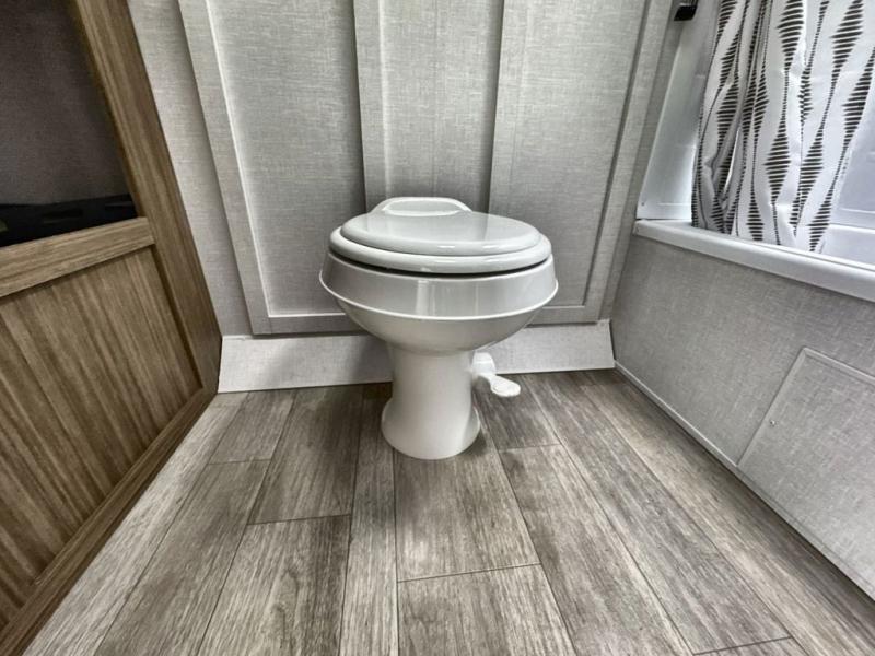 You're sure to make camping memories in this spacious travel trailer! You can sleep four to five people each night thanks to the the custom king bed with Versa Tilt in the front bedroom plus the Versa-Lounge and booth dinette within the large slide out! The full kitchen will let you make meals each day, and you'll appreciate the hidden pantry with shelves behind the fireplace. And don't overlook the full rear bath, complete with a tub/shower and ample counter space for your things.