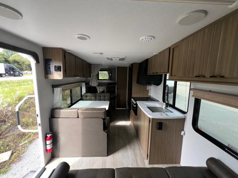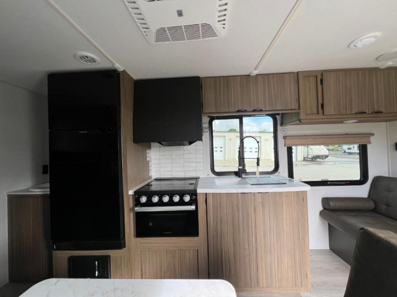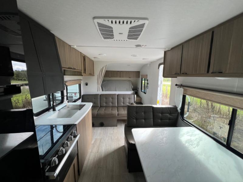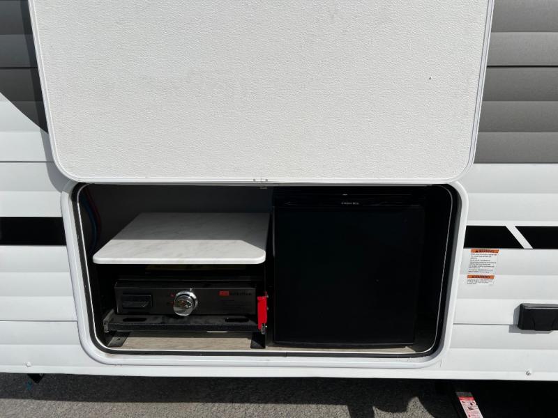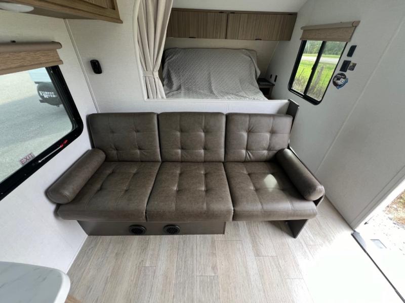 This Wildwood X-Lite travel trailer is packed with features! There is a walk-around custom king bed with Versa-Tilt up at the front that can be sectioned off from the rest of the trailer with a privacy curtain, and the double-size bunks in the back of this trailer will provide you with a compact sleeping space for your little ones. The booth dinette is going to be a great place to sit down together and have a meal when the bugs are too bad outside to sit at the picnic table, and there is also a sofa for relaxation while inside. You will also appreciate the look and function of the seamless countertops in the kitchen, and the 11-cubic foot refrigerator will easily keep your perishable items fresh. There is also an outside camp kitchen option for more choices when cooking for the family.