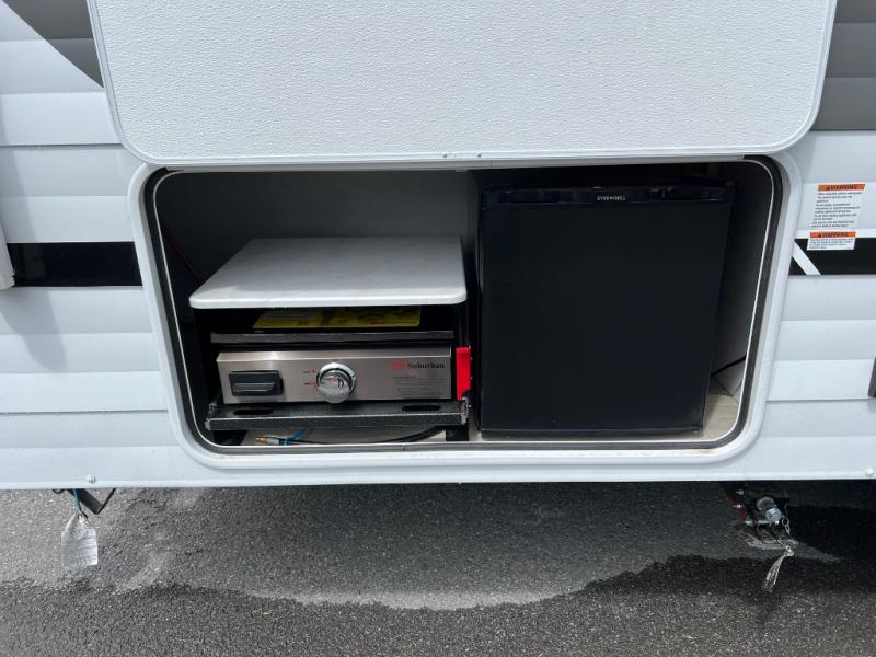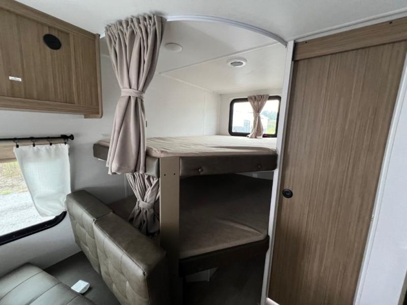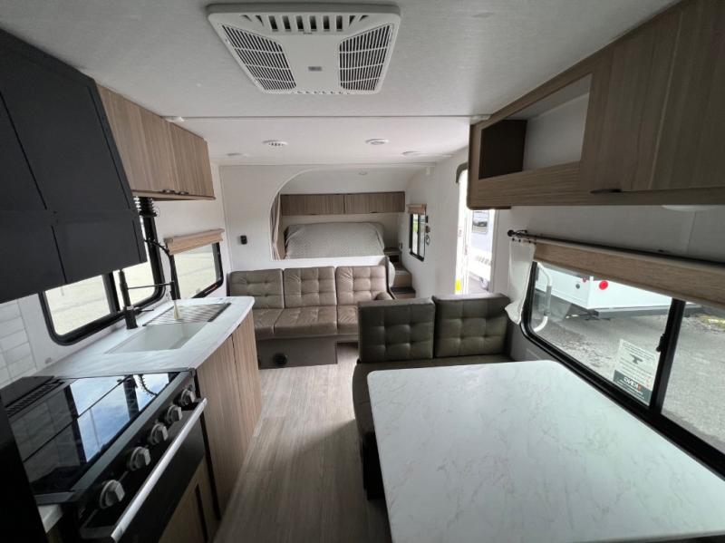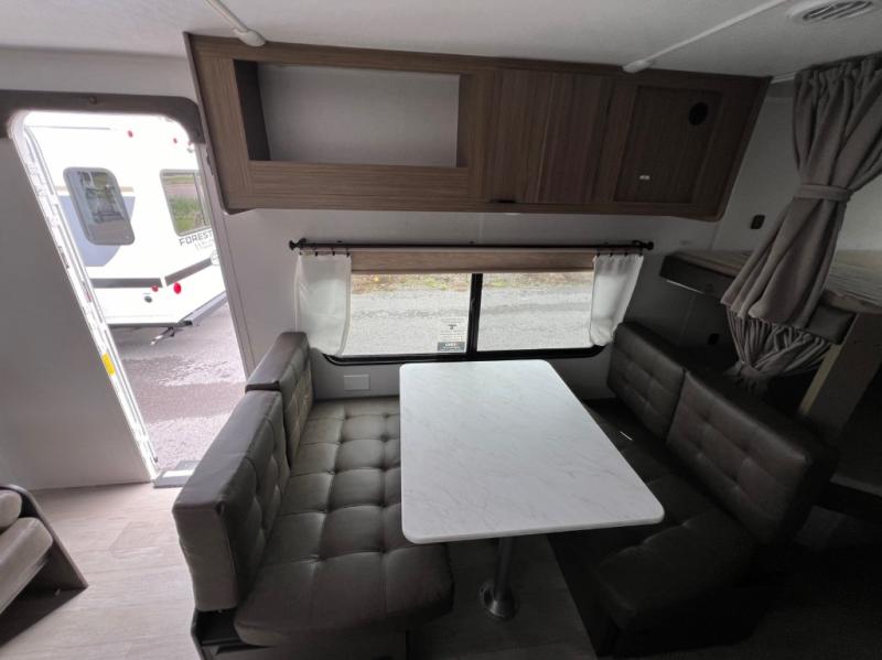 This Wildwood X-Lite travel trailer is packed with features! There is a walk-around custom king bed with Versa-Tilt up at the front that can be sectioned off from the rest of the trailer with a privacy curtain, and the double-size bunks in the back of this trailer will provide you with a compact sleeping space for your little ones. The booth dinette is going to be a great place to sit down together and have a meal when the bugs are too bad outside to sit at the picnic table, and there is also a sofa for relaxation while inside. You will also appreciate the look and function of the seamless countertops in the kitchen, and the 11-cubic foot refrigerator will easily keep your perishable items fresh. There is also an outside camp kitchen option for more choices when cooking for the family.