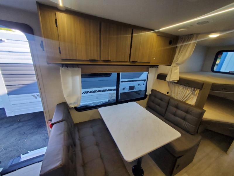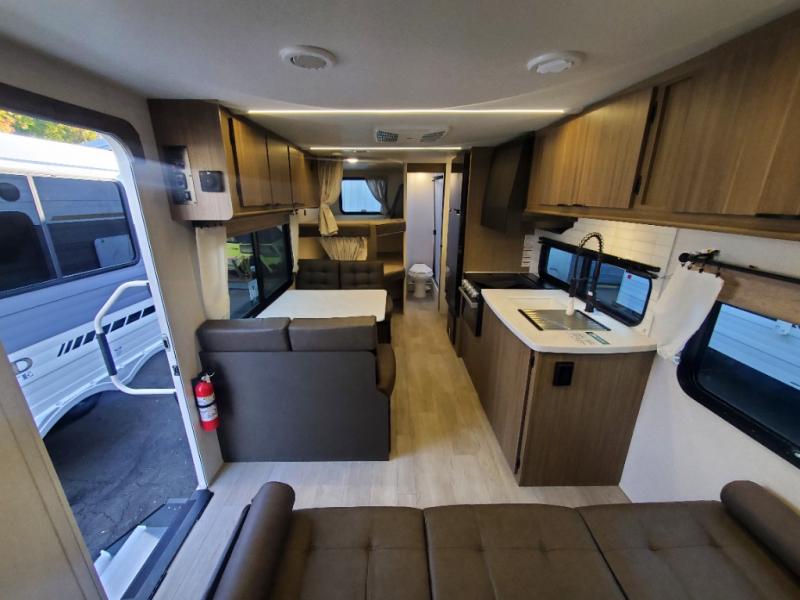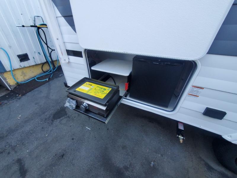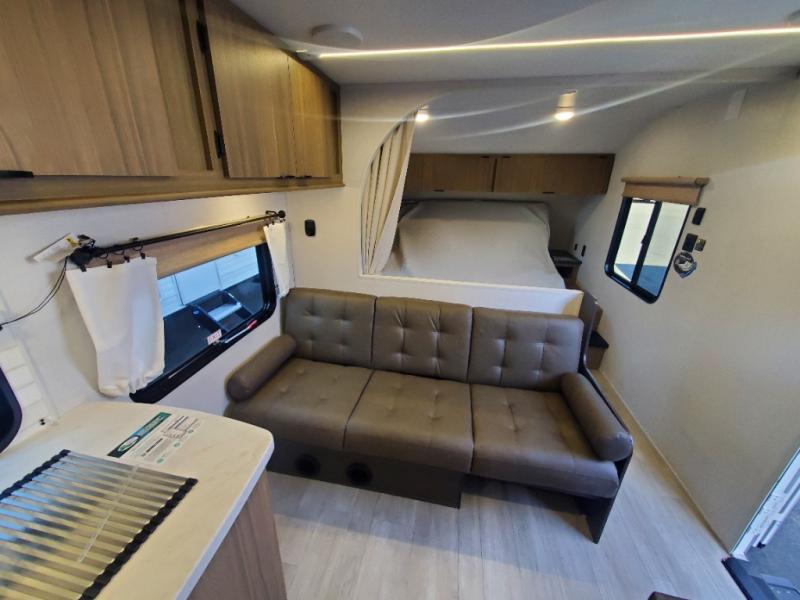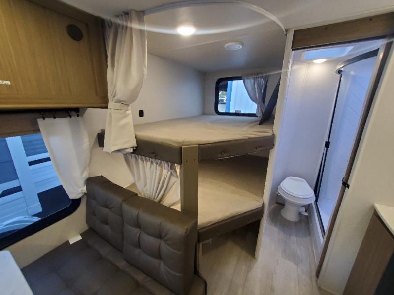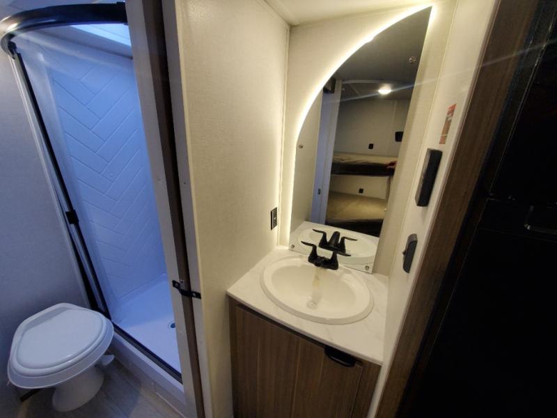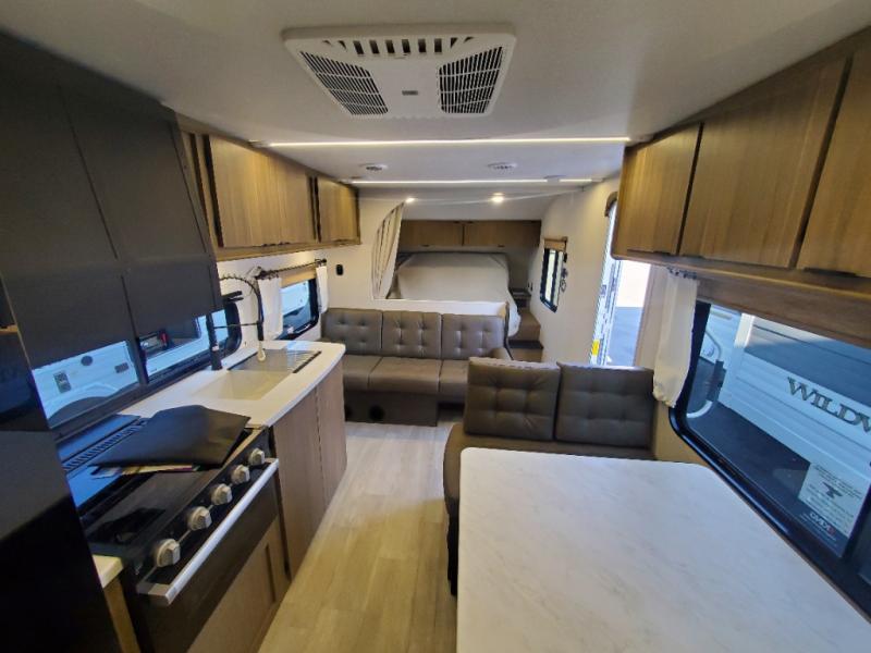 This Wildwood X-Lite travel trailer is packed with features! There is a walk-around custom king bed with Versa-Tilt up at the front that can be sectioned off from the rest of the trailer with a privacy curtain, and the double-size bunks in the back of this trailer will provide you with a compact sleeping space for your little ones. The booth dinette is going to be a great place to sit down together and have a meal when the bugs are too bad outside to sit at the picnic table, and there is also a sofa for relaxation while inside. You will also appreciate the look and function of the seamless countertops in the kitchen, and the 11-cubic foot refrigerator will easily keep your perishable items fresh. There is also an outside camp kitchen option for more choices when cooking for the family.