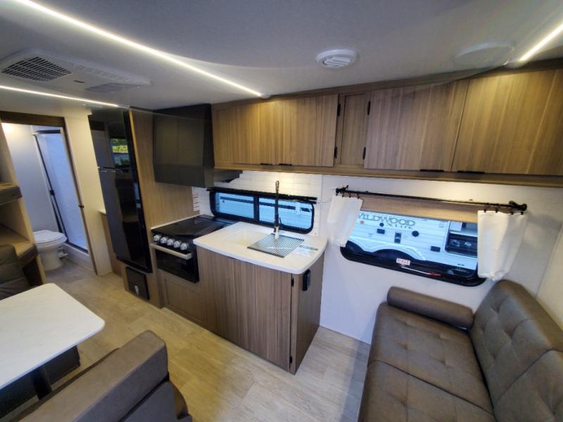 The Forest River Wildwood X-Lite travel trailers are comfortable enough to make any destination feel like home! The Wildwood X-Lite has a Dicor PVC roof membrane, a powder-coated I-beam frame, nitrogen-filled tires, and a cambered chassis as the base for all of its luxurious additions. Within the reliable construction, you will find excellent interior amenities, like the upgraded high-rise spring kitchen faucet, a huge kitchen window, a Bluetooth stereo, and upgraded designer furniture. The Wildwood X-Lite also comes with a pass-through storage compartment for your gear, an upgraded shower head, and a new 60K tankless water heater so you can have hot water when you need it!