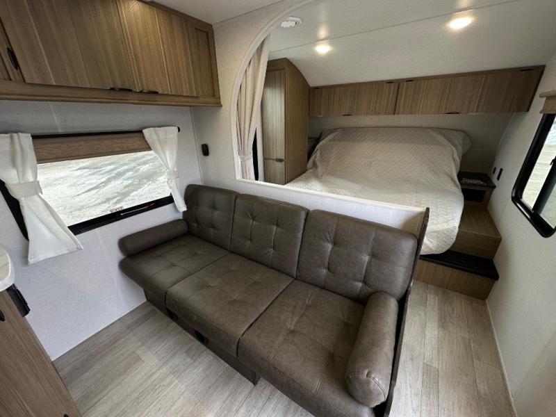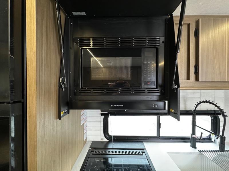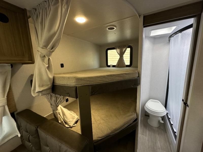 This Wildwood X-Lite travel trailer is packed with features! There is a walk-around custom king bed with Versa-Tilt up at the front that can be sectioned off from the rest of the trailer with a privacy curtain, and the double-size bunks in the back of this trailer will provide you with a compact sleeping space for your little ones. The booth dinette is going to be a great place to sit down together and have a meal when the bugs are too bad outside to sit at the picnic table, and there is also a sofa for relaxation while inside. A full kitchen inside will let you create meals each day, and there is also an outside camp kitchen option for more choices when cooking for the family.