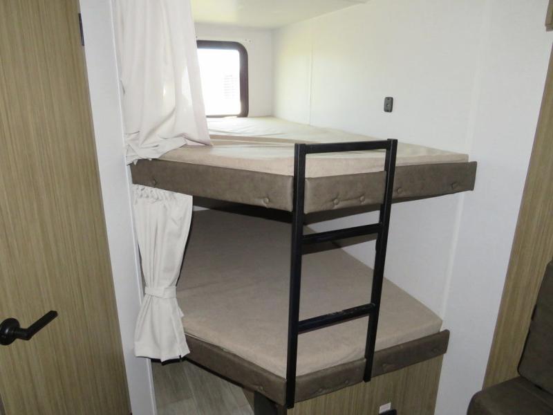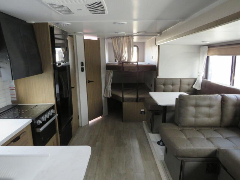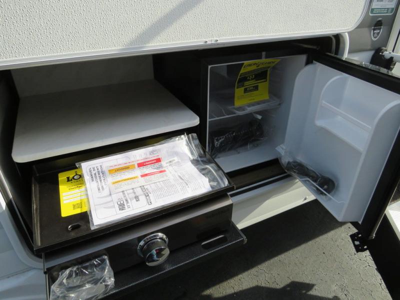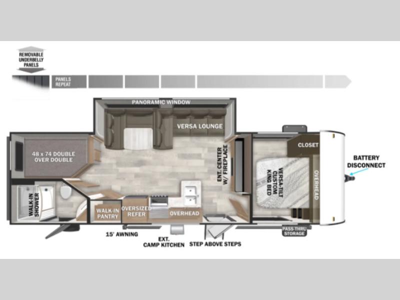 If you need a trailer that will enhance your family getaways, this Wildwood X-Lite travel trailer is it! Because of the double-size bunks in the back and the custom king bed with Versa-Tilt in the front private bedroom, your family can stretch out and sleep comfortably, and the Versa Lounge, which is made up of a U-shaped dinette and sofa, can also transform into extra sleeping space if needed. The whole family will enjoy how accessible the full bathroom is because it contains both an interior and exterior entry door, and the entertainment center with a fireplace is certainly going to enrich your time spent indoors. You will also enjoy the exterior camp kitchen with a griddle for breakfast outdoors!