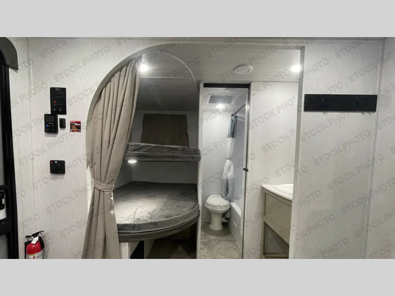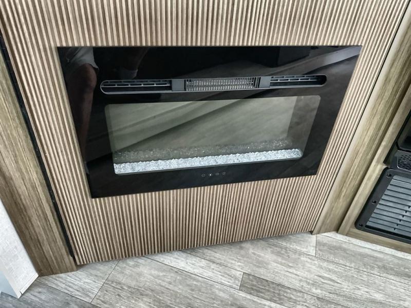 You're sure to make camping memories in this spacious travel trailer! You can easily sleep eight people each night thanks to the double-size bunks, the custom king bed with Versa Tilt in the front bedroom plus the Versa-Lounge within the large slide out! The three burner cooktop and microwave oven will let you make meals each day, and you'll appreciate the hidden pantry with shelves behind the fireplace. There is also a booth dinette where you can dine together or play a game of cards after dinner is cleaned up, or you may just find yourselves outdoors under the 16' power awning with LED lights. And don't overlook the full bath, complete with a tub/shower that will make bath time easier if you have little ones.