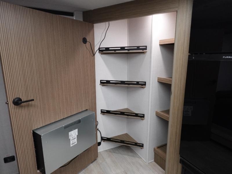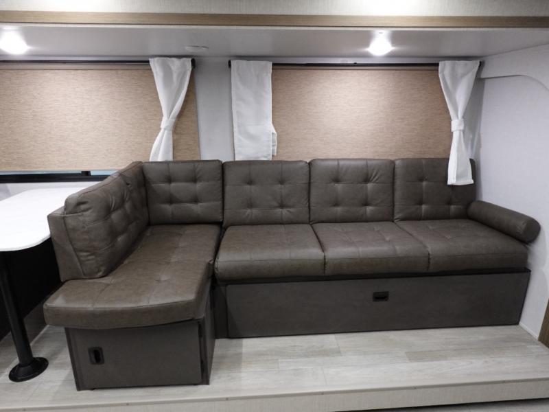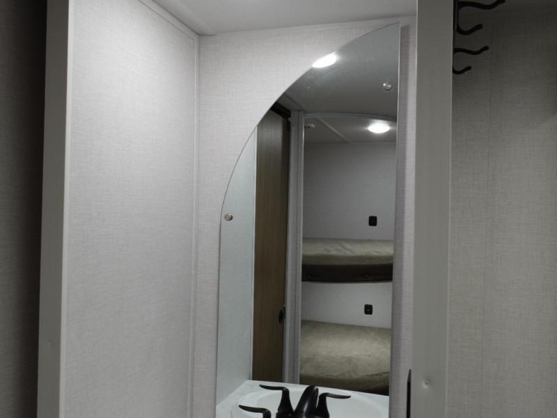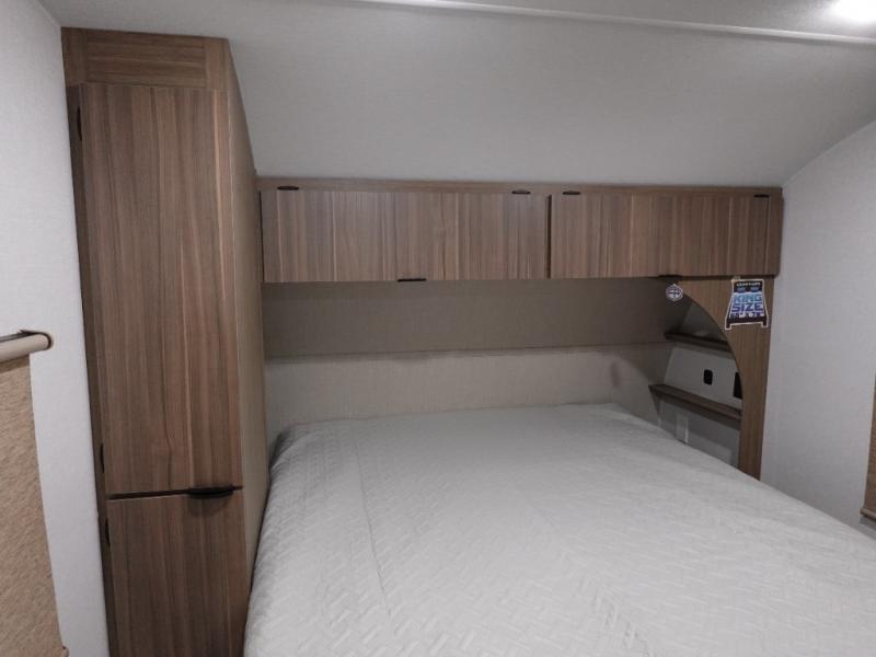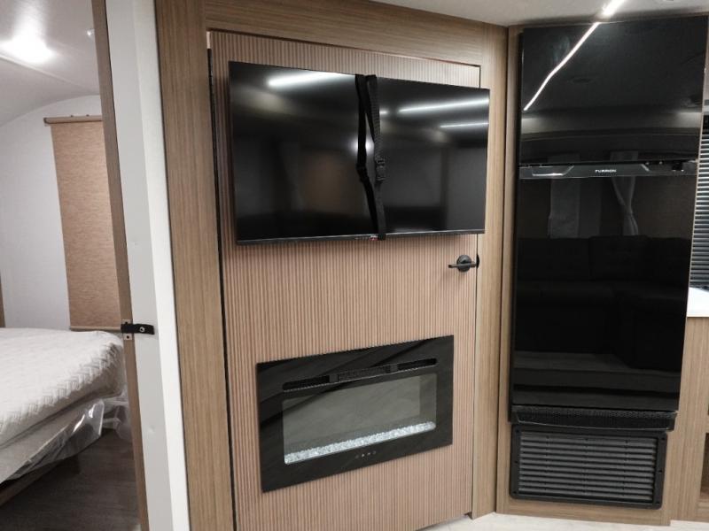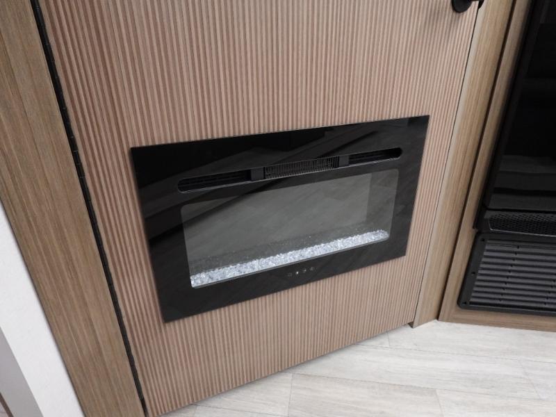 You're sure to make camping memories in this spacious travel trailer! You can easily sleep eight people each night thanks to the double-size bunks, the custom king bed with Versa Tilt in the front bedroom plus the Versa-Lounge within the large slide out! The full kitchen will let you make meals each day, and you'll appreciate the hidden pantry with shelves behind the fireplace. There is also a booth dinette where you can dine together or play a game of cards after dinner is cleaned up, or you may just find yourselves outdoors under the 16' awning. And don't overlook the full bath, complete with a tub/shower that will make bath time easier if you have little ones.