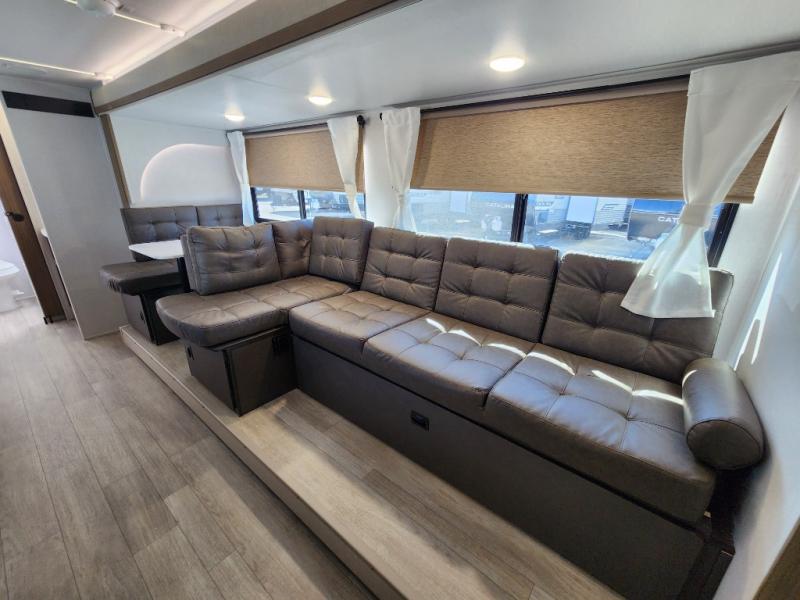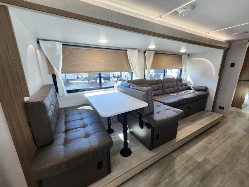 You're sure to make camping memories in this spacious travel trailer! You can easily sleep eight people each night thanks to the double-size bunks, the custom king bed with Versa Tilt in the front bedroom plus the Versa-Lounge within the large slide out! The full kitchen will let you make meals each day, and you'll appreciate the hidden pantry with shelves behind the fireplace. There is also a booth dinette where you can dine together or play a game of cards after dinner is cleaned up, or you may just find yourselves outdoors under the 16' awning. And don't overlook the full bath, complete with a tub/shower that will make bath time easier if you have little ones.