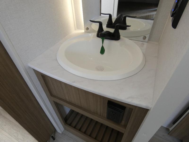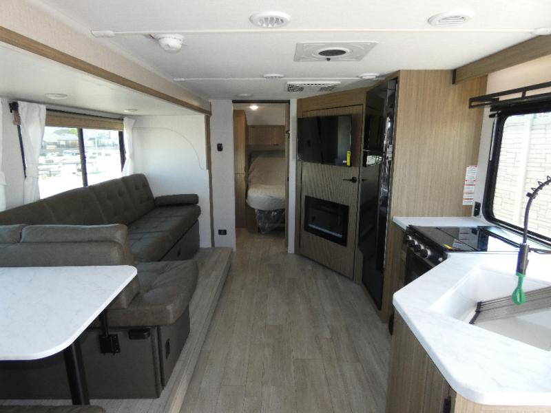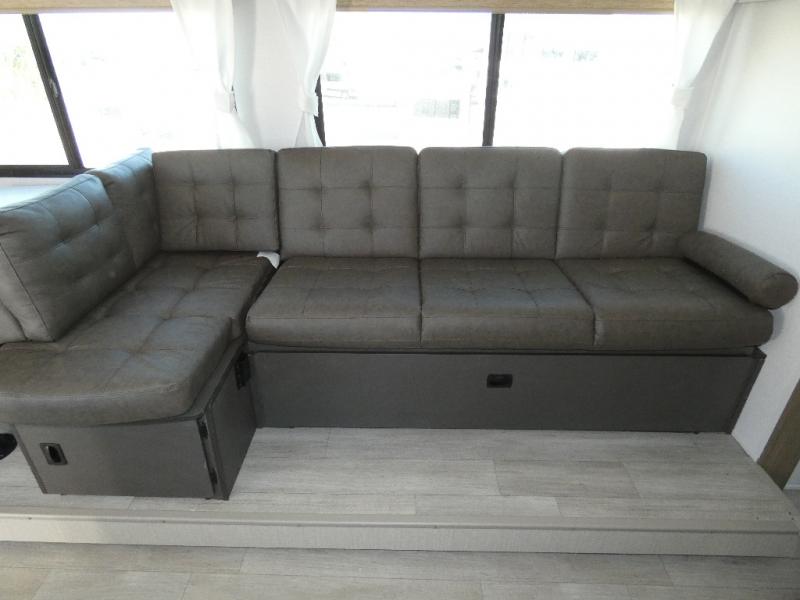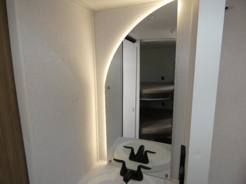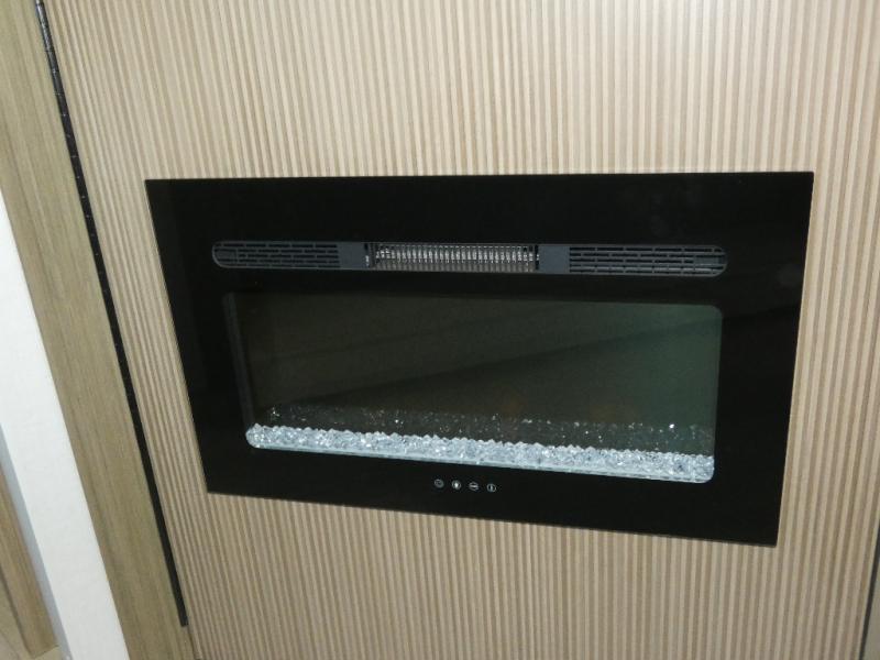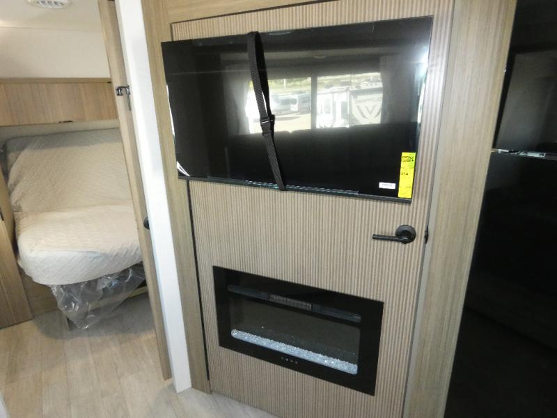 You're sure to make camping memories in this spacious travel trailer! You can easily sleep eight people each night thanks to the double-size bunks, the custom king bed with Versa Tilt in the front bedroom plus the Versa-Lounge within the large slide out! The full kitchen will let you make meals each day, and you'll appreciate the hidden pantry with shelves behind the fireplace. There is also a booth dinette where you can dine together or play a game of cards after dinner is cleaned up, or you may just find yourselves outdoors under the 16' awning. And don't overlook the full bath, complete with a tub/shower that will make bath time easier if you have little ones.