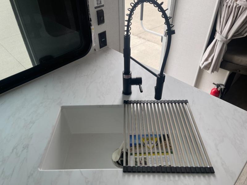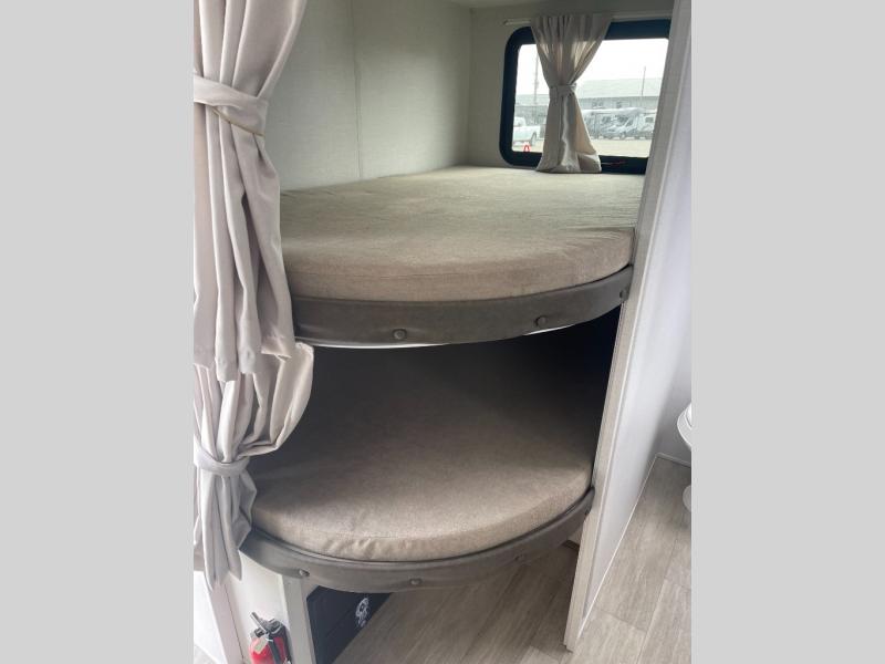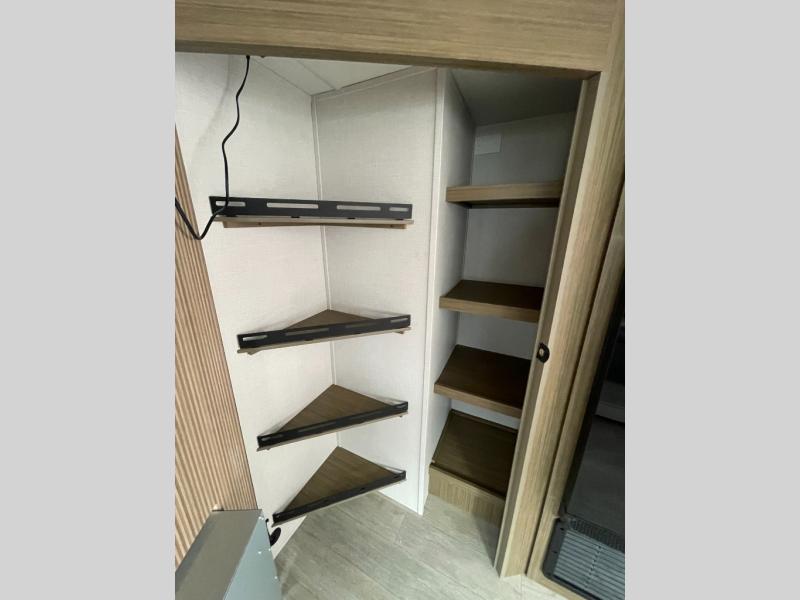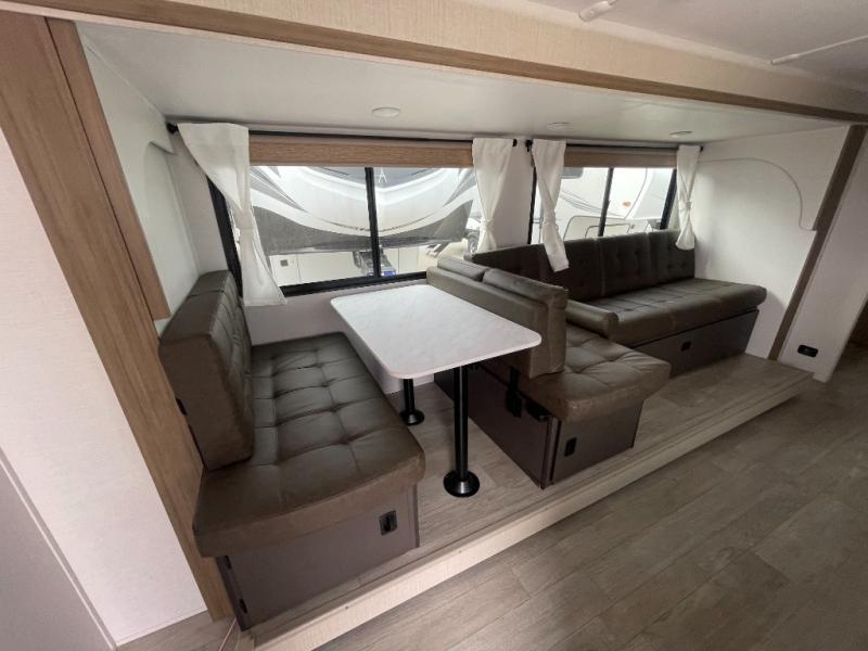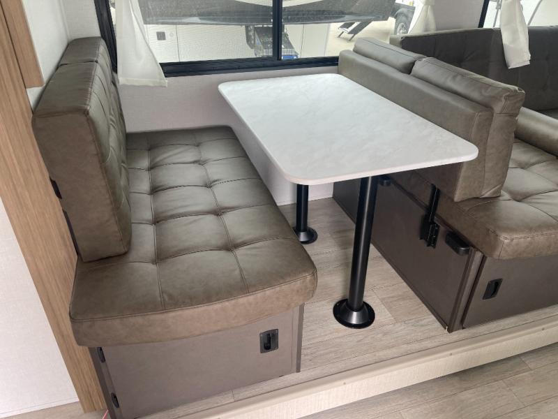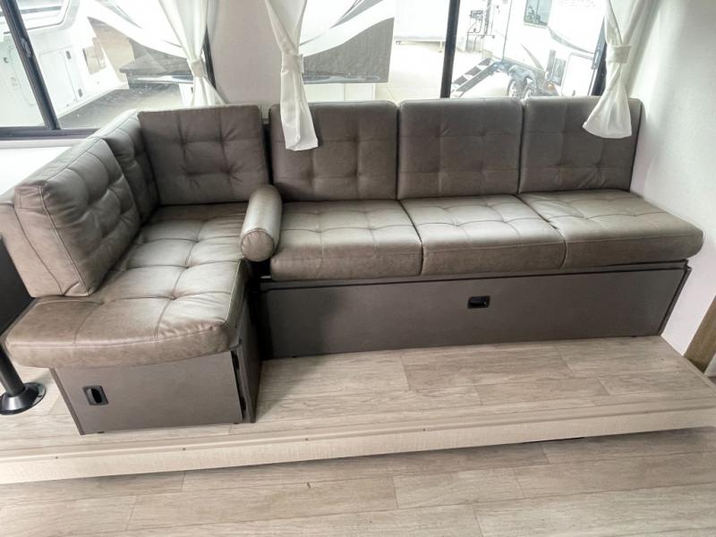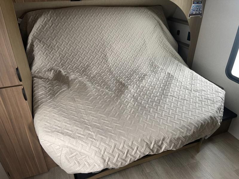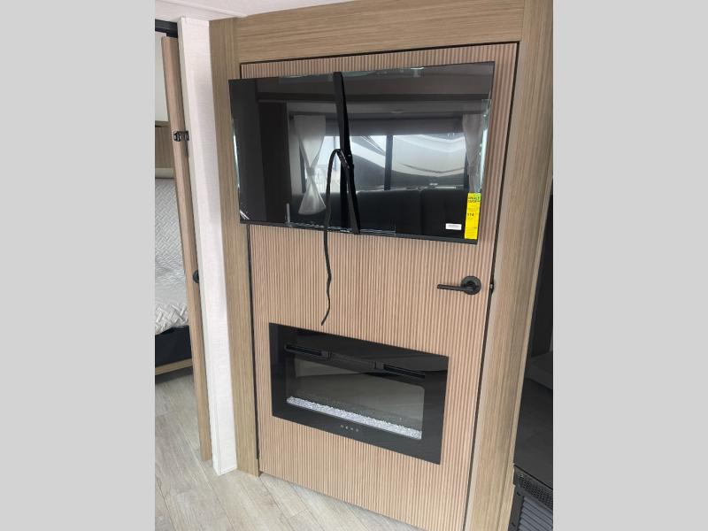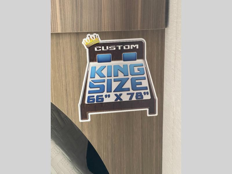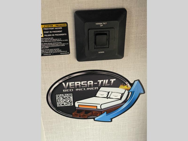 You're sure to make camping memories in this spacious travel trailer! You can easily sleep eight people each night thanks to the double-size bunks, the custom king bed with Versa Tilt in the front bedroom plus the Versa-Lounge within the large slide out! The full kitchen will let you make meals each day, and you'll appreciate the hidden pantry with shelves behind the fireplace. There is also a booth dinette where you can dine together or play a game of cards after dinner is cleaned up, or you may just find yourselves outdoors under the 16' awning. And don't overlook the full bath, complete with a tub/shower that will make bath time easier if you have little ones.