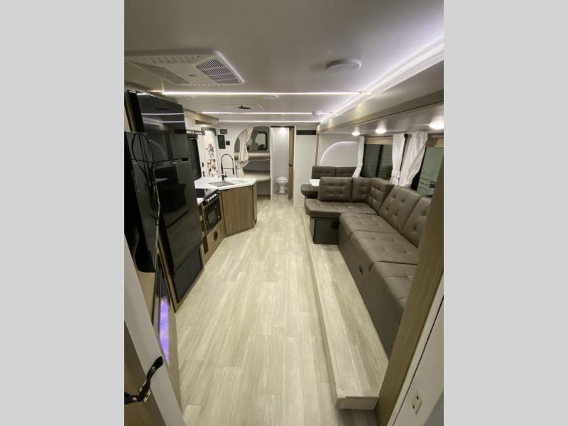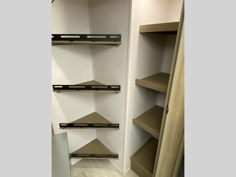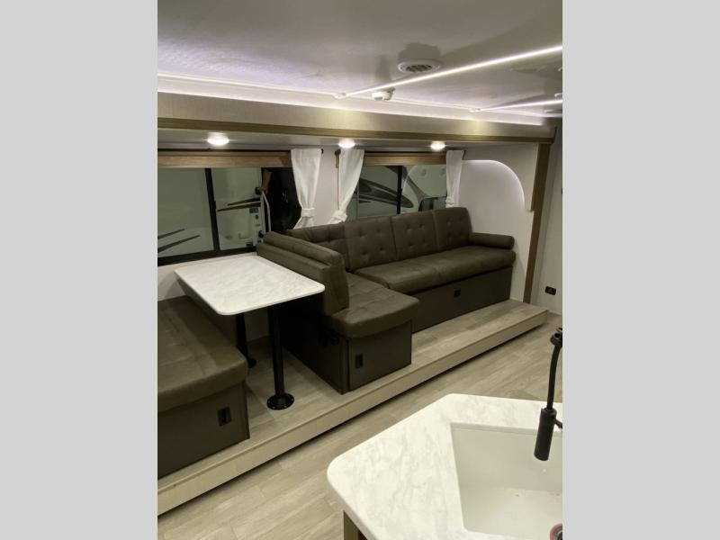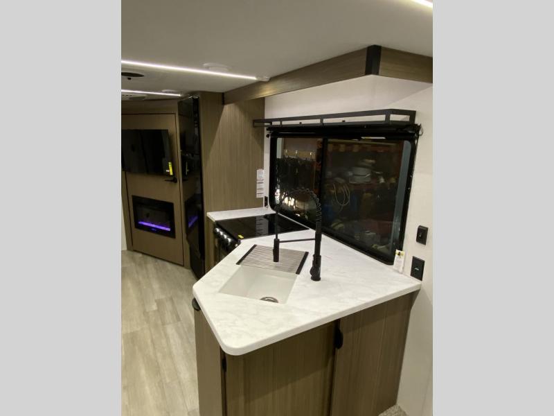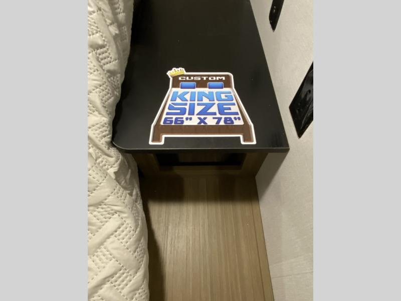 You're sure to make camping memories in this spacious travel trailer! You can easily sleep eight people each night thanks to the double-size bunks, the custom king bed with Versa Tilt in the front bedroom plus the Versa-Lounge within the large slide out! The full kitchen will let you make meals each day, and you'll appreciate the hidden pantry with shelves behind the fireplace. There is also a booth dinette where you can dine together or play a game of cards after dinner is cleaned up, or you may just find yourselves outdoors under the 16' awning. And don't overlook the full bath, complete with a tub/shower that will make bath time easier if you have little ones.