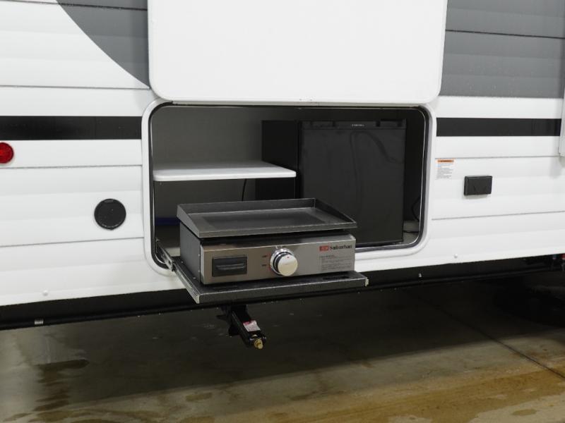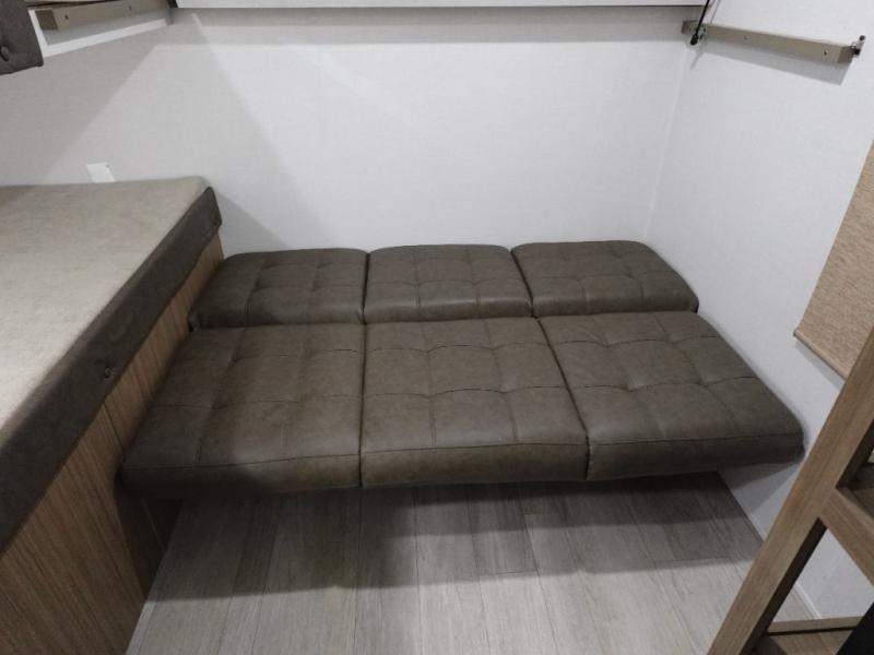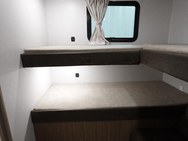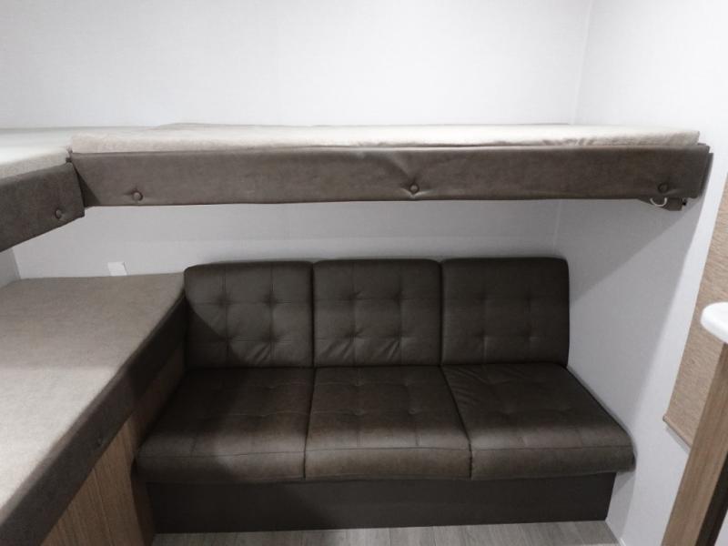 If you like to travel with a large crew, choose this Wildwood X-Lite travel trailer! This trailer has two private sleeping spaces with a private bedroom up front and a private bunkhouse in the back. Not only does the bunkhouse have three bunk beds, but it also has a closet for storage and a jiffy sofa for lounging. In the main living area, there is a large slide that holds the U-shaped dinette and sofa. These pieces of furniture are a part of the Versa Lounge, and you can customize them to function as you need them to. The panoramic windows surround the dinette and sofa so that you can take in the scenic views while you relax. You even have an outdoor camp kitchen to make it more convenient.