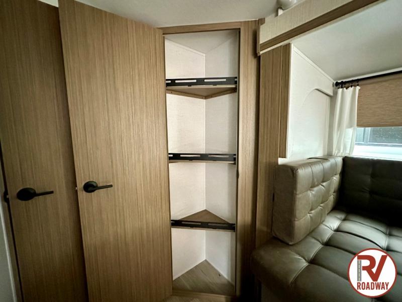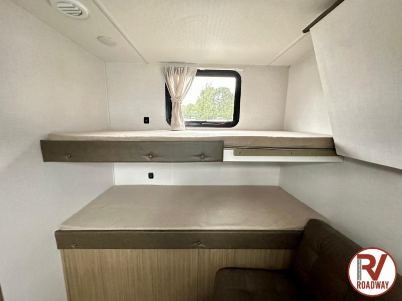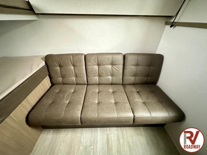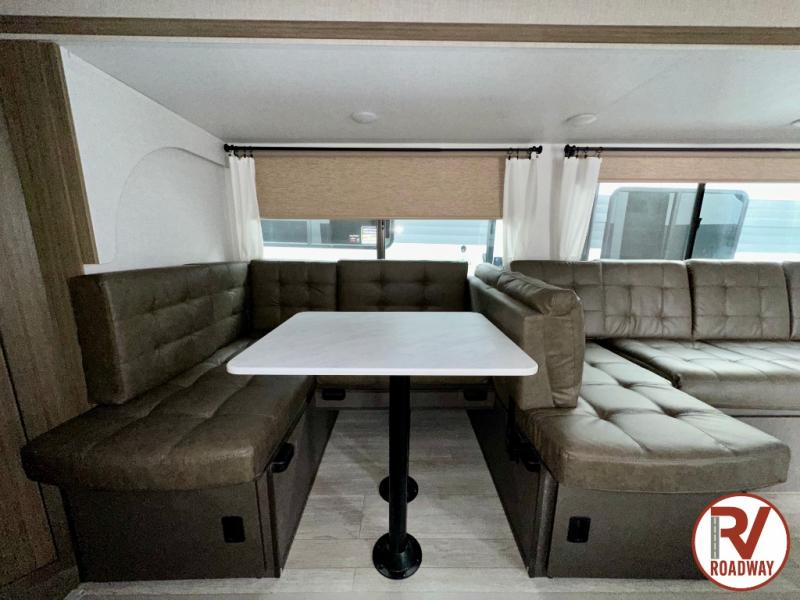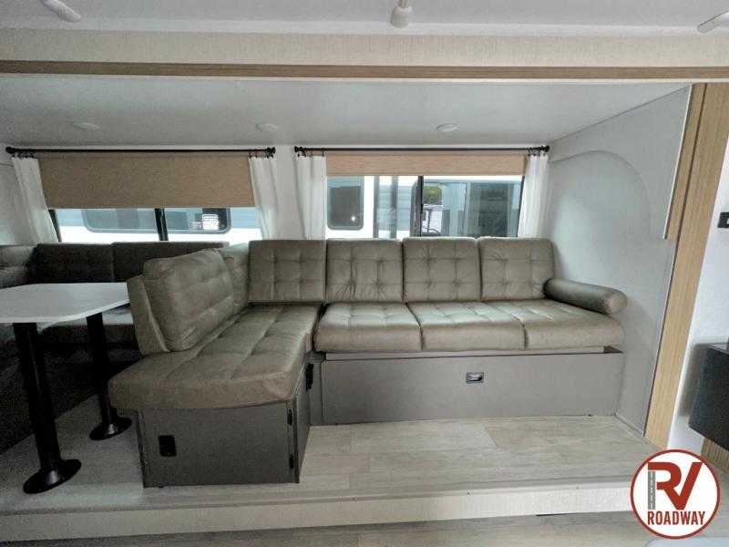 If you like to travel with a large crew, choose this Wildwood X-Lite Platinum trailer! This trailer has two private sleeping spaces with a private bedroom up front and a private bunkhouse in the back. Not only does the bunkhouse have three bunk beds, but it also has a closet for storage and a jiffy sofa for lounging. In the main living area, there is a large slide that holds the U-shaped dinette and sofa. These pieces of furniture are a part of the Versa Lounge, and you can customize them to function as you need them to. The panoramic windows surround the dinette and sofa so that you can take in the scenic views while you relax. You even have an outdoor camp kitchen to make it more convenient.