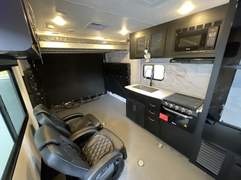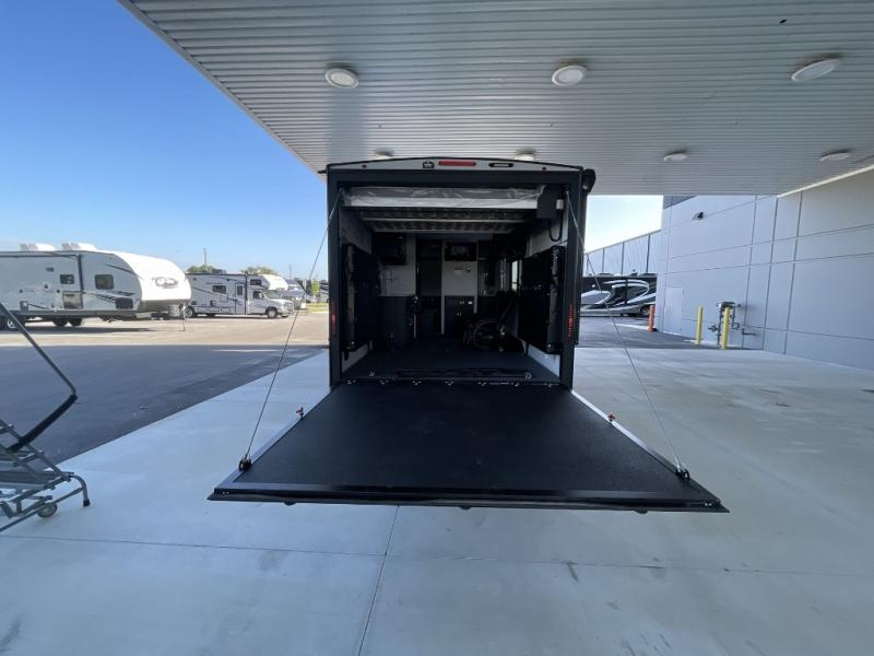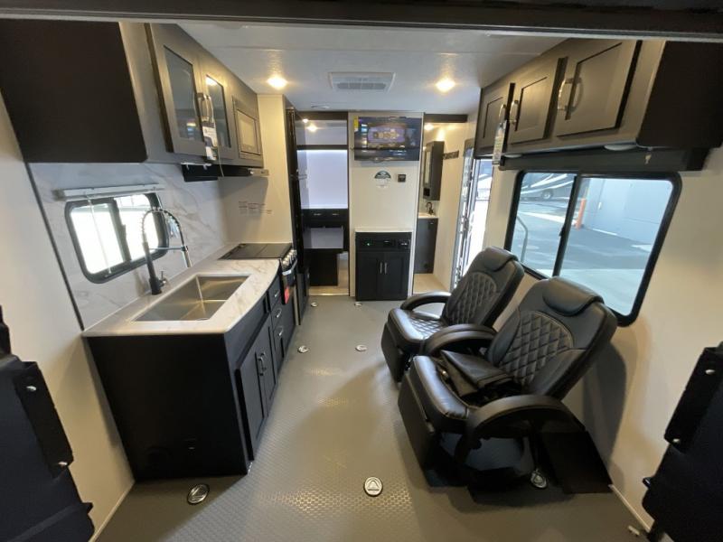 You can have the best of both worlds with this toy hauler; a little work and a little play! Once you unload your bikes from the ramp door, relax on the roll-over sofas while the chef of your group prepares lunch on the three burner cooktop. There are also two Euro recliners and an entertainment center that will make it feel more like home. The dual entry bath will create a master suite you are sure to love. Here, you will sleep soundly on the queen bed slide out, and there is a dresser to store your clothes for the week. It's time to load up and head out!