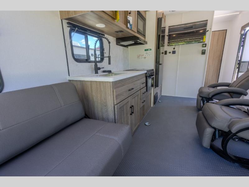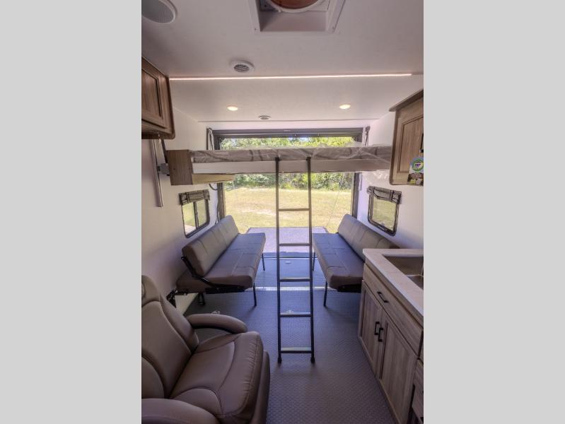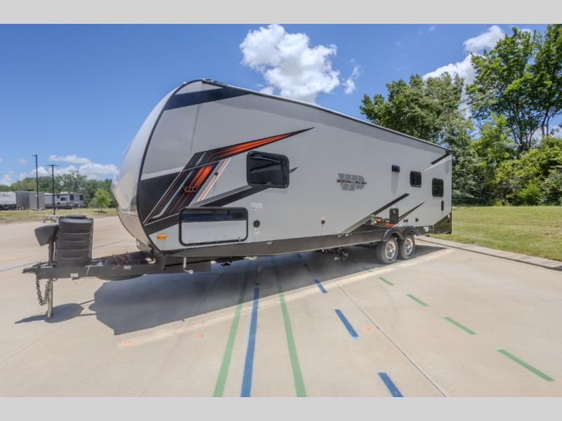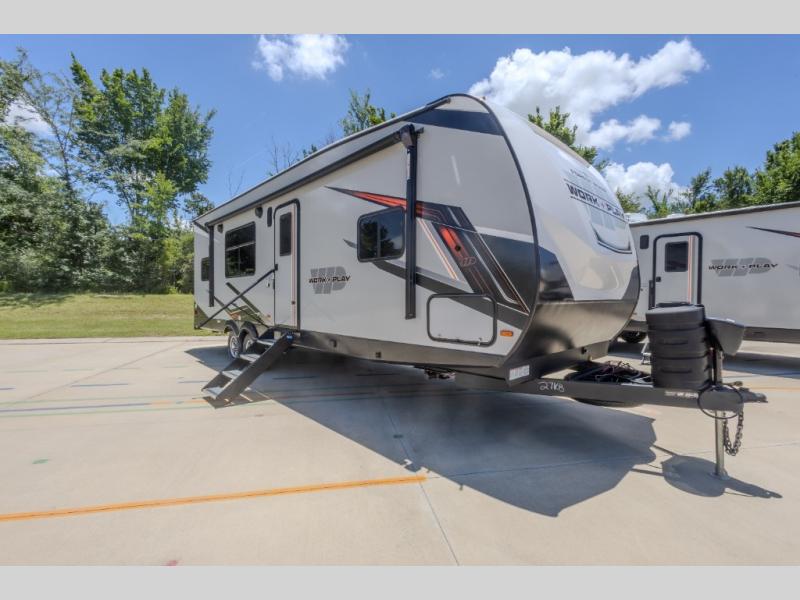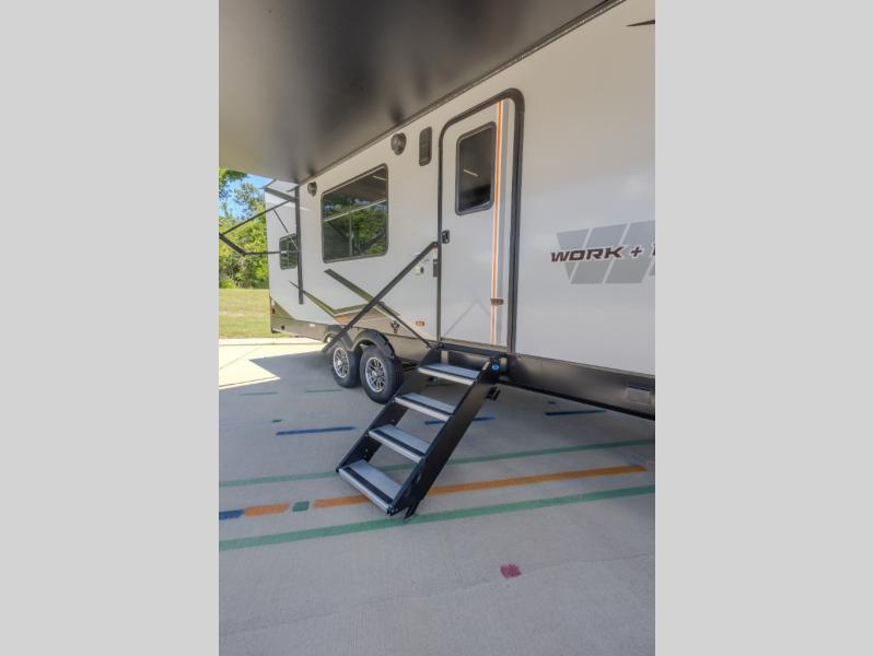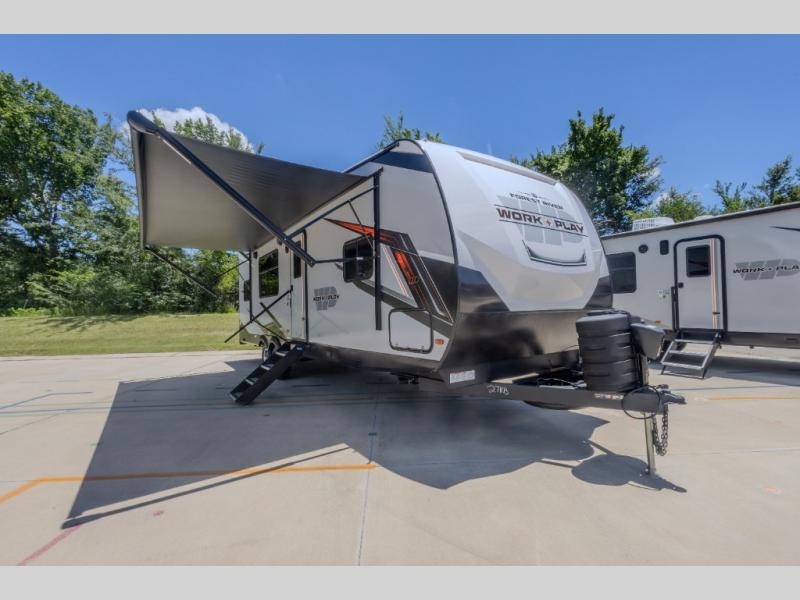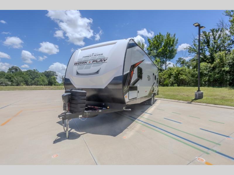 Each Work and Play toy hauler by Forest River is built tough with a mega rail powder coated chassis, a one-piece Tufflex PVC roof membrane, and a fiberglass front cap with rock guard. You will find many convenient features, such as a Winegard Air 360 and TV antenna, an outside spray port, and slam latch door catches to store your riding gear. These toy haulers also include hidden hinge cabinets and doors, USB charging ports in multiple locations, a tankless water heater, plus many more amenities!