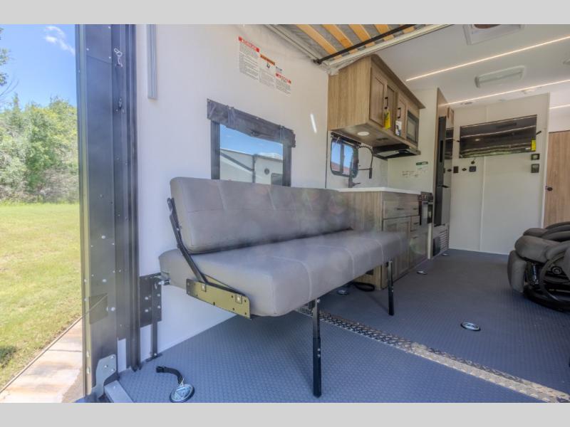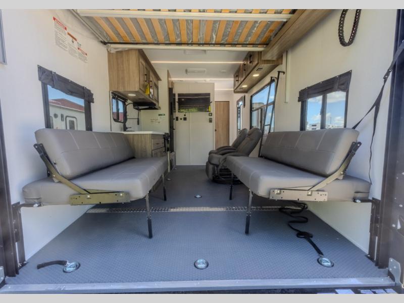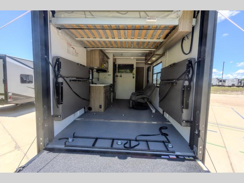 This high profile toy hauler is the one you've been looking for! You can easily sleep six people since it includes two roll-over sofas and a queen bed electric lift, along with the king bed in the master. The dual entry bath is convenient for everyone, and you'll find storage space throughout for all your belongings. The kitchen includes everything you need to prepare a meal after trail riding, including a three burner cooktop, a microwave oven, plus a 12V refrigerator for cold drinks and perishables. You can choose additional optional equipment with this model, like the optional 5.5K Onan generator, the optional ramp door party patio kit, or the optional second 15K BTU A/C!