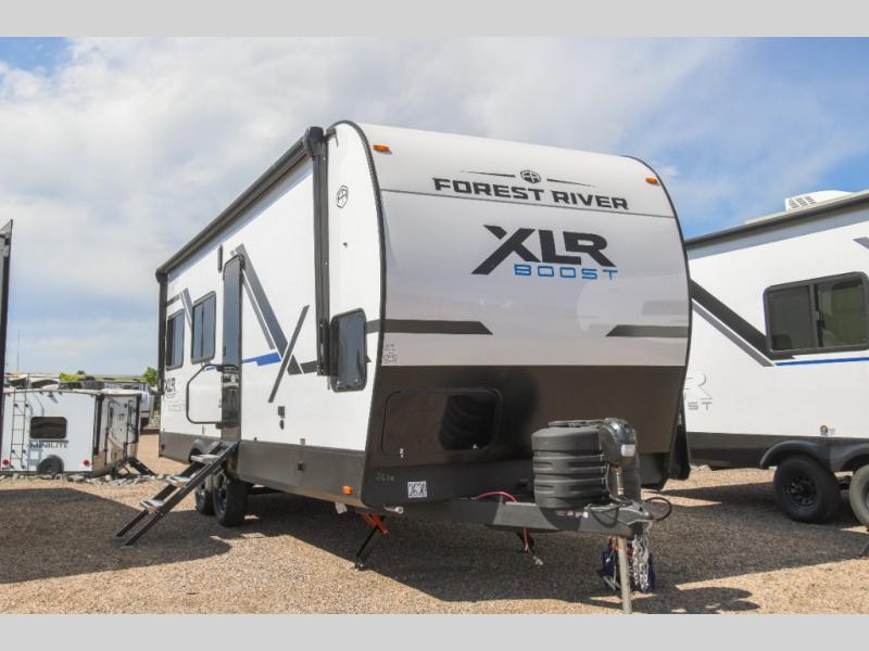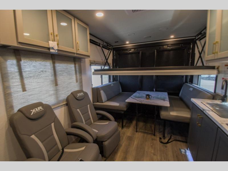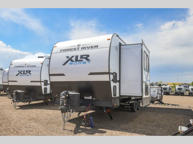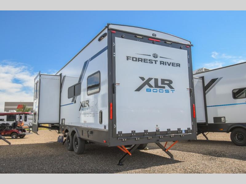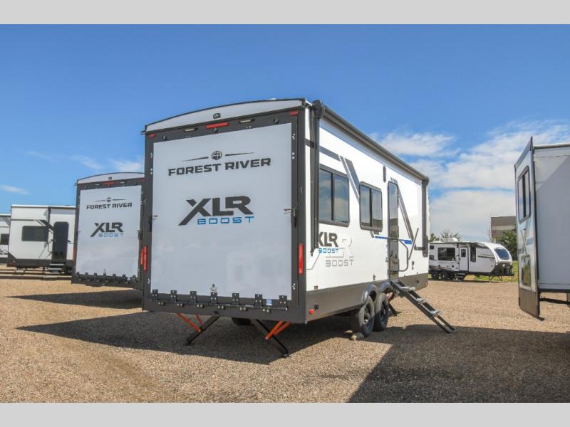 Boost into action camping with one of these Forest River XLR Boost fifth wheel toy haulers or travel trailer toy haulers! The 8' 6" wide body design not only provides ample interior space, but also packs in all of the luxurious features to make your trips great. There is Freon rigid urethane spray foam roof insulation and sidewall construction, along with fiberglass flooring insulation, and roof attic vents within the mandatory Climate Comfort Package so you can camp all year around. The Convenience Package is also mandatory, and includes a tankless water heater, back up camera prep, a 15K BTU main roof A/C, and more features to make each trip accommodating. You will love the decorative vinyl flooring and decorative kitchen backsplash included in the REV Package, as well as a residential style kitchen faucet, a large bath vent fan, and industrial garage flooring that will withstand your many adventures. A Renewable Energy Package includes a 200W roof mounted solar panel for off-grid capabilities, and there is an external fuel cell with a pump that will keep your toys ready to go!