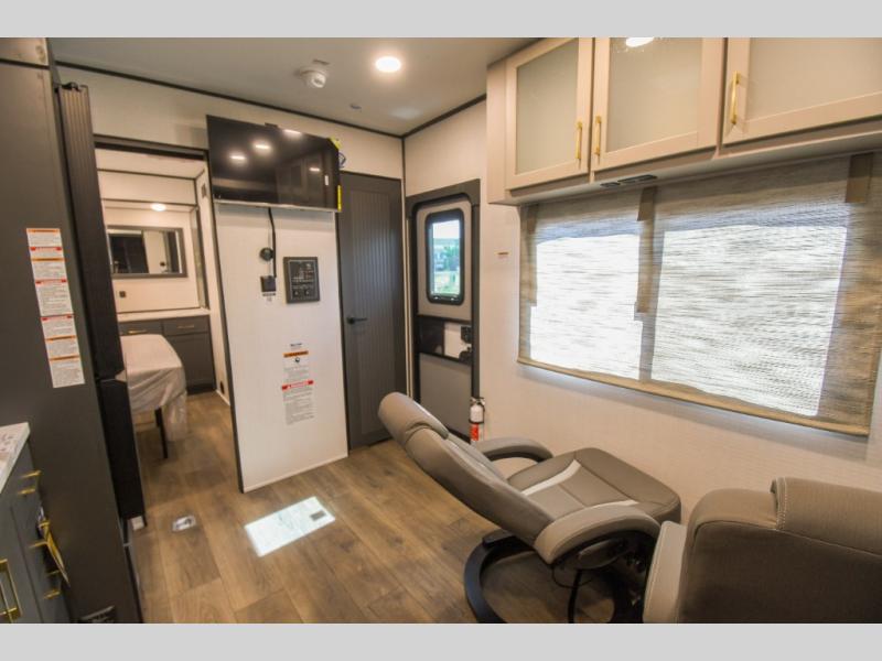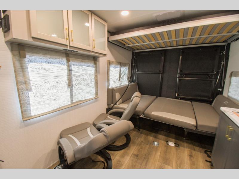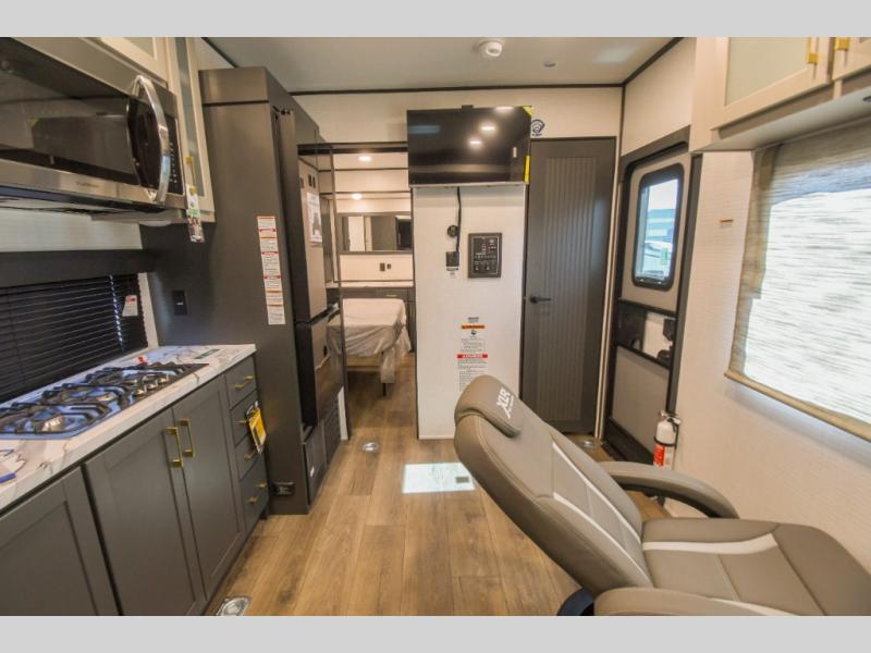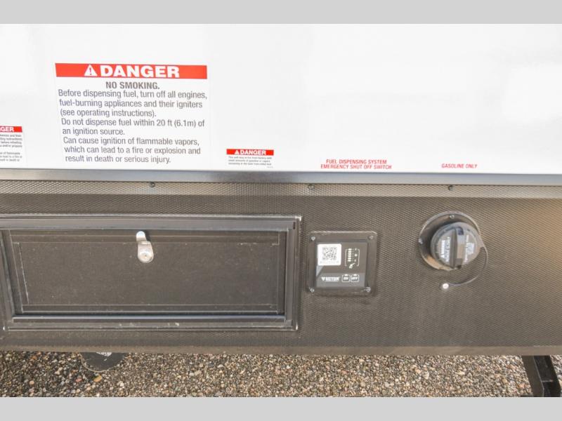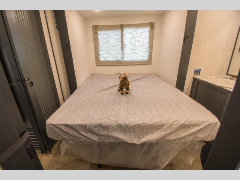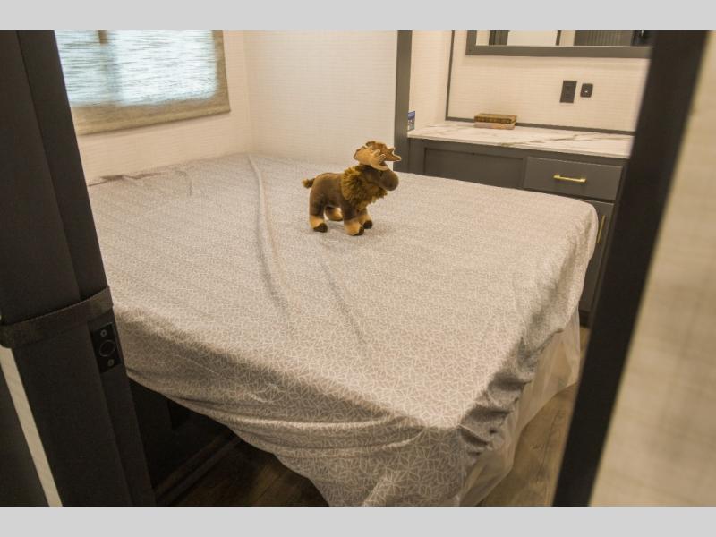 Bring your favorite off-road toys with you in this toy hauler to your favorite camping spots! The 14' garage includes opposing sofa sleepers with a removable dinette table to create a queen bed sleeping area, plus a Euro bed above for your guests to sleep on. The front of this toy hauler is shared with the master bedroom and dual entry bath you are sure to love, pus there is a dresser with a mirror to get ready each day. The exterior has many features you will love like the docking station, outside TV prep area, 15' power awning, and the outside storage areas!