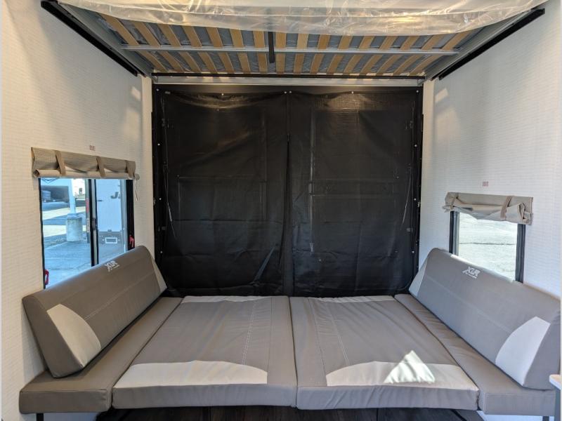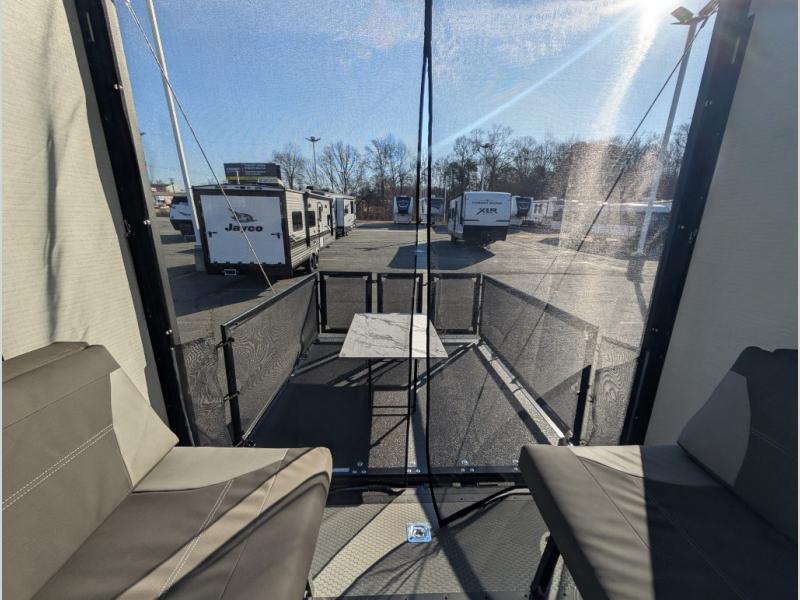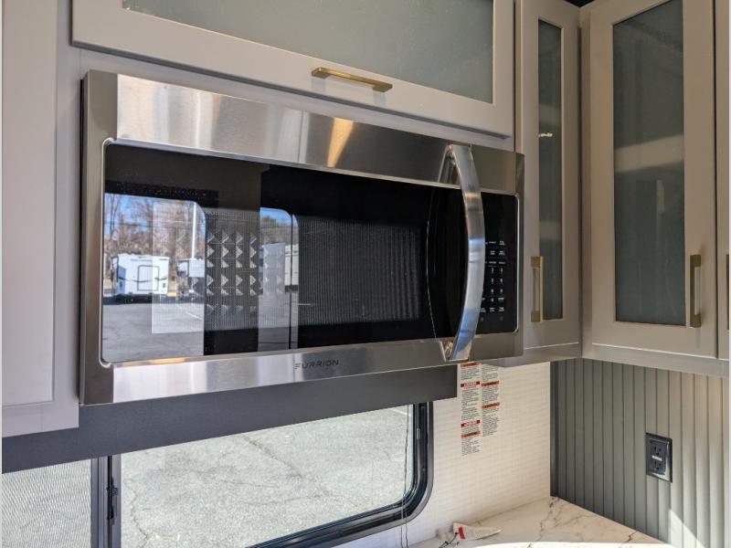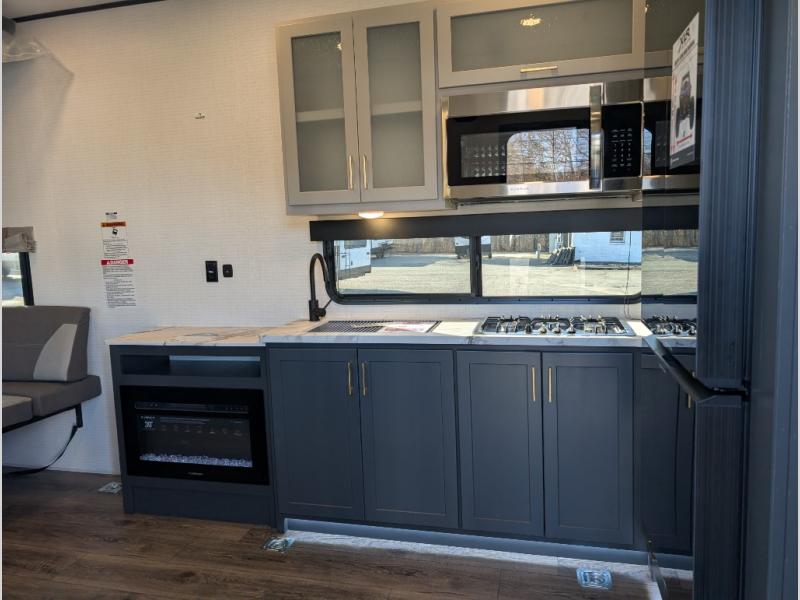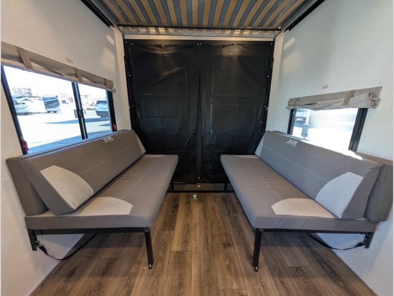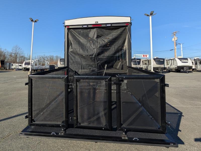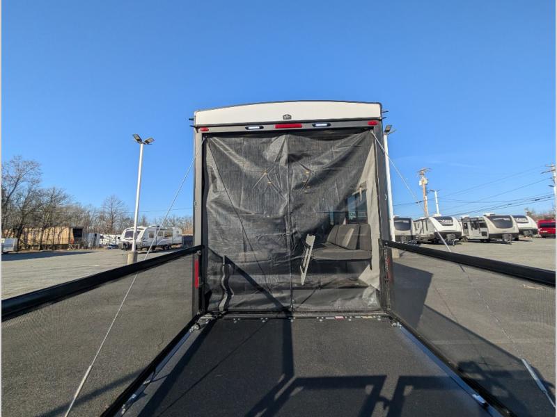 This toy hauler includes everything you need while at the campground. A front private bedroom includes an RV queen bed, dual nightstands and wardrobes plus a third wardrobe to keep your space tidy. The full bath will let you freshen up each day, and there is a convenient medicine cabinet to keep first aid items on hand. A three burner cooktop and microwave oven will be perfect to cook meals with, and there are dual gaucho sofas with a removable dinette table to dine at. Your guests can sleep here at night, along with the queen-size Euro lift bed above!