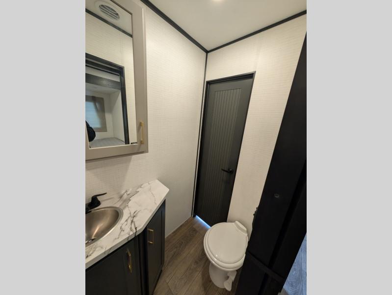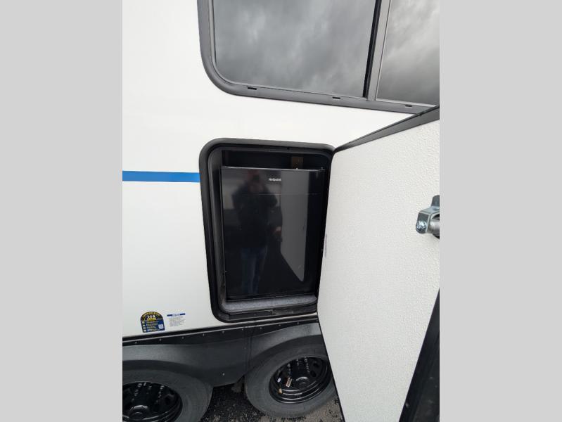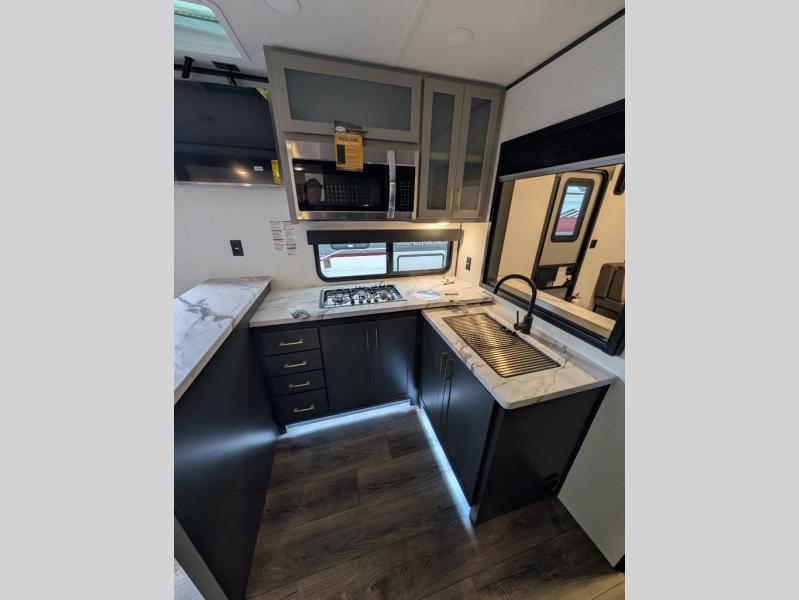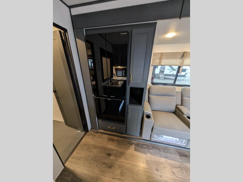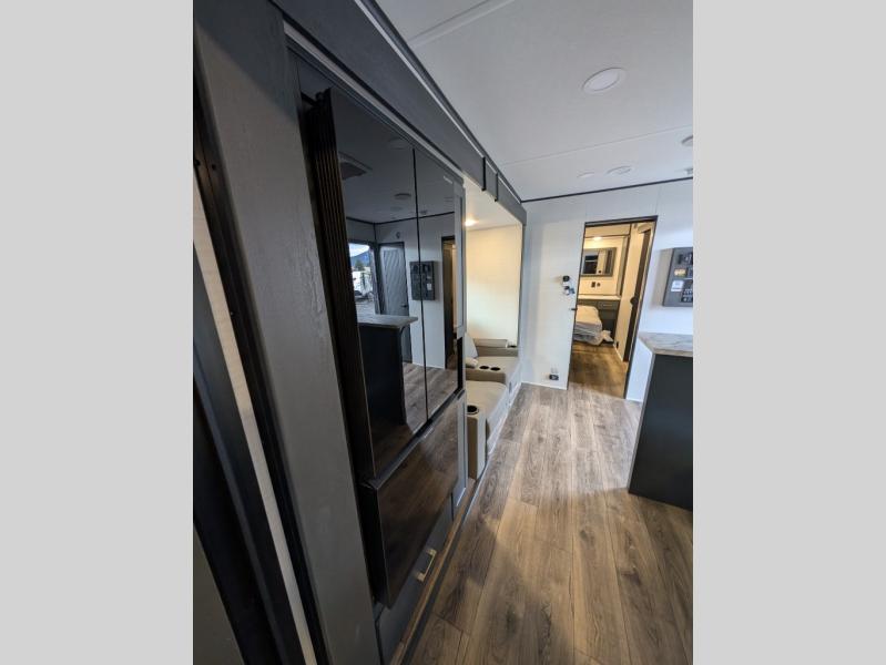 You are sure to love this toy hauler featuring 13' of toy parking space for your favorite ride-on toys, kayaks, or dirt bikes! In the garage area, you will find dual opposing sofas that create a queen bed at night, plus a Euro bed above for more guests to sleep on if needed. There are 5K tiedowns to completely secure your load for travel, and a bar top with two stools to hang out after a ride. Head to the main living/kitchen area to prepare a quick lunch on the three burner cooktop, then relax on the sofa within the slide. The front of this toy hauler master bedroom shares the space with the dual entry bath you are sure to love, plus there is a dresser with a mirror to get ready each day, and TV prep in this space. The exterior has many features you will love like the docking station, the outside TV prep area, power awning, as well as ample storage! The rear ramp can also offer you a 1,500 lb. capacity party deck outdoors to enjoy!