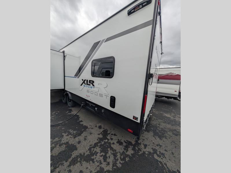 Boost into action camping with one of these Forest River XLR Boost fifth wheel toy haulers or travel trailer toy haulers! The 8' 6" wide body design not only provides ample interior space, but also packs in all of the luxurious features to make your trips great. There is Freon rigid urethane spray foam roof insulation and sidewall construction, along with fiberglass flooring insulation, and roof attic vents within the mandatory Climate Comfort Package so you can camp all year around. The Convenience Package is also mandatory, and includes a tankless water heater, back up camera prep, a 15K BTU main roof A/C, and more features to make each trip accommodating. You will love the decorative vinyl flooring and decorative kitchen backsplash included in the REV Package, as well as a residential style kitchen faucet, a large bath vent fan, and industrial garage flooring that will withstand your many adventures. A Renewable Energy Package includes a 200W roof mounted solar panel for off-grid capabilities, and there is an external fuel cell with a pump that will keep your toys ready to go!