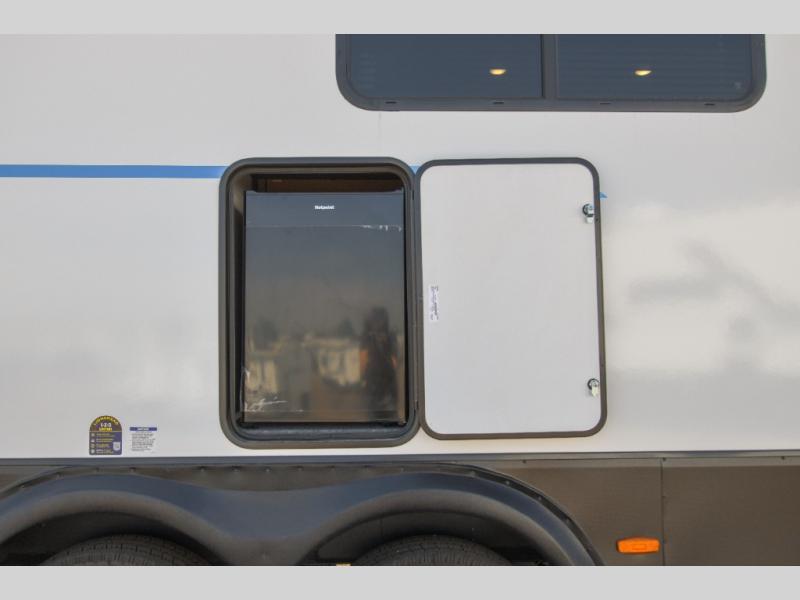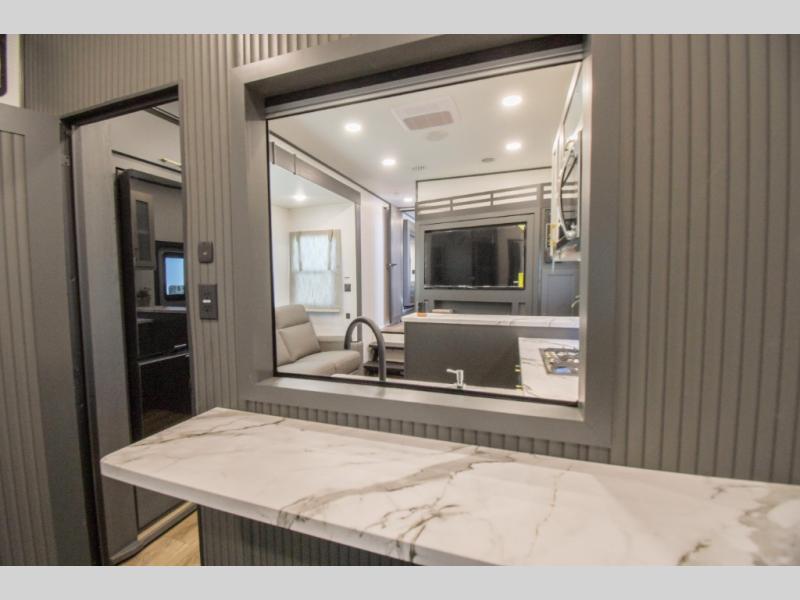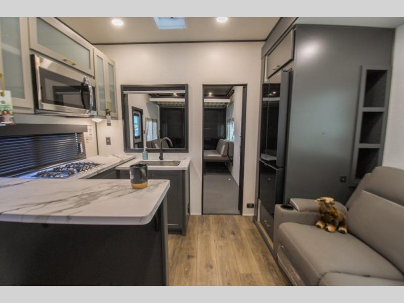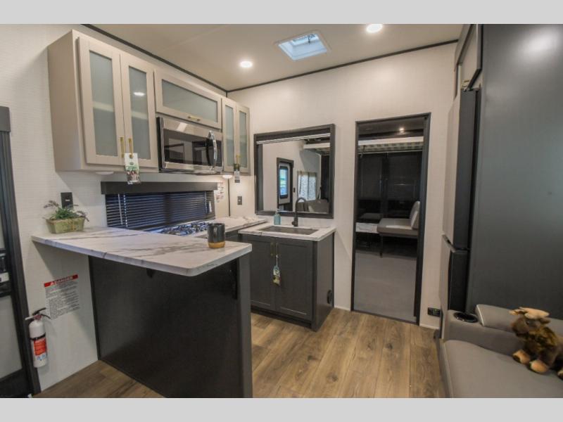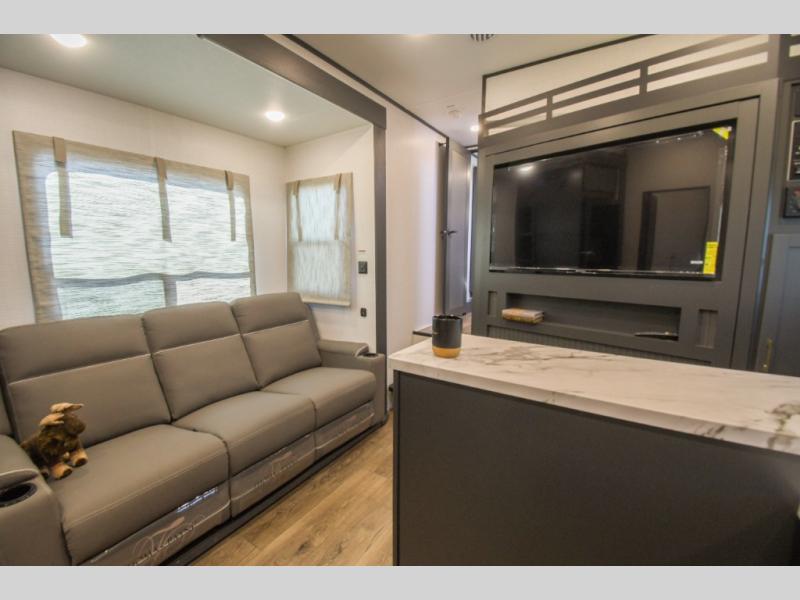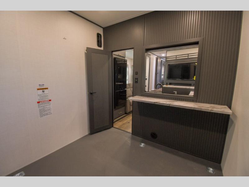 You'll love every minute spent in this double slide out, double entry fifth wheel! Your guests will have the 13' 6" separate garage all to themselves once the toys are unloaded, and here you'll find dual sofa sleepers with a Euro queen bed above. There is also a removable dinette table where you can enjoy a cold drink at when you have the 1,500 lb. capacity patio deck set up! Head to the combined kitchen and living area to relax on the sofa slide out while the cook prepares dinner. There is also a hidden pantry here you are sure to appreciate! The dual entry bath will create a front master bedroom, complete with a queen bed, dual nightstands and wardrobes, plus a wardrobe slide out for added storage and space!