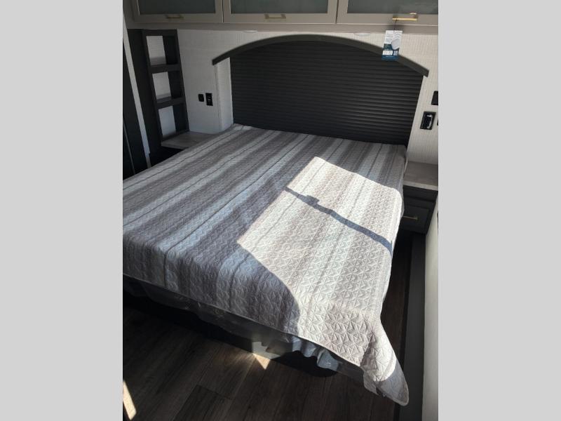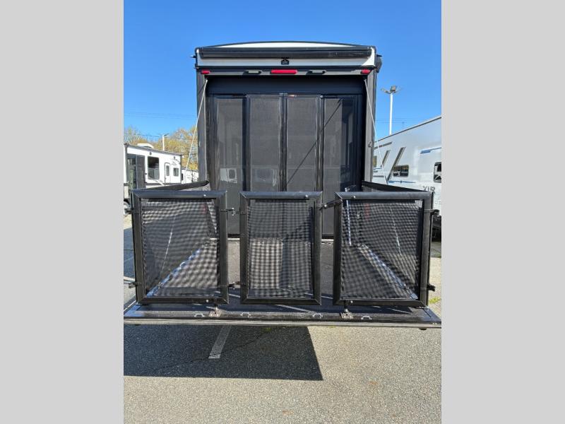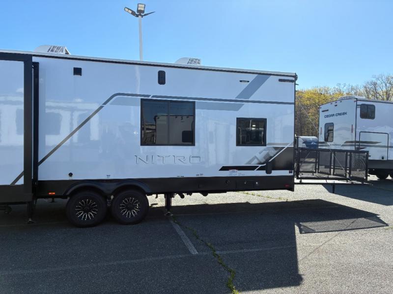 The outdoor enthusiasts has met their match with the XLR Nitro toy haulers by Forest River. The vacuum-bonded aluminum framed sidewalls, gel-coat fiberglass exterior, and singular roof membrane are just a few durable construction materials you will find on these models. There is a weatherproof insulated ramp door, 5,000 lb. cargo tie-downs, a 40 gallon fuel station, and more convenient garage features that will make camping with toys easier than ever. You'll appreciate smooth towing thanks to the MORryde CRE3000 suspension enhancement and 16" Goodyear Endurance tires. A 200 watt roof-mounted solar panel also comes standard, along with electric awning(s) with LED lights, undercarriage lighting, and friction hinge entry door(s). Some of the innovative technology features include a Winegard Air 360 antenna with WiFi prep and 4G LTE, convenient USB charging stations, and a Gear Guardian wireless camera for inside the garage to help keep your gear secure. You will also find diamonds solid surface kitchen countertops, Luna Quartz bathroom countertops, hardwood cabinet doors, stylish window trim package, and many more interior comforts.